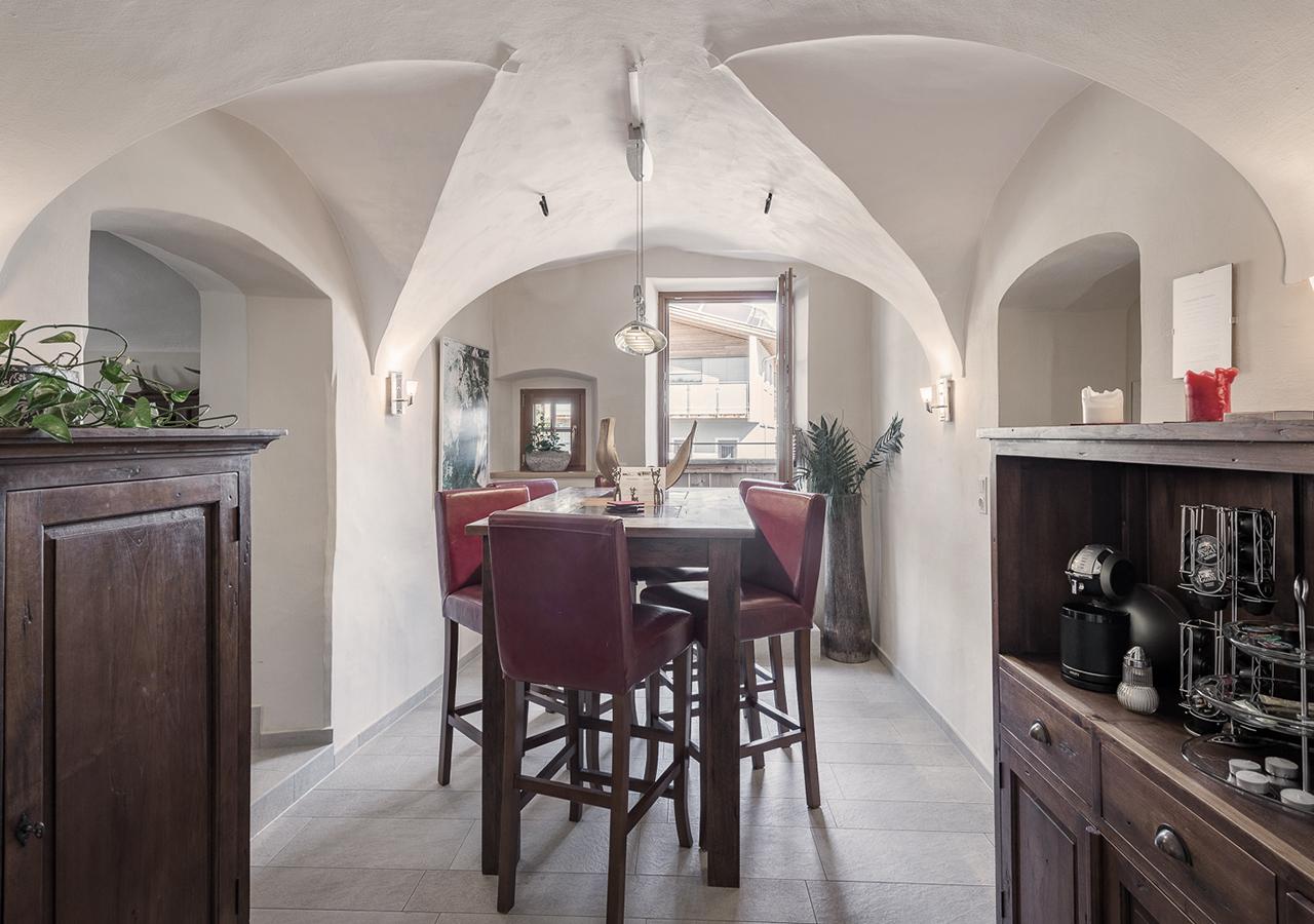 Im Essbereich erwartet Sie ein erhöhter Esstisch mit gemütlichen Lederstühlen und eine Kaffee- und Teebar.