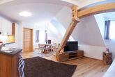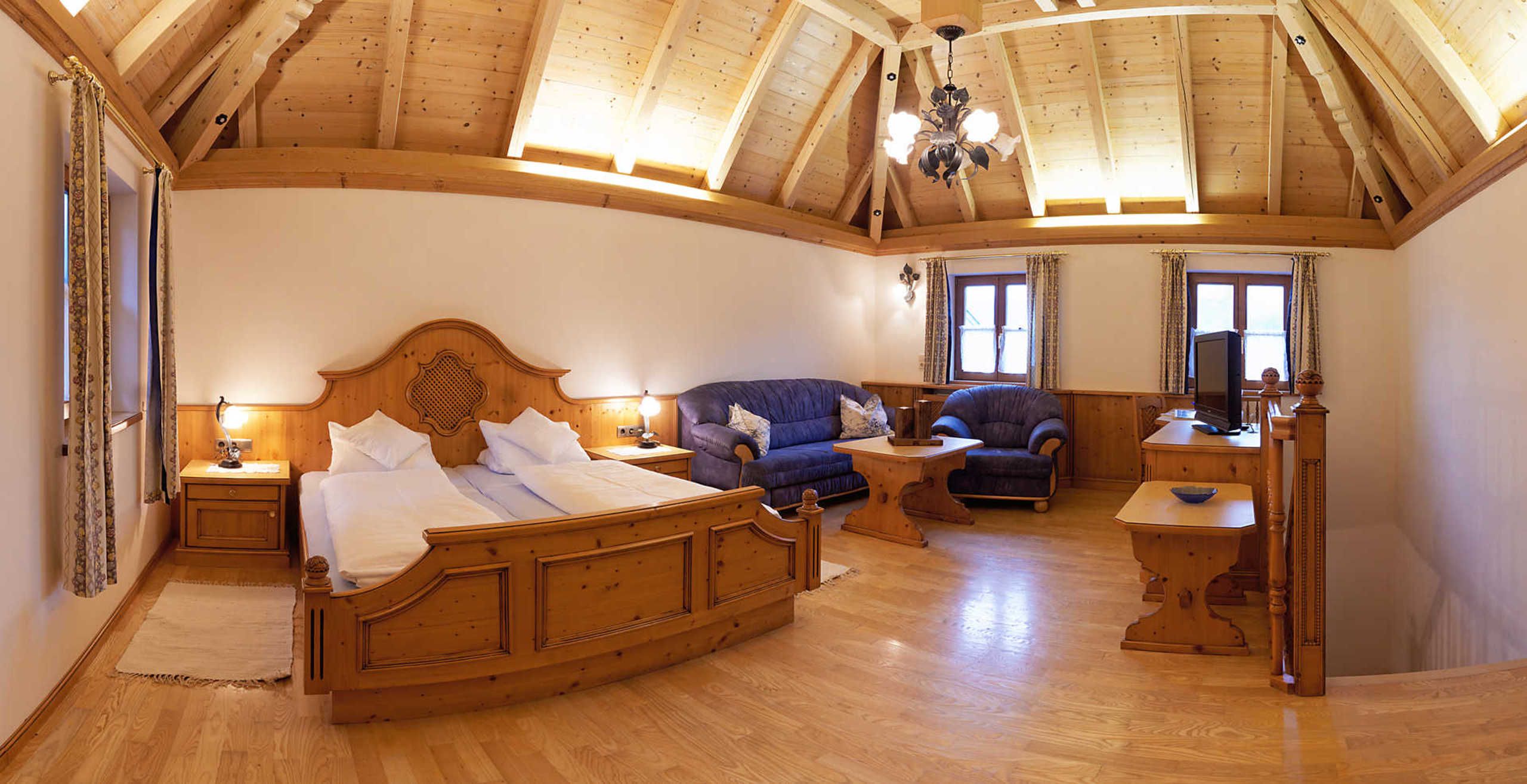 Die 95m² grosse Ferienwohnung Vorderhorn, die sich über 2 Etagen zieht, mit besonderem Ambiente. Sehr geeignet für grosse Familien oder auch für Gruppen bis zu 6 Personen.
