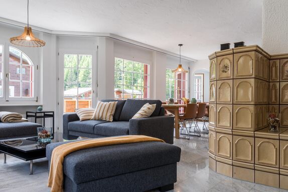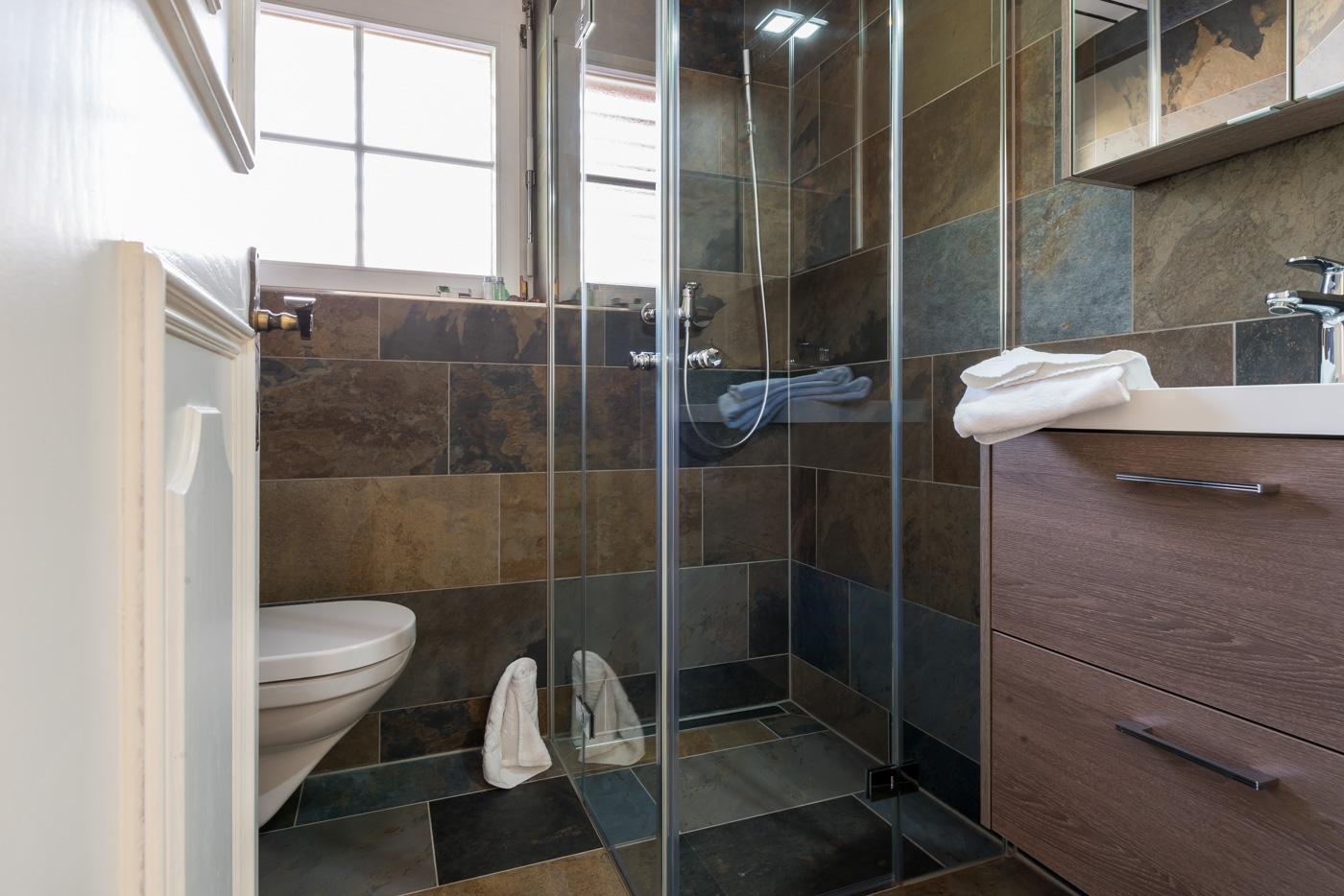 Auf der unteren Etage finden Sie ebenfalls zwei getrennte Schlafzimmer mit je einem trennbaren Doppelbett (insgesamt 180cm breit). Zusätzlich befinden sich hier ein Badezimmer mit DU/WC, ein Badezimmer mit Badewanne sowie ein separates WC. Eine zweite, voll ausgestattete Küche mit Glaskeramikherd mit 4 Platten, Kühlschrank, Gefrierschrank, Backofen, Geschirrwaschmaschine steht ebenfalls bereit. Zudem können Sie hier im grossen Wohnbereich mit grossem Esstisch zusammen Ihre Mahlzeiten geniessen.