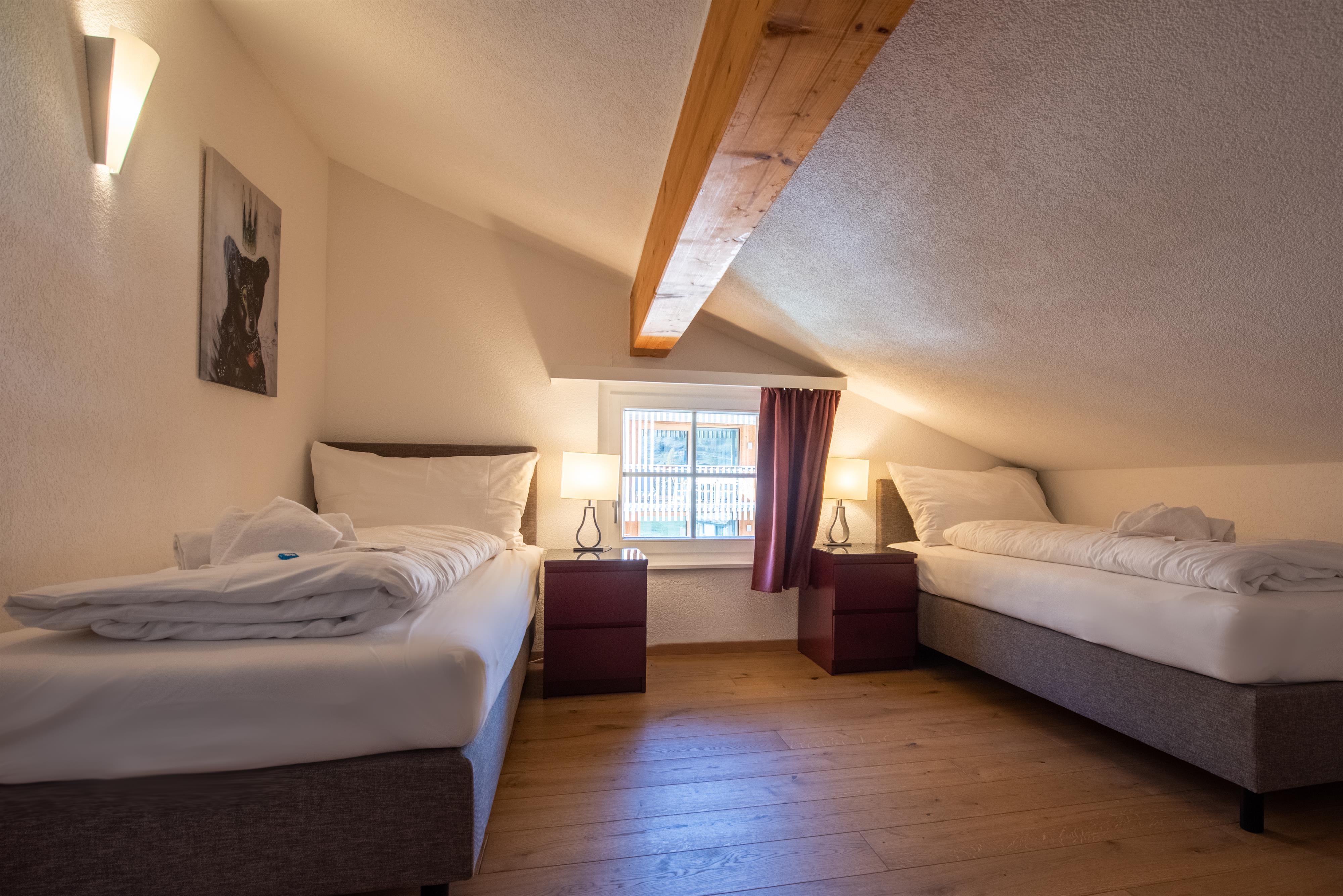 Auf der oberen Etage befinden sich zwei getrennte Schlafzimmer mit je einem trennbaren Doppelbett (insgesamt 180cm breit) sowie ein Schlafzimmer mit 2 Einzelbetten (je 90x200cm). Ebenfalls stehen ein Badezimmer mit DU/WC und Lavabo, eine kleine, ausgestattete Küche sowie ein Essbereich für vier Personen zur Verfügung. Auf dieser Etage hat es einen kleinen Balkon mit Gartenmöbeln.