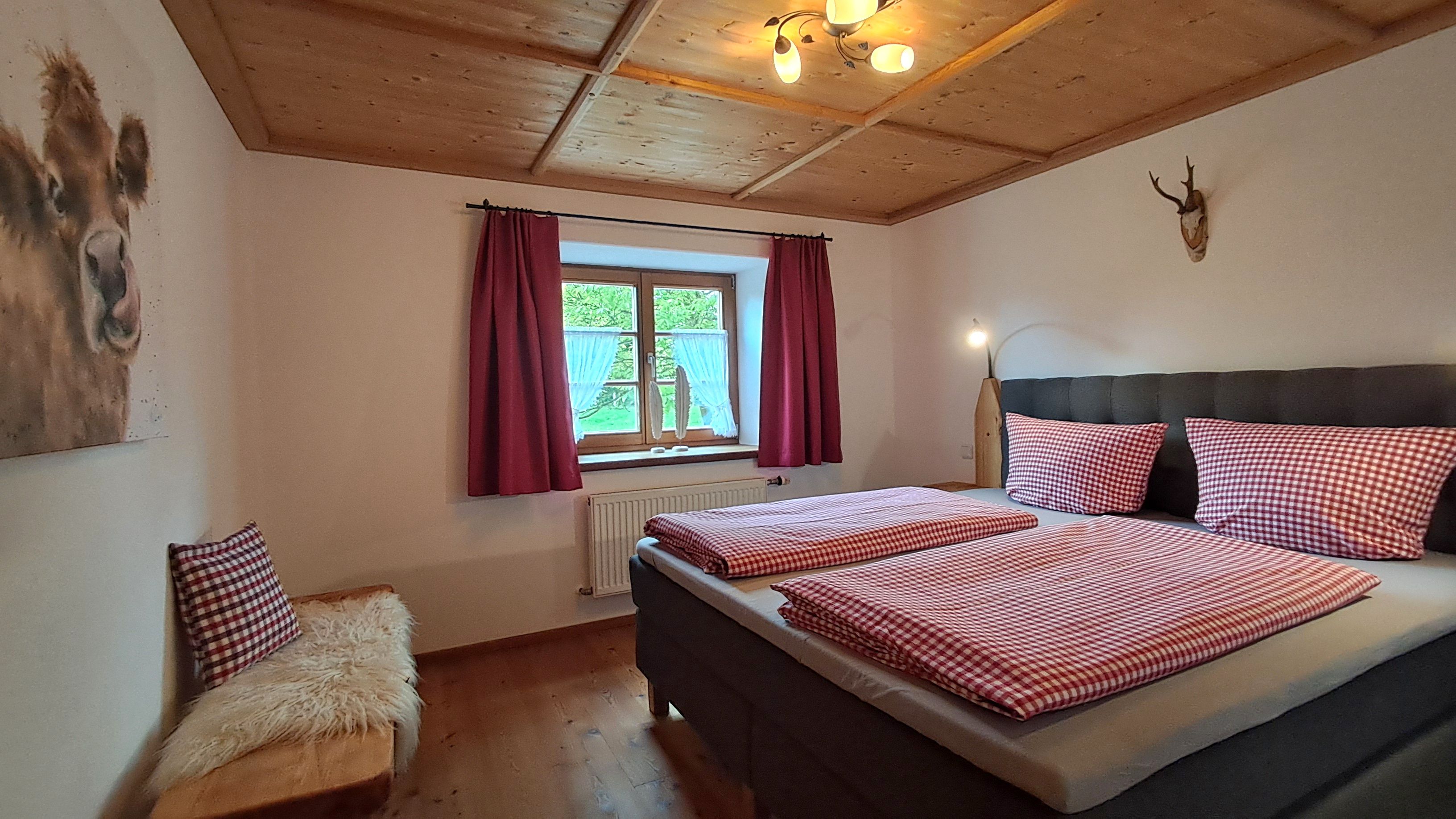 - Schlafzimmer mit Boxspringbett und Bettdecken von unseren eigenen Alpakas