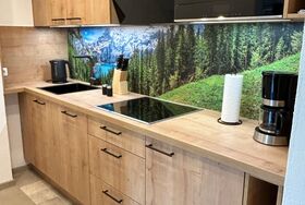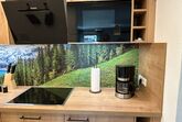 Die licht- und sonnendurchflutete Ferienwohnung Watzmann besitzt einen extra großen Ost-(Morgensonne) und Südbalkon (Mittagssonne) . Darüber hinaus können Sie im Erdgeschoß eine einladende Terrasse zum Entspannen nutzen. Im offenen Wohnbereich lädt eine gemütliche Couch und ein großer Flachbild-TV (50 Zoll) zum Verweilen ein. Die mit Fußbodenheizung versehene Küche ist mit hochwertigen Geräten voll ausgestattet. Sie verfügt über ein Ceranfeld, Dunstabzugshaube, Spülmaschine, Kühlschrank mit Tiefkühlfach und einer Mikrowelle mit Grillfunktion. Ebenso enthält sie Kaffeemaschine, Wasserkocher und Toaster. Das Schlafzimmer ist durch eine massive Schiebetür vom Wohnbereich abgetrennt, verfügt über ein Kingsize-Bett (180 x 200 cm) und einen Kleiderschrank. Für einen besseren Schlafcomfort sorgen lichtdichte Wabenplissees an Fenster und Balkontür. Im Badezimmer befindet sich eine Fußbodenheizung, eine große Duschkabine mit Regendusche, eine Handtuchheizung sowie WC und Waschtisch. Kostenloses WLAN ist im gesamten Wohnbereich verfügbar.
