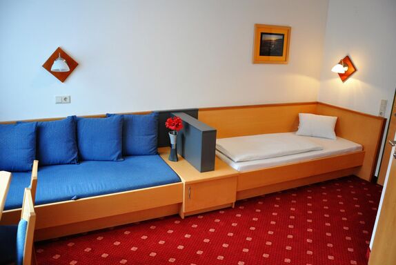 Ein schönes Einbettzimmer (zweites Bett als Liege) oder für 2 Personen mit getrennten Betten, Safe, Haarfön, Kosmetikspiegel, Schreibtisch, W-Lan, Internetanschluß und Kabel Flat-TV. Mit Balkon