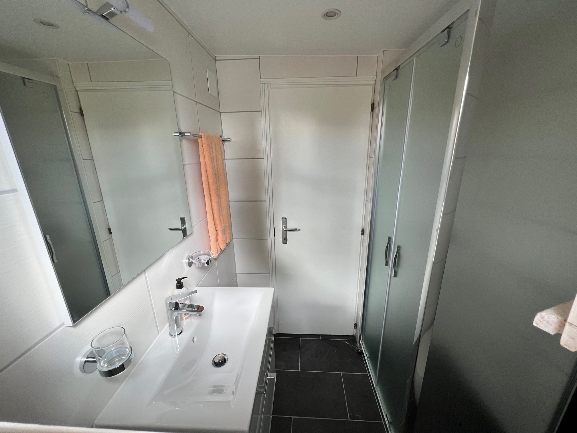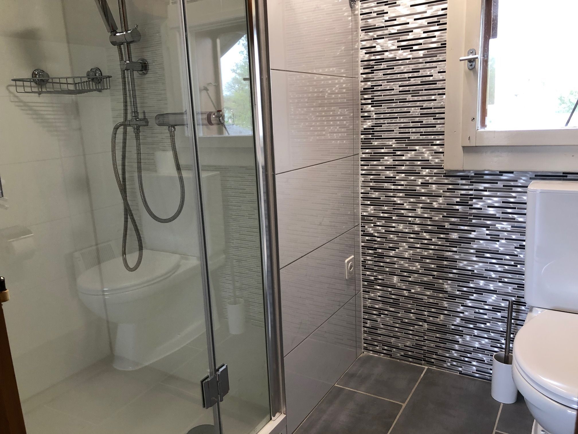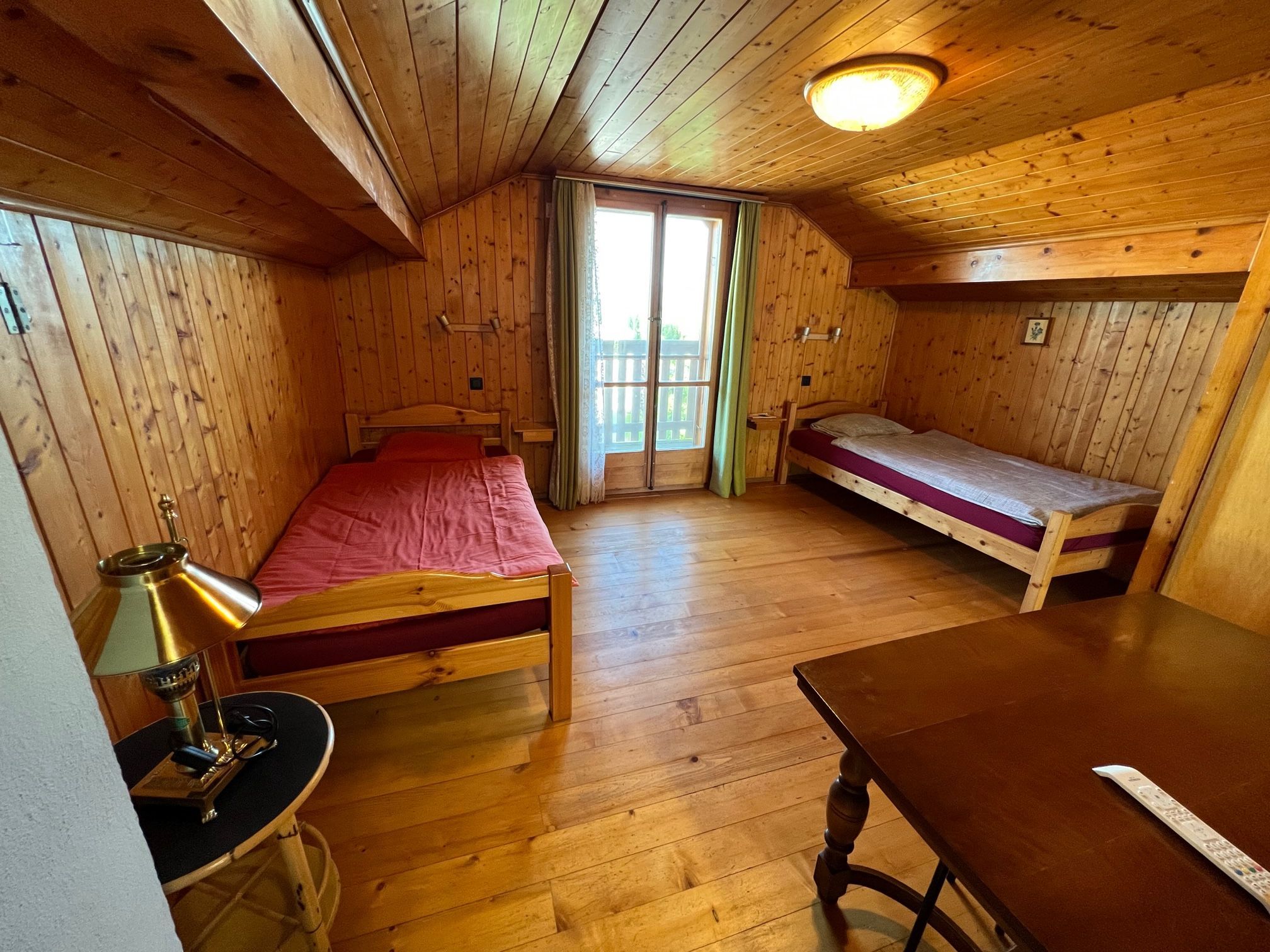 Das Innere des Chalets ist auf Ihren Komfort ausgerichtet und erstreckt sich über zwei Etagen, die viel Platz und Privatsphäre bieten. Im ersten Stock finden Sie ein gemütliches Schlafzimmer mit zwei Einzelbetten, ergänzt durch einen offenen Wohnbereich mit Wohnzimmer, Esszimmer und Küche für gemeinsame und gesellige Momente. Ein WC mit Dusche ist ebenfalls vorhanden, ebenso wie eine überdachte Terrasse mit Gartentisch und -stühlen, die ideal für Mahlzeiten im Freien ist. Die zweite Etage beherbergt ein geräumiges Schlafzimmer mit drei Einzelbetten und ein zweites WC mit Dusche, das über eine Außentreppe erreichbar ist und Privatsphäre und Komfort für alle Gäste garantiert.