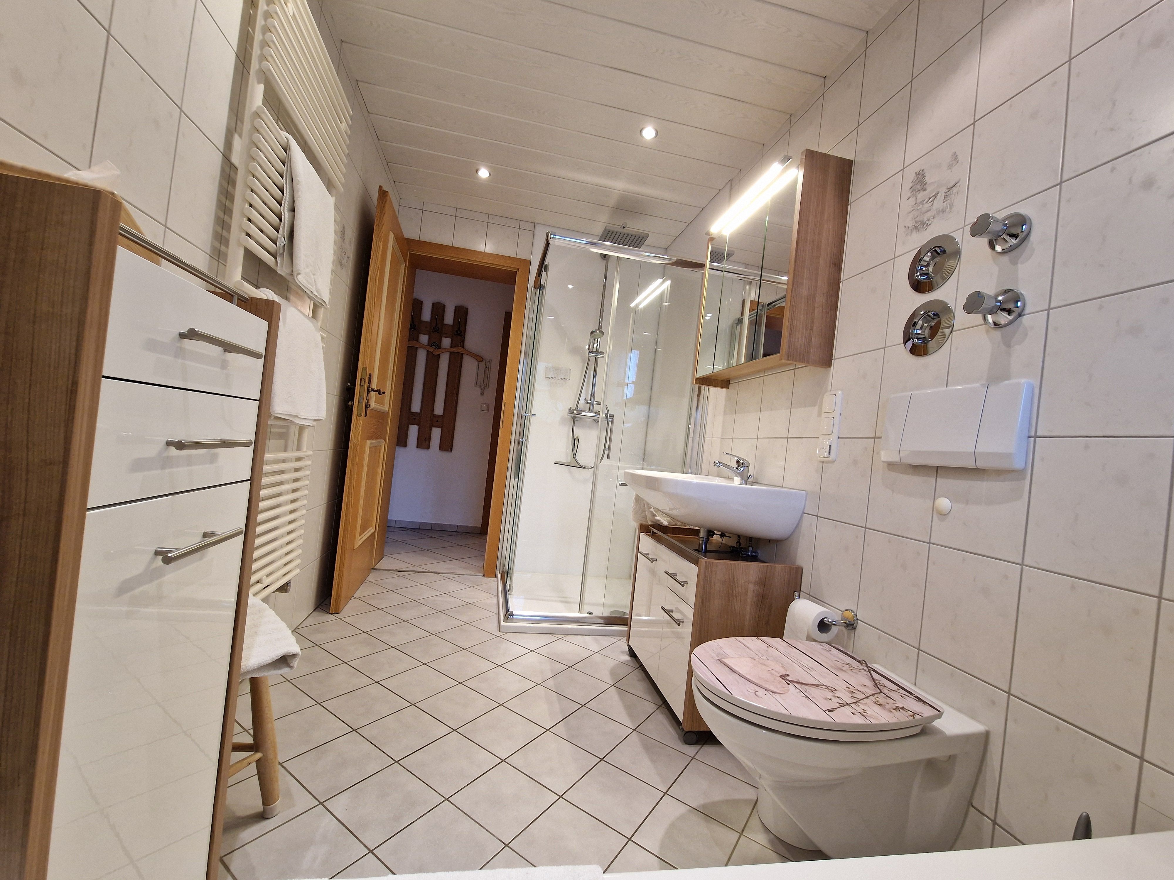 Neue, komfortable FeWo (Nichtraucher) im Landhausstil mit gemütlichem Wohnraum, Eßecke, Ausziehcouch (SAT-TV) und Balkon (Süd-West) mit herrlichem Ausblick auf die umliegende Bergwelt, volleingerichteter Küchenzeile, schönem Schlafzimmer und Bad mit Dusche.Waschmaschine, Wäschetrockner und Bügeleisen zur Mitbenutzung möglich.