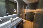 Eine ebenerdige Dusche, mit WC, großem Waschbecken und Spiegel mit integriertem Kosmetikspiegel runden die Wohnung ab.