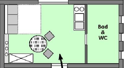 RAUMAUFTEILUNG: Im mit einem komfortablen Ausziehbett ausgestatteten Wohn- Schlafbereich befindet sich eine kleine, komplett ausgestattete Kochnische, Esstisch, Schrank, Garderobe und Flachbild SAT-TV. Im großzügig ausgestatteten Badezimmer gibt es WC, Dusche, Waschtisch und einen Handtuchtrockner.