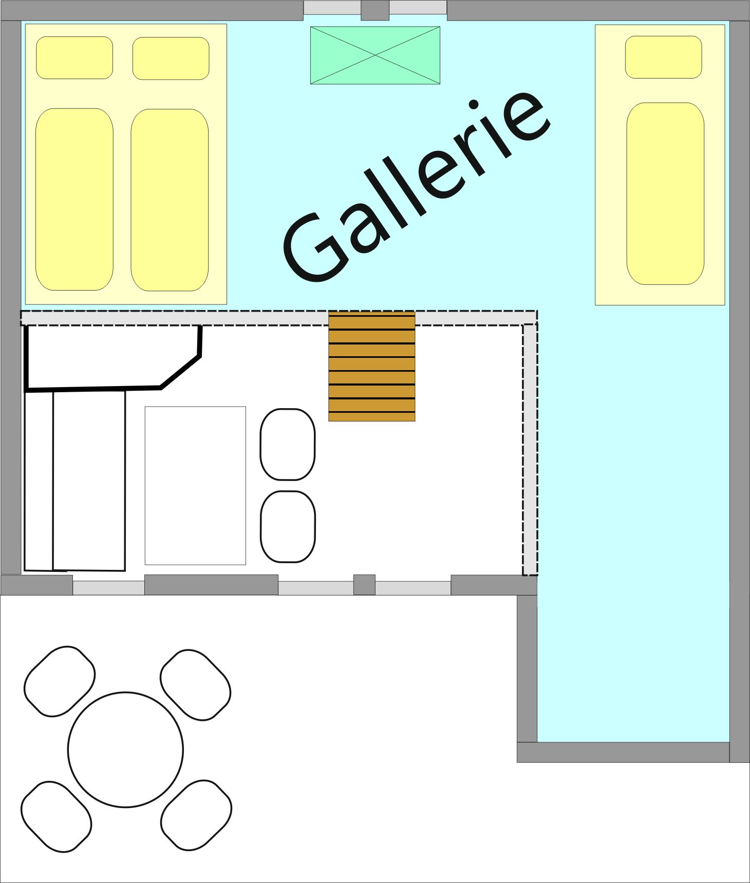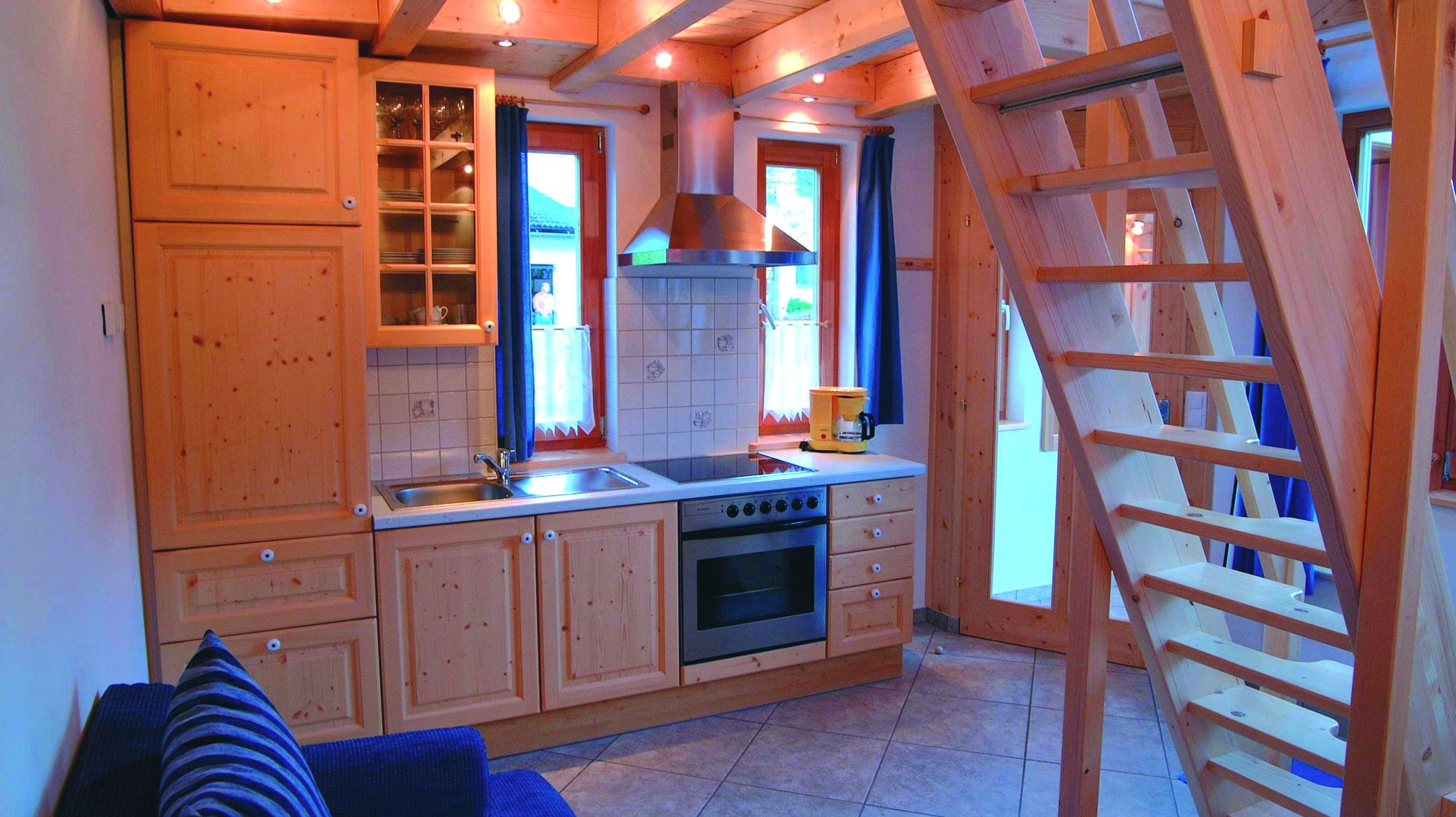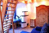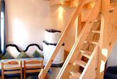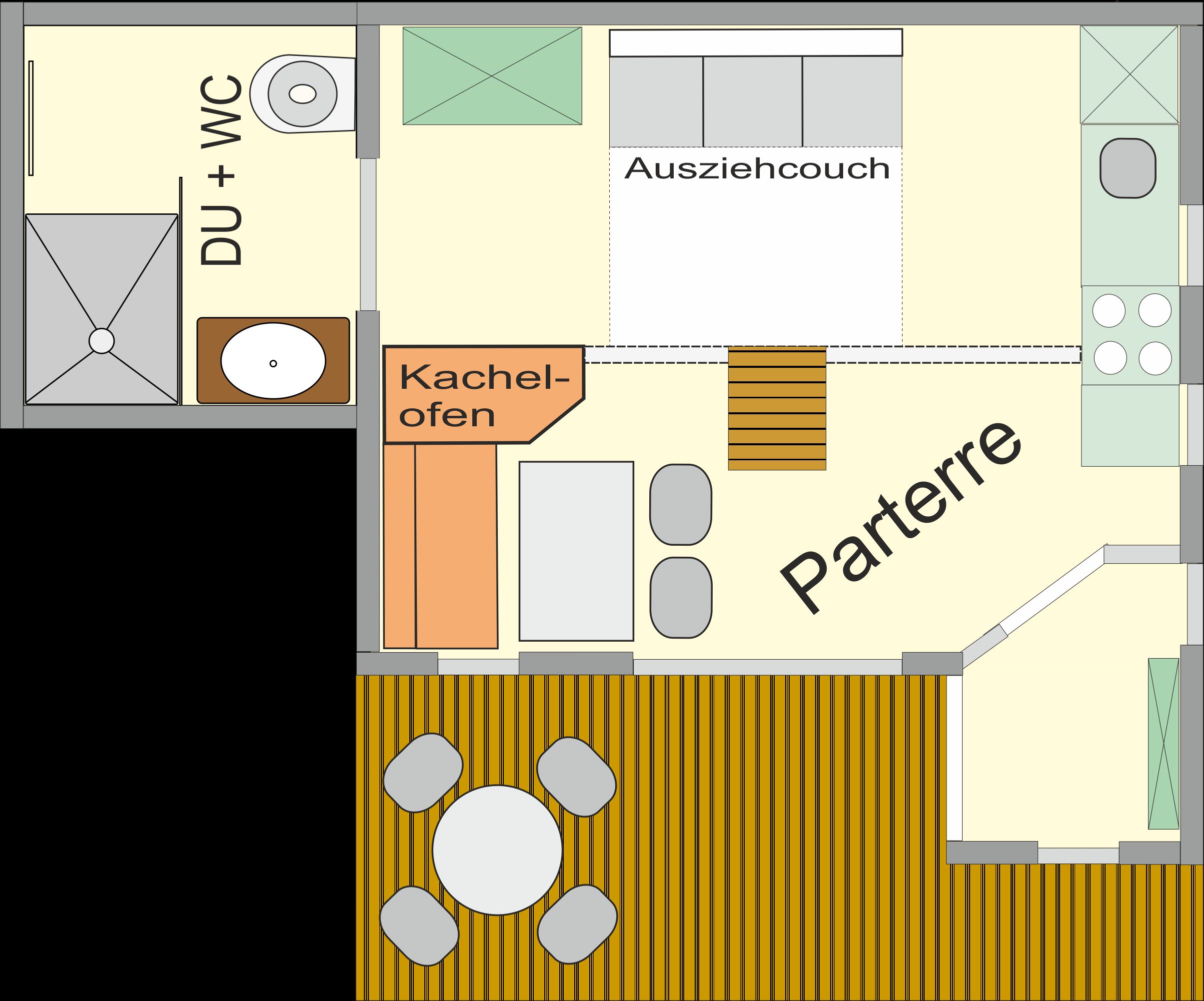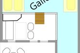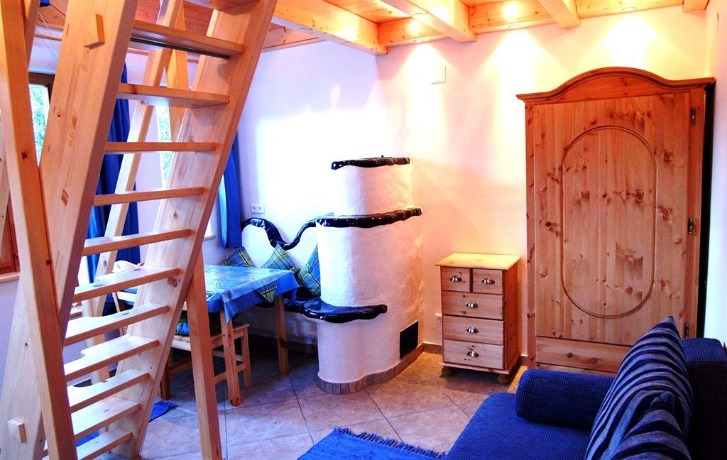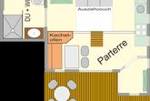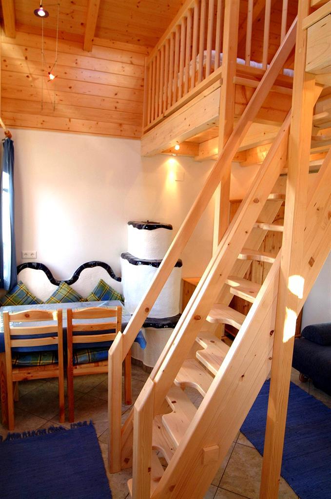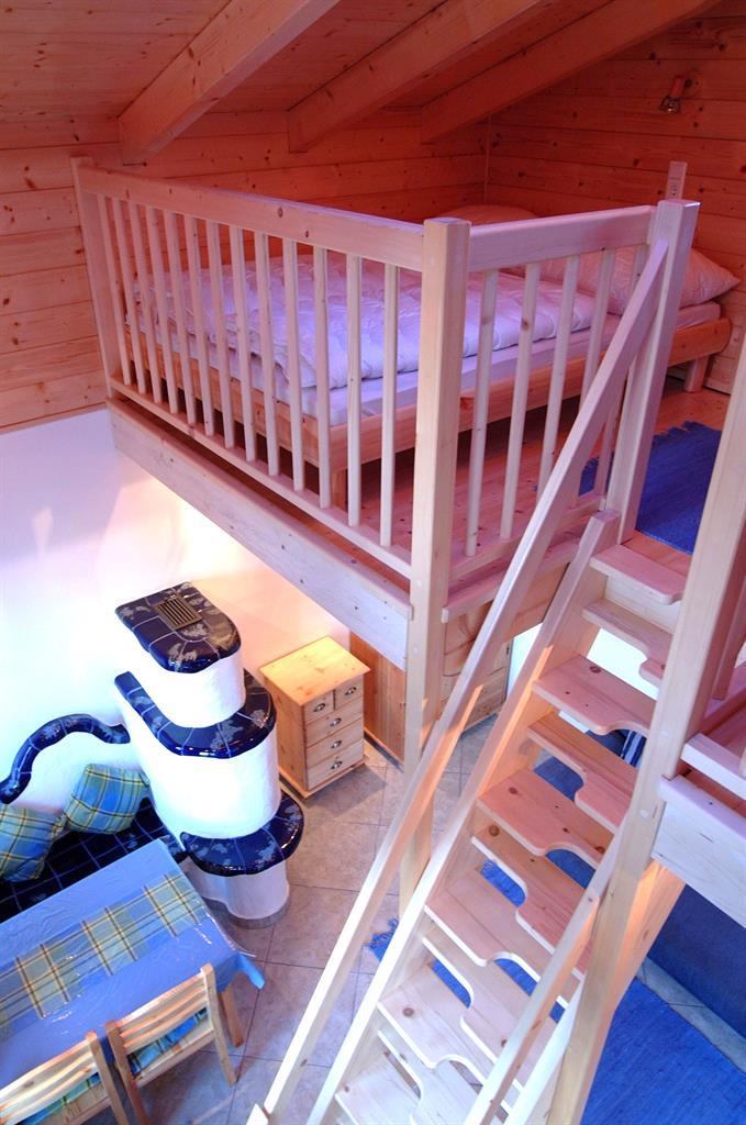RAUMAUFTEILUNG: Im Parterre befinden sich ein Vorraum, eine komplett ausgestatteten Kochnische, eine gemütlichen Essecke, eine Wohn-Schlafcouch (2 Bett), 50 Zoll Großbild-TV, ein heimeliger kleiner Kachelofen der bei Bedarf elektrisch beheizt werden kann, ein komfortables Badezimmer mit Dusche und WC mit Fußbodenheizung + Handtuchtrockner. In der über eine kleine Treppe erreichbaren Galerie befinden sich ein Doppelbett, ein Einzelbett und ein kleiner begehbarer Abstellbereich.