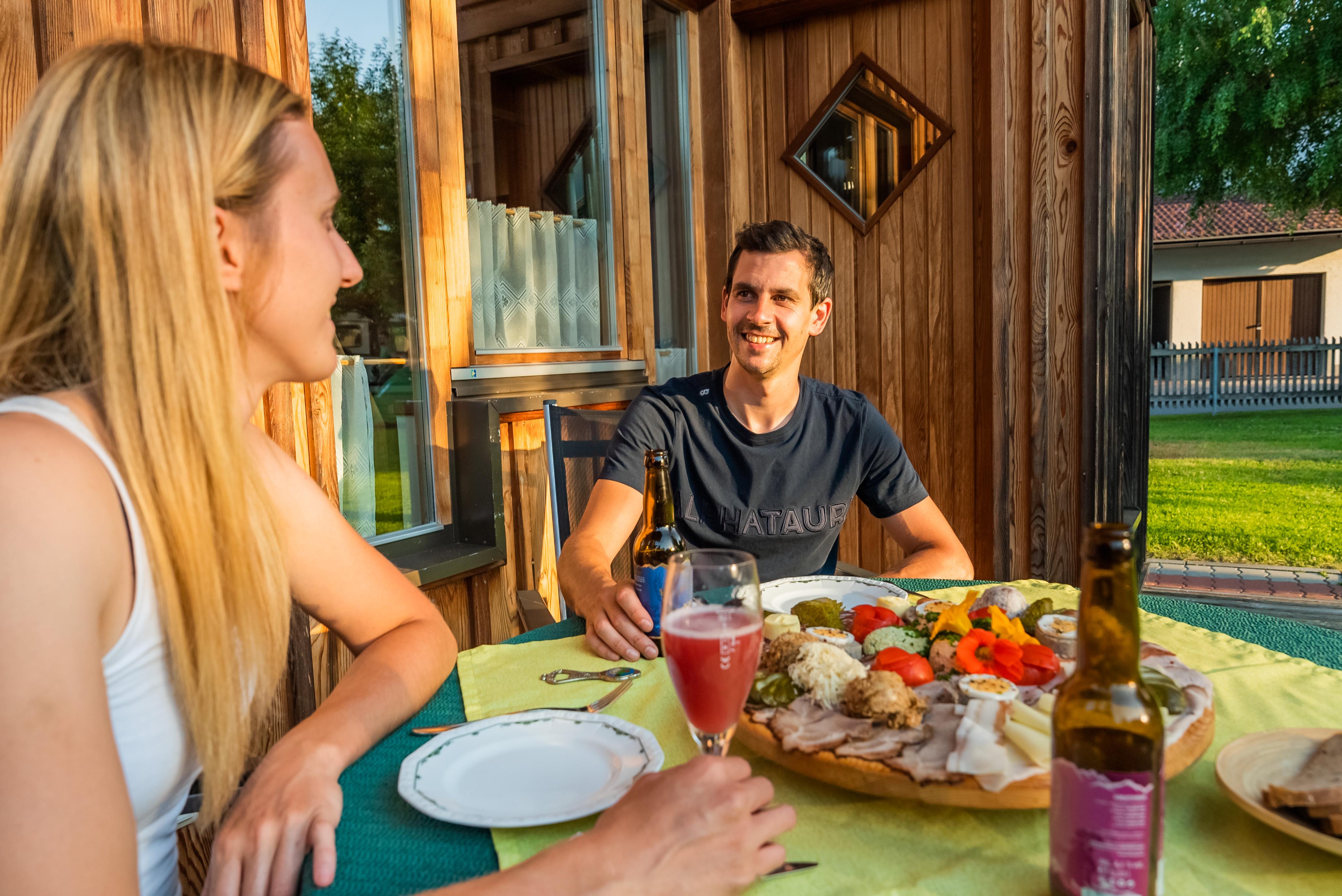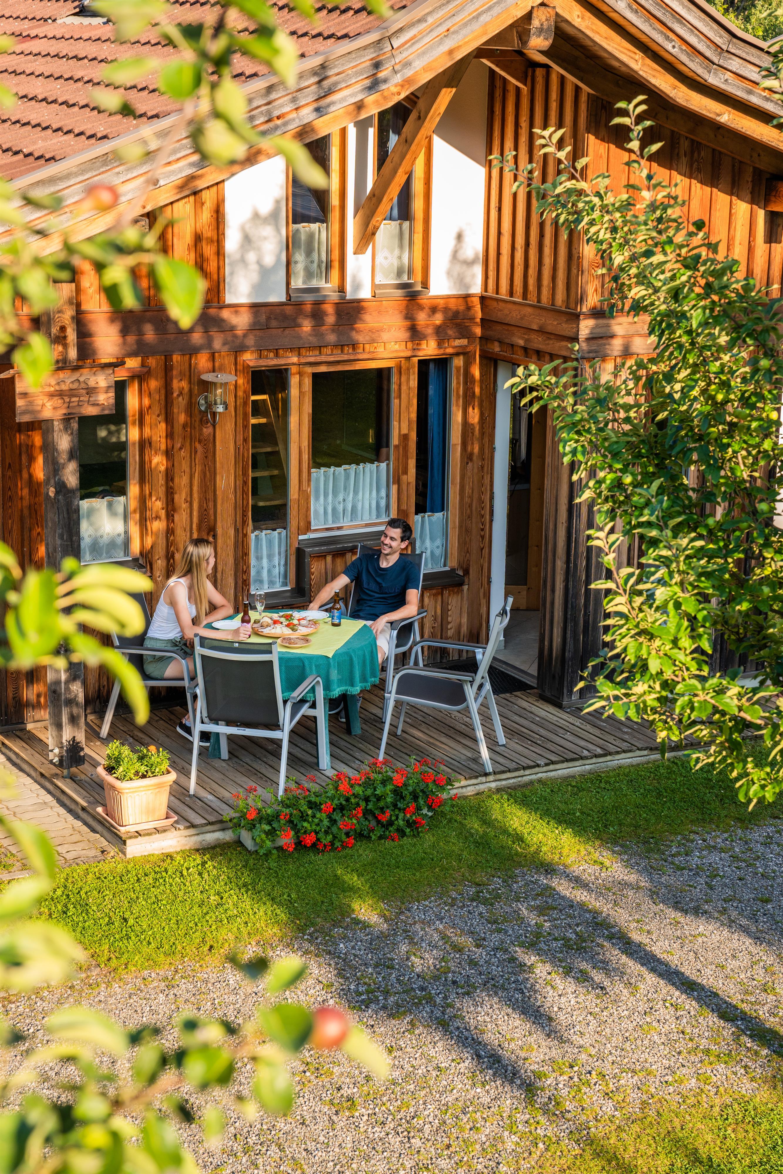 Vorgelagert befindet sich eine überdachte Veranda mit Esstisch und Stühlen und ein direkt neben der Ferienhütte befindlicher Autoabstellplatz.