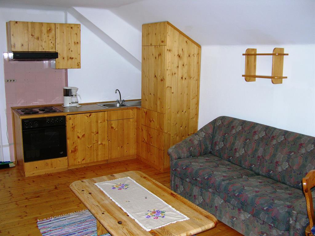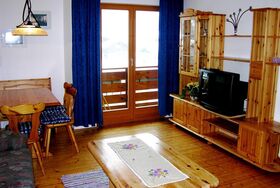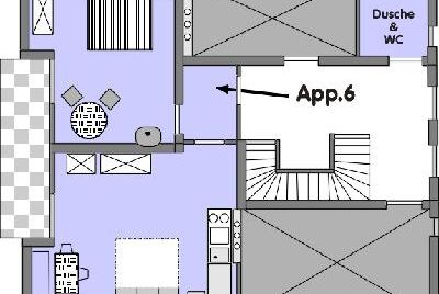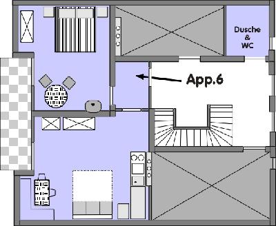 RAUMAUFTEILUNG: Da es auf dieser Etage keine weiteren Räumlichkeiten gib, kann der großzügige Stiegenhausbereich auf dieser Etage für Schuhe und Gepäck mitbenutzt werden. Das Appartement besteht aus einem Schlafzimmer mit einem Doppelbett, einem Wohn- Schlafbereich mit einem komfortablen Ausziehbett eine kleine, komplett ausgestattete Kochnische, Essecke + SAT-TV. Ein Vorraum, ein vorgelagertes Badezimmer mit Dusche und WC und ein kleiner nach Süden ausgerichteter Balkon.