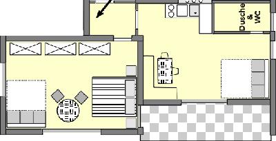 RAUMAUFTEILUNG: Das Appartement besteht aus einem großen Schlafzimmer mit einem Doppelbett und einem komfortablen Ausziehbett, einem Wohn- Schlafbereich ebenfalls mit einem komfortablen Ausziehbett eine komplett ausgestattete Kochnische, Essecke + SAT-TV. Ein Vorraum, ein Badezimmer mit Dusche und WC und eine großzügige nach Süden gelegenen Terrasse mit einer Größe von ca. 4 x 2,5 Metern.