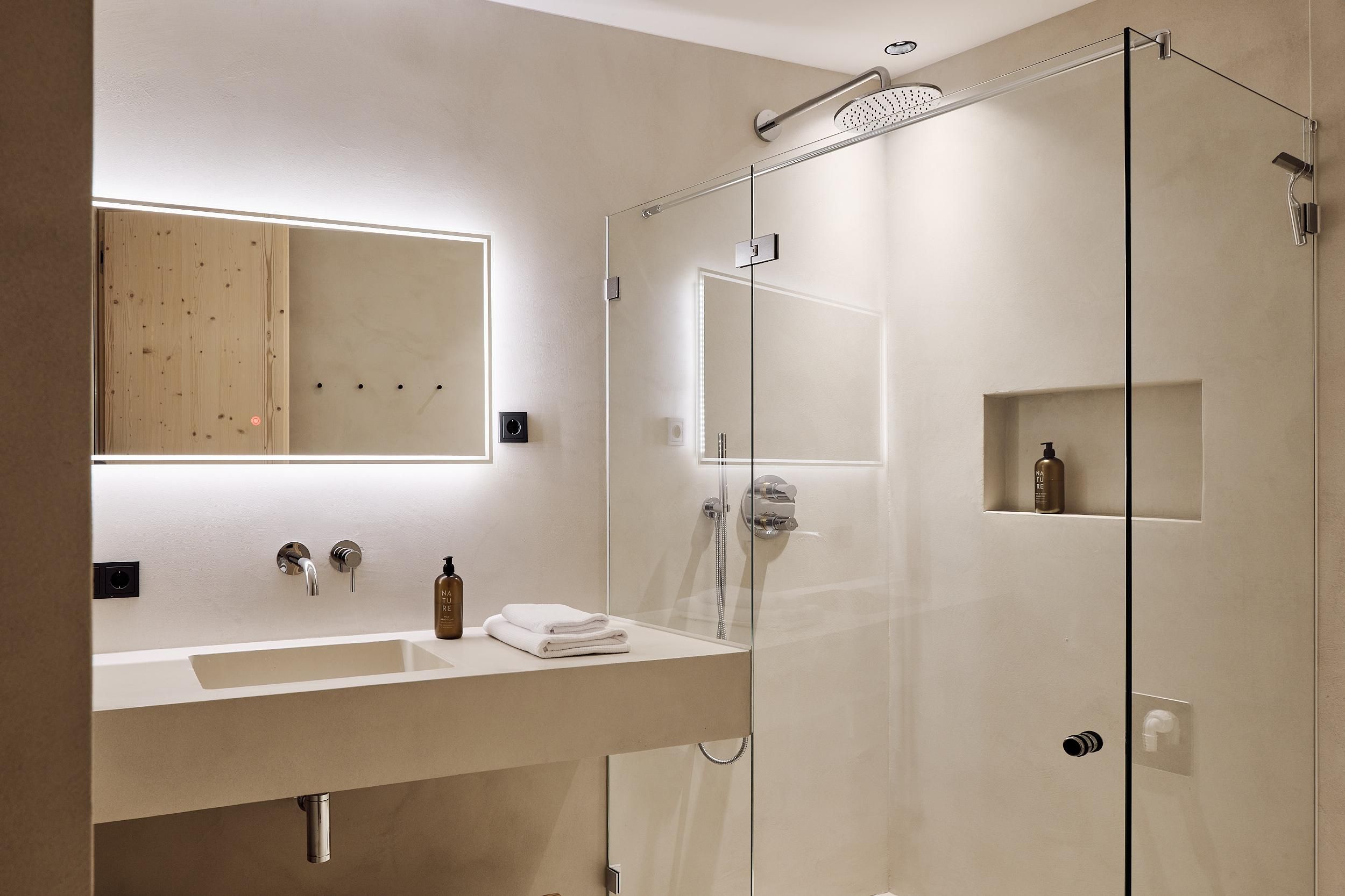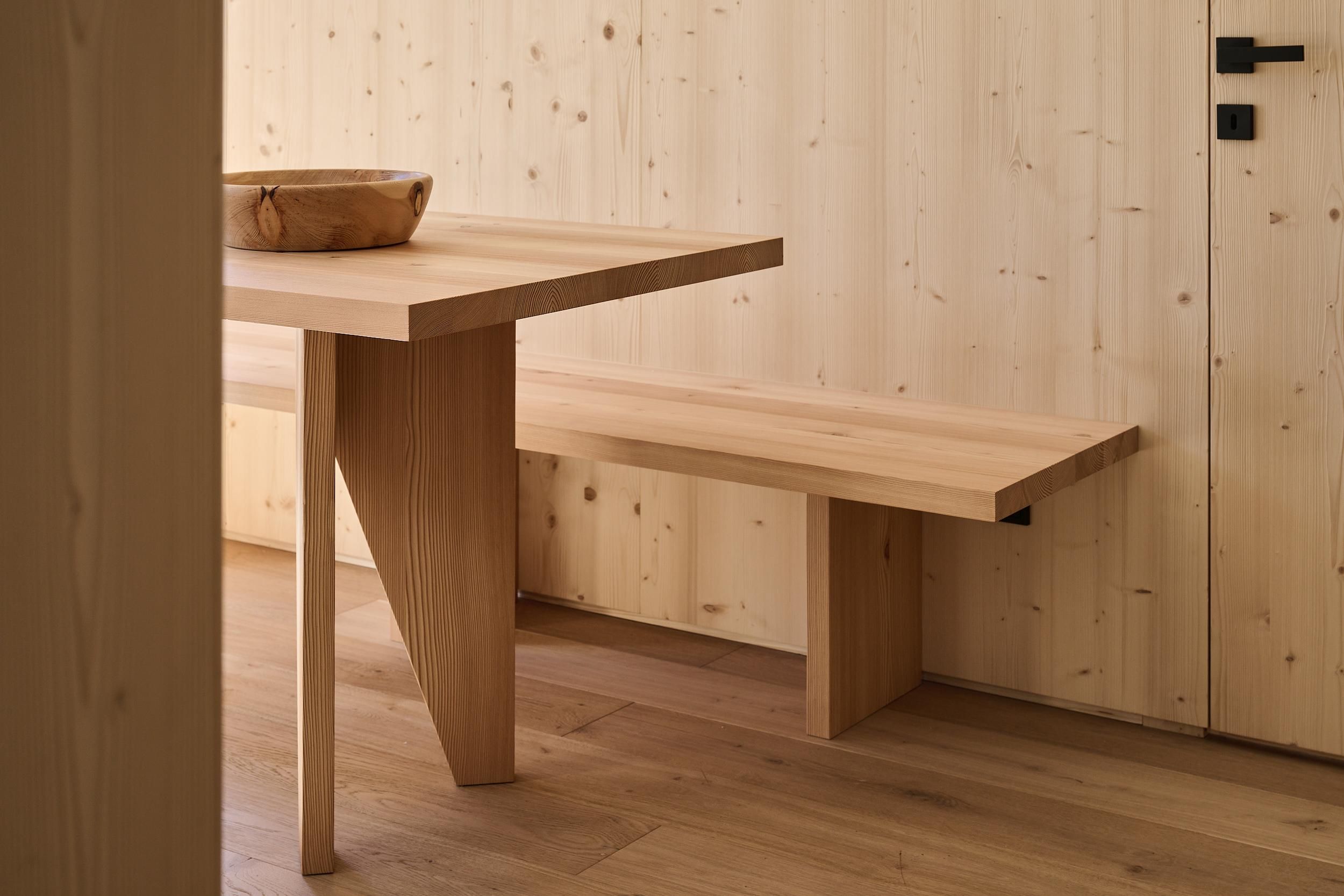 Ein besonderes Highlight ist der Spa-Bereich im Dachgeschoss mit Saunen und beheiztem Panorama-Whirlpool aus Edelstahl (35 °C) mit Blick auf die Stubaier Bergwelt. Alle Möbel wurden von lokalen Tischlern gefertigt, das Holz stammt aus dem eigenen Wald.