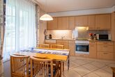Offene Küche mit angrenzender Essecke, Fenster und Dampfabzug, mit 4-Platten Glaskeramikherd,