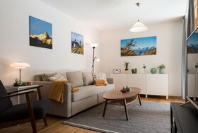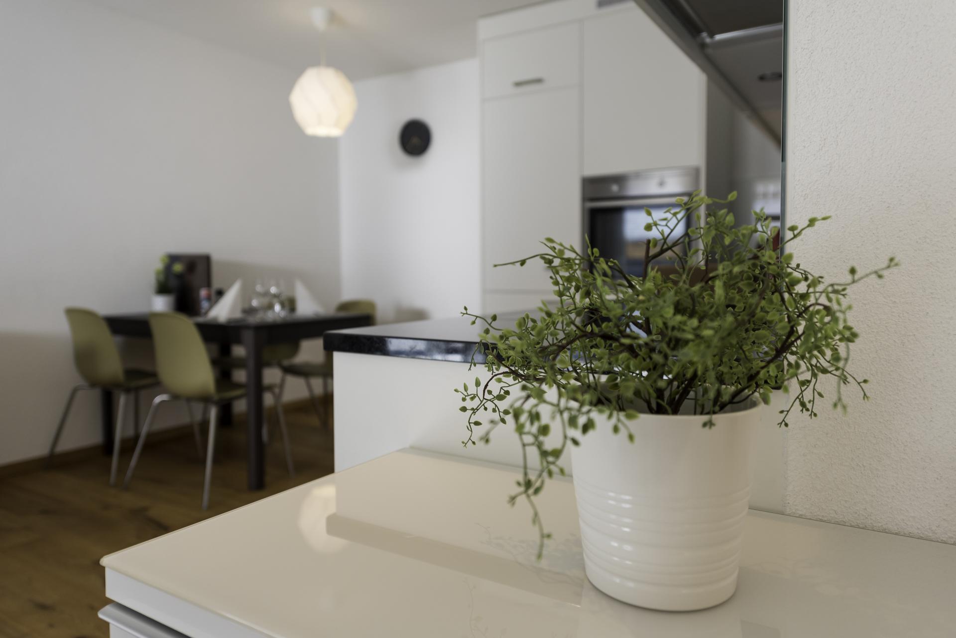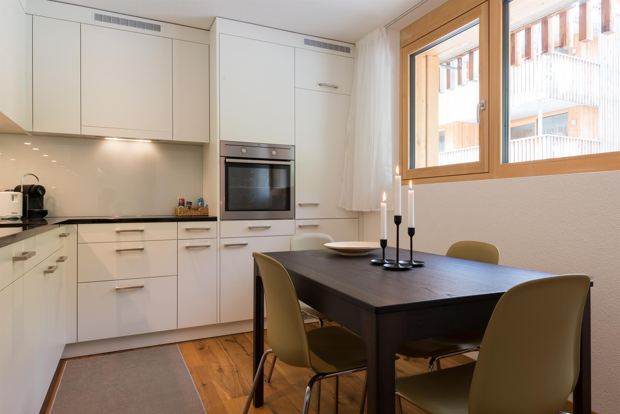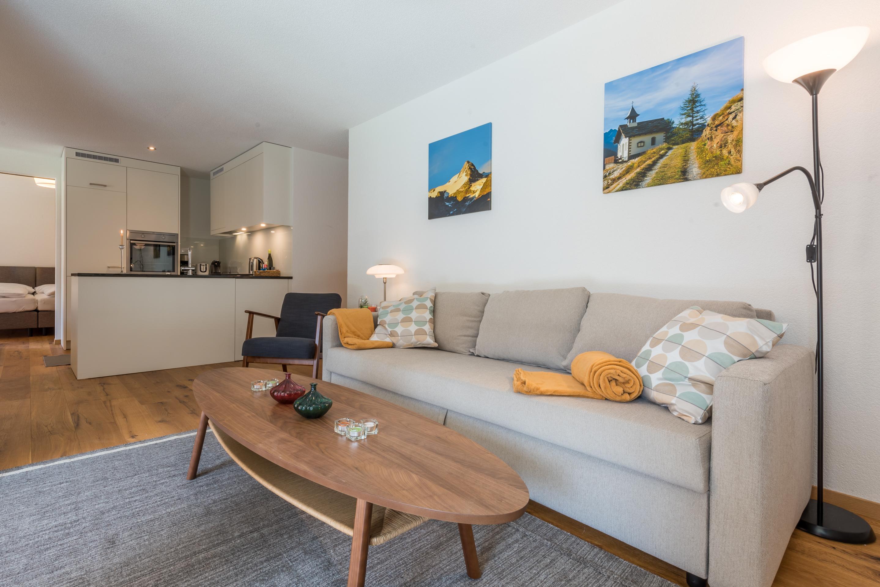 Das moderne Apartment mit 1 Schlafzimmer und 1 Badezimmer für 2-3 Personen ist komfortabel und liebevoll ausgestattet. Das getrennte Schlafzimmer verfügt über ein Doppelbett. Im Wohnbereich kann das Schlafsofa (140cm breit) zusätzlich für eine Person benutzt werden. Das Badezimmer (mit DU/WC) sowie die offene Küche sind komplett ausgestattet. Auf dem Balkon mit Gartenmöbeln können Sie entspannt verweilen. Gratis top Highspeed-WLAN, ein eigener Parkplatz vor dem Haus (kostenlos), einen Ski- und Bikeraum mit eigenem, abschliessbarem Spint sowie eine Waschküche (kostenpflichtig) zur gemeinsamen Nutzung im Untergeschoss des Hauses runden das Angebot ab.