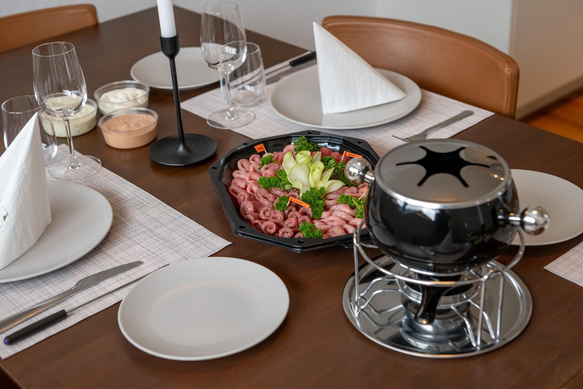 feine Fleisch- und Käsefondues direkt in Ihrer Unterkunft. Geniessen Sie ein delikates Fondue Chinoise oder Gletscher Fondue mit frischem, hochwertigem Fleisch von der heimischen Metzgerei (je CHF 49.- pro Person). Oder ein feines Käsefondue (pro 2 Personen CHF 39.-) von der regionalen Schaukäserei und einem frischen Bauernbrot aus unserer hauseigenen Bäckerei. Fragen Sie uns!