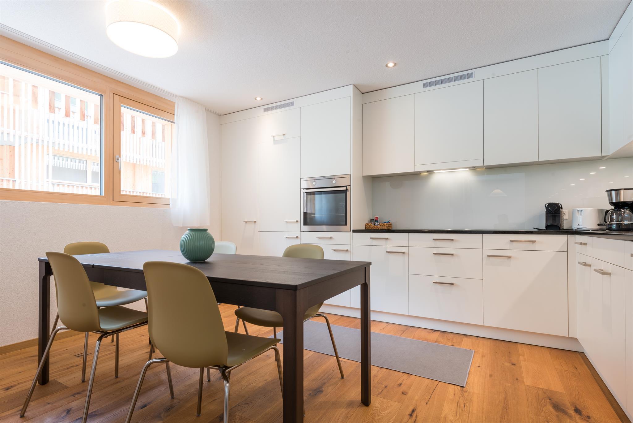 Die moderne Apartment mit 2 Schlafzimmern und 1 Badezimmer für 4-5 Personen ist komfortabel und liebevoll ausgestattet. Die zwei getrennten Schlafzimmer verfügen über je ein Doppelbett. Im Wohnbereich kann das Schlafsofa (140cm breit) zusätzlich für eine Person benutzt werden. Das Badezimmer (mit DU/WC) sowie die offene Küche sind komplett ausgestattet. Auf dem Balkon mit Gartenmöbeln können Sie entspannt verweilen. Gratis top Highspeed-WLAN, ein eigener Parkplatz vor dem Haus (kostenlos), einen Ski- und Bikeraum mit eigenem, abschliessbarem Spint sowie eine Waschküche (kostenpflichtig) zur gemeinsamen Nutzung im Untergeschoss des Hauses runden das Angebot ab.
