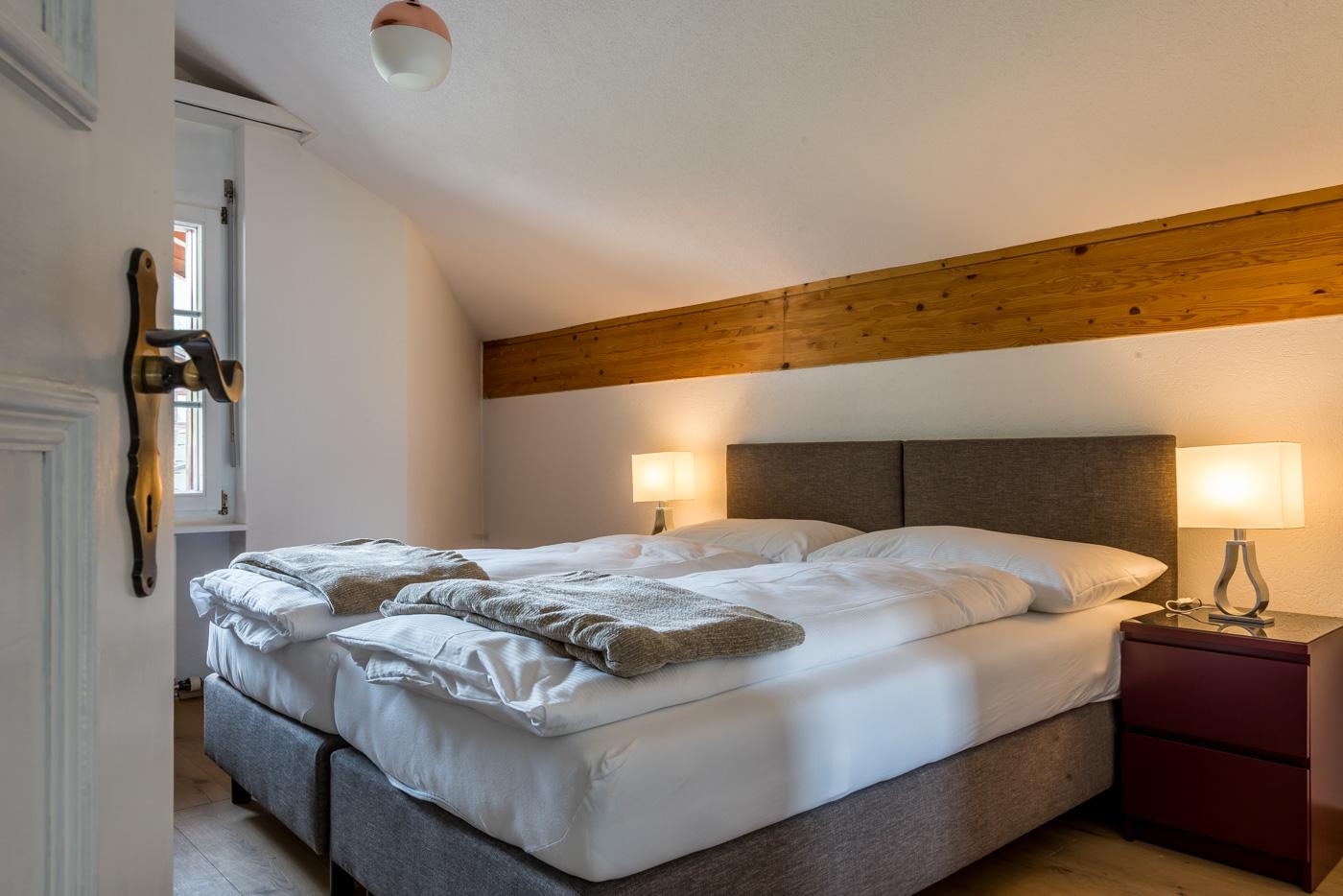 Auf der oberen Etage befinden sich zwei getrennte Schlafzimmer mit je einem trennbaren Doppelbett (insgesamt 180cm breit) sowie ein Schlafzimmer mit 2 Einzelbetten (je 90x200cm). Ebenfalls stehen ein Badezimmer mit DU/WC und Lavabo, eine kleine, ausgestattete Küche sowie ein Essbereich für vier Personen zur Verfügung. Auf dieser Etage hat es einen kleinen Balkon mit Gartenmöbeln.