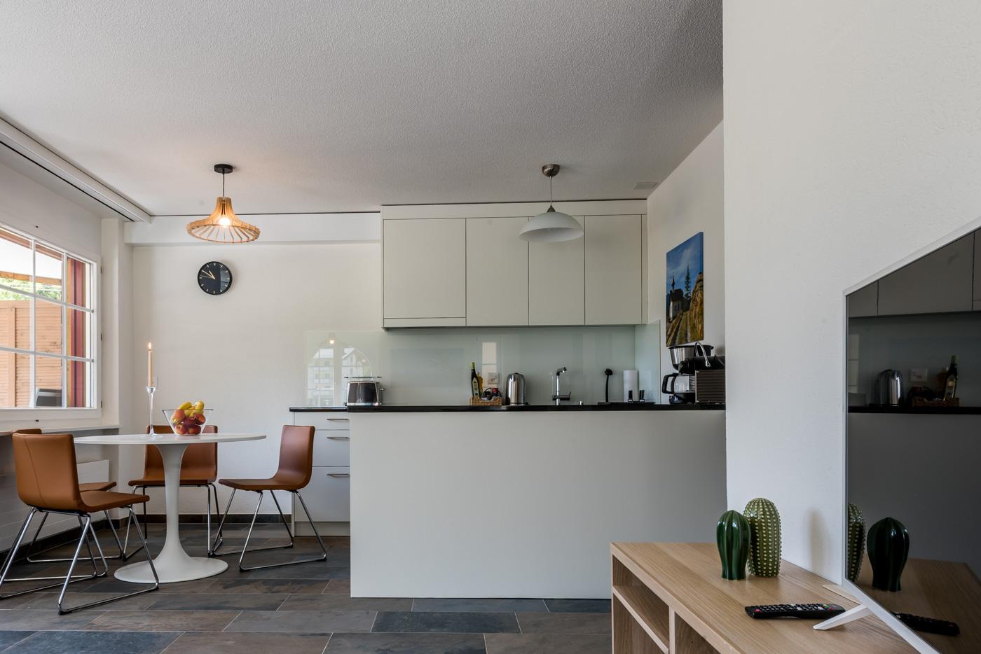 Das moderne Apartment mit 1 Schlafzimmer und 1 Badezimmer für maximal zwei Personen ist komfortabel und liebevoll ausgestattet. Das getrennte Schlafzimmer verfügt über ein Doppelbett mit zwei trennbaren Betten (insgesamt 180cm breit). Das Badezimmer (mit DU/WC) und die offene Küche sind komplett ausgestattet. Auf dem Balkon mit Gartenmöbeln haben Sie eine tolle Aussicht auf die Saaser Bergwelt. Gratis top Highspeed-WLAN, ein eigener Parkplatz vor dem Haus (kostenlos), einen Ski- und Bikeraum sowie eine Waschküche zur gemeinsamen Nutzung im Haus A der Überbauung runden das Angebot ab.