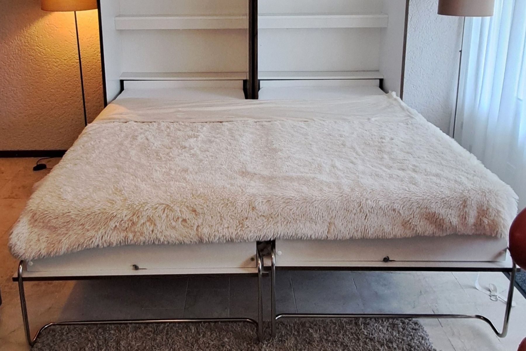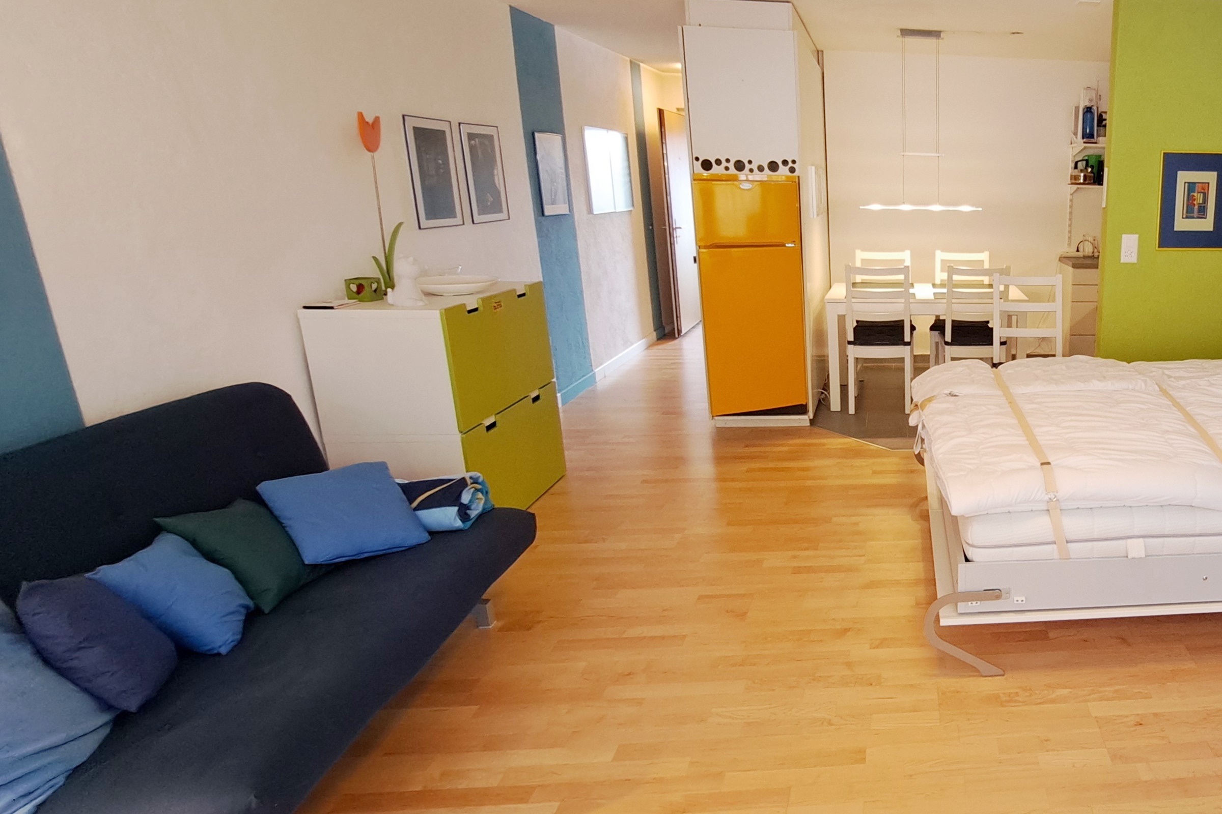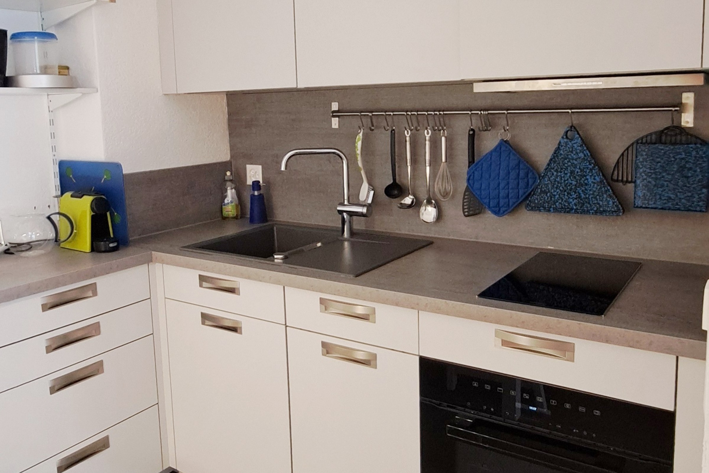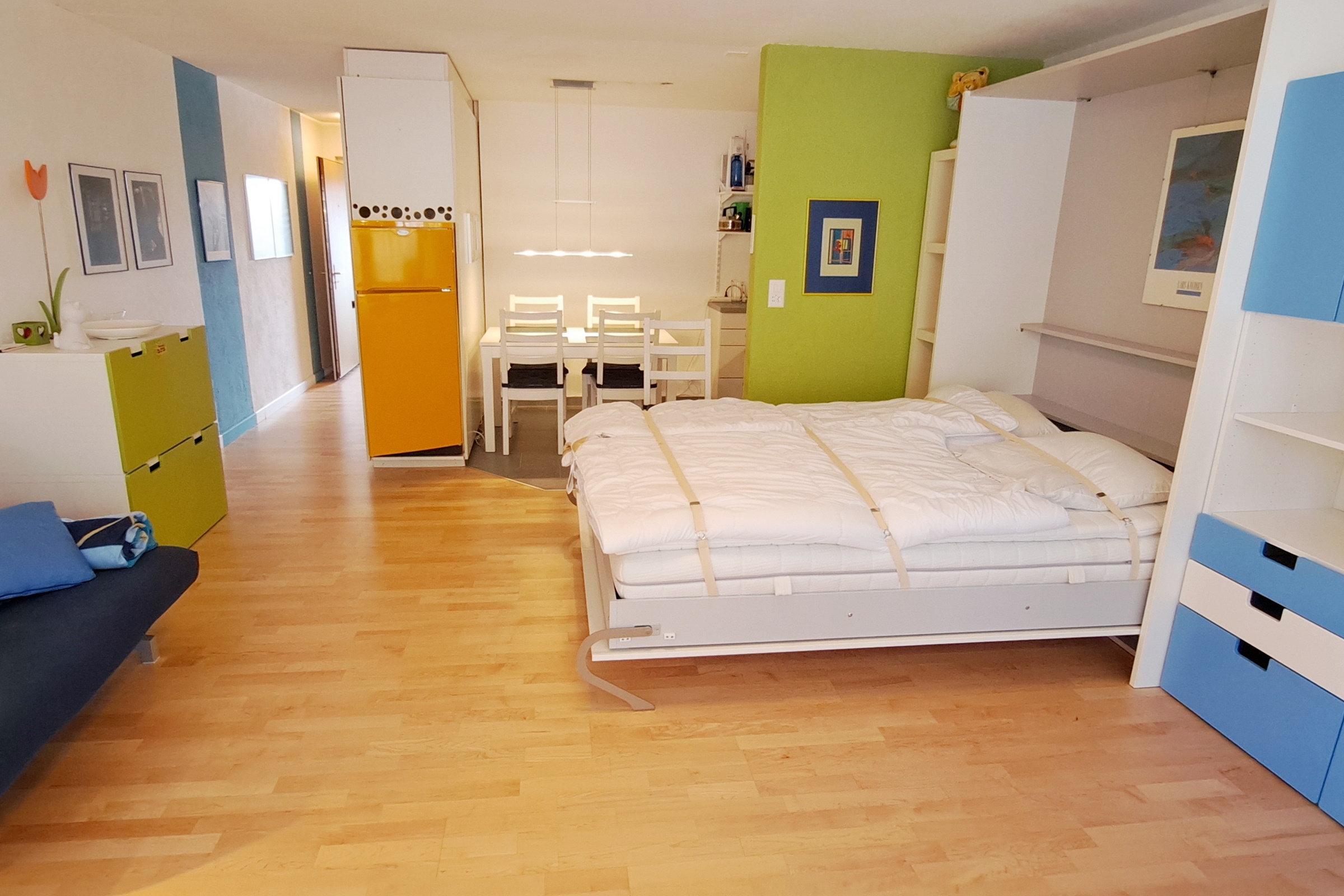 Die moderne Ferienwohnung verfügt überein Wohn-, Ess- und Schlafbereich eine praktische und voll ausgestattete Kücheein gemütlicher Wohnbereich kombiniert mit Schrankbett und Sofa (Schlaf-Möglichkeit für 1 Person)ein Badezimmer mit Dusche und Badewanneein Garagenplatz