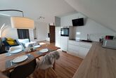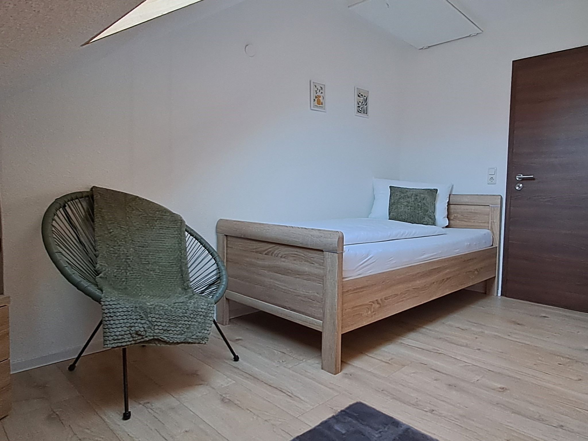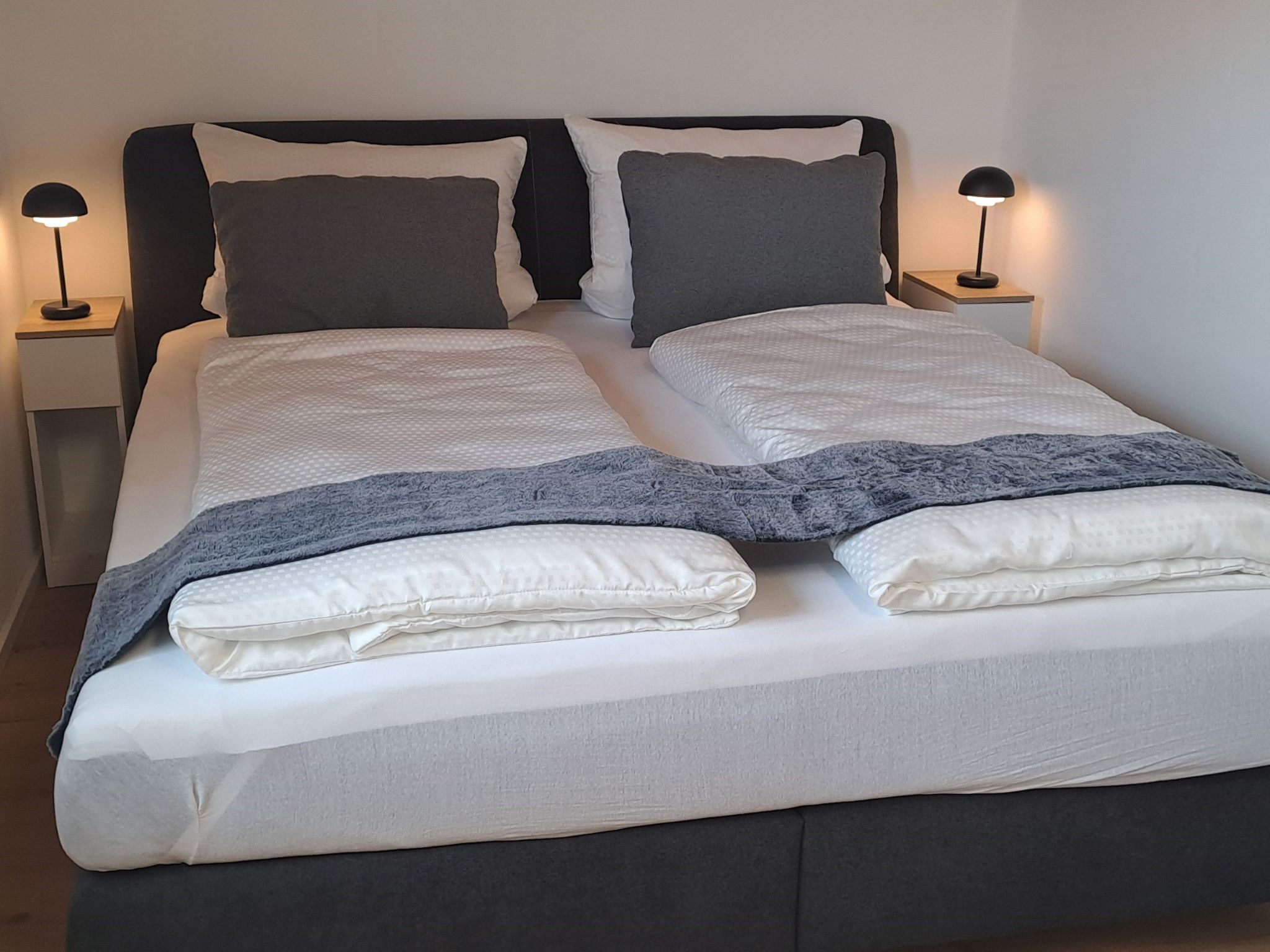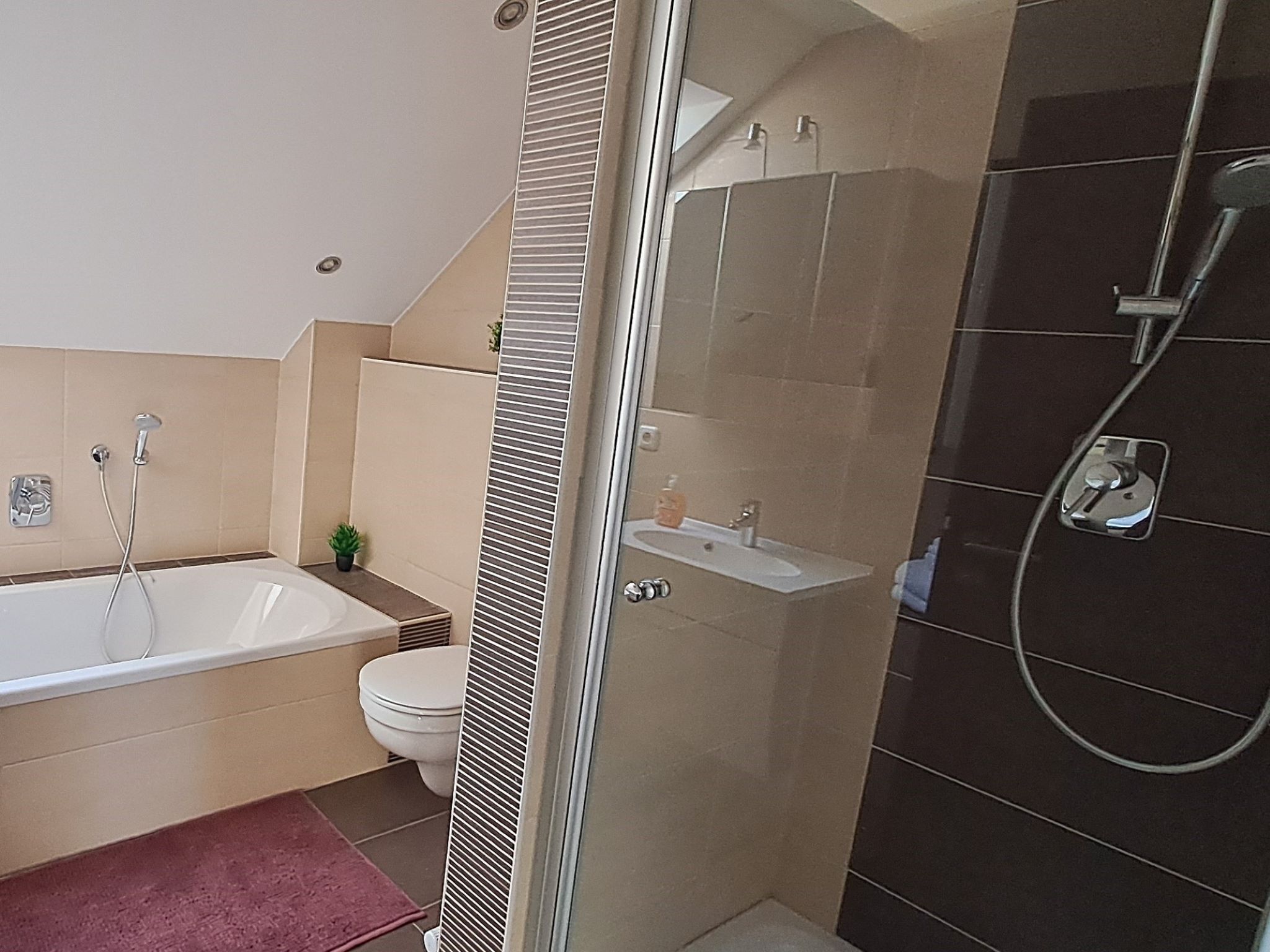 Unsere Ferienwohnung mit ca. 65 qm ist ausgestattet mit 1 Schlafzimmer mit einem Doppelbett, 1 Schlafzimmer mit 2 Einzelbetten, einem Wohn-/Essbereich mit einer weiteren Schlafmöglichkeit auf der Schlafcouch, 2 TV's, einem begehbaren Schrank und einer komplett ausgestatteten Küchen mit Kühlschrank, Herd, Backofen, Geschirrspüler und Mikrowelle, Kaffeemaschine, Toaster, 1 Badezimmer mit Dusche, Badewanne und Haartrockner. Der Garten mit einer Frühstücksterrasse sowie einer gemütlichen Lounge-Ecke kann gerne mitbenutzt werden. Die Ferienwohnung liegt im Obergeschoss.