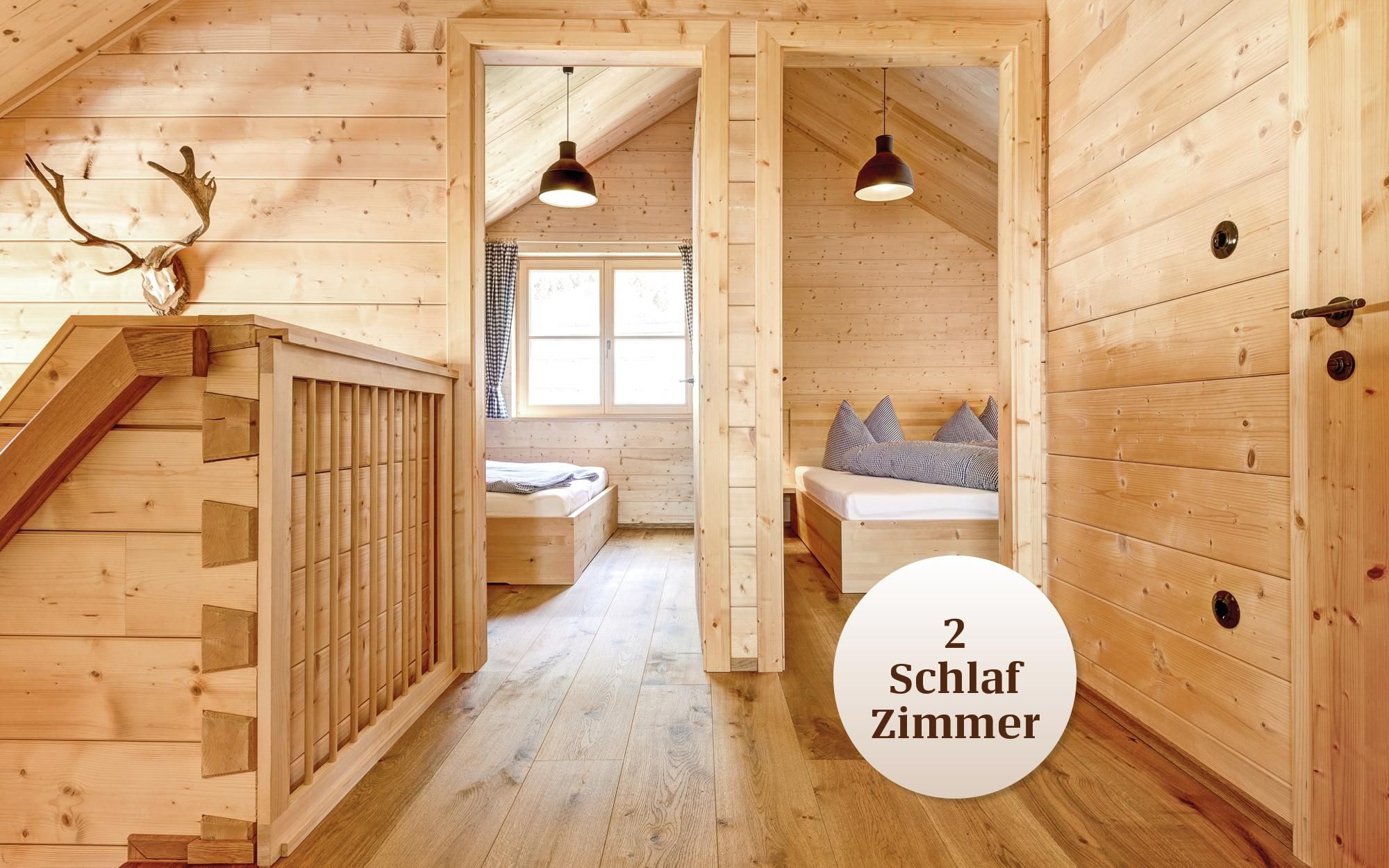 Das Chalet bietet auf 80 m² Platz für bis zu 4 Personen und erstreckt sich über zwei Stockwerke. Im Obergeschoss befinden sich zwei Schlafzimmer mit Doppelbetten sowie ein Ruheraum mit Couch. Darüber hinaus verfügt das Chalet über eine komplett ausgestattete Küche mit allen wichtigen Küchenutensilien, ein Badezimmer mit Dusche, eine Terrasse, einen Garten, eine überdachte Veranda mit Sitzbank und einen Parkplatz direkt vor der Hütte.