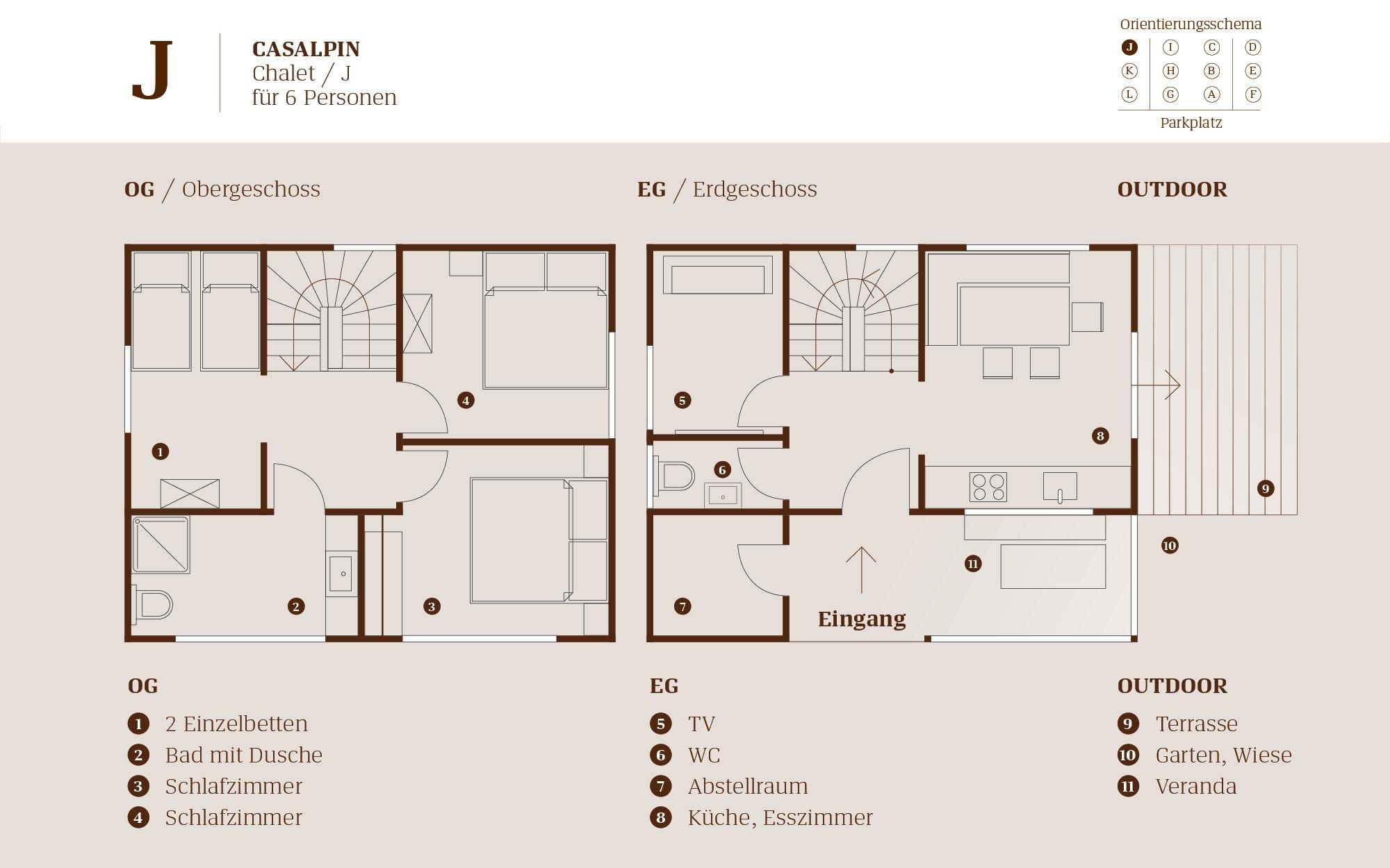Das Chalet bietet auf 80 m² Platz für bis zu 6 Personen und erstreckt sich über zwei Stockwerke. Im Obergeschoss befinden sich zwei Schlafzimmer mit Doppelbetten sowie ein Schlafzimmer mit zwei Einzelbetten. Darüber hinaus verfügt das Chalet über eine komplett ausgestattete Küche mit allen wichtigen Küchenutensilien, ein Badezimmer mit Dusche, eine Terrasse, einen Garten, eine überdachte Veranda mit Sitzbank und einen Parkplatz direkt vor der Hütte.
