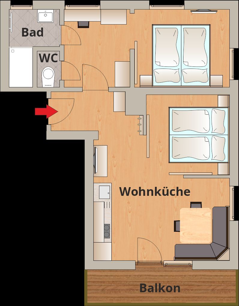 Ankommen und Wohlfühlen. Dieses voll ausgestattete Appartement besteht aus 2 Schlafzimmer, einer Küche sowie einem Bad mit Dusche & WC und ermöglicht ein komfortables Wohnen für 2 - 4 Personen.
