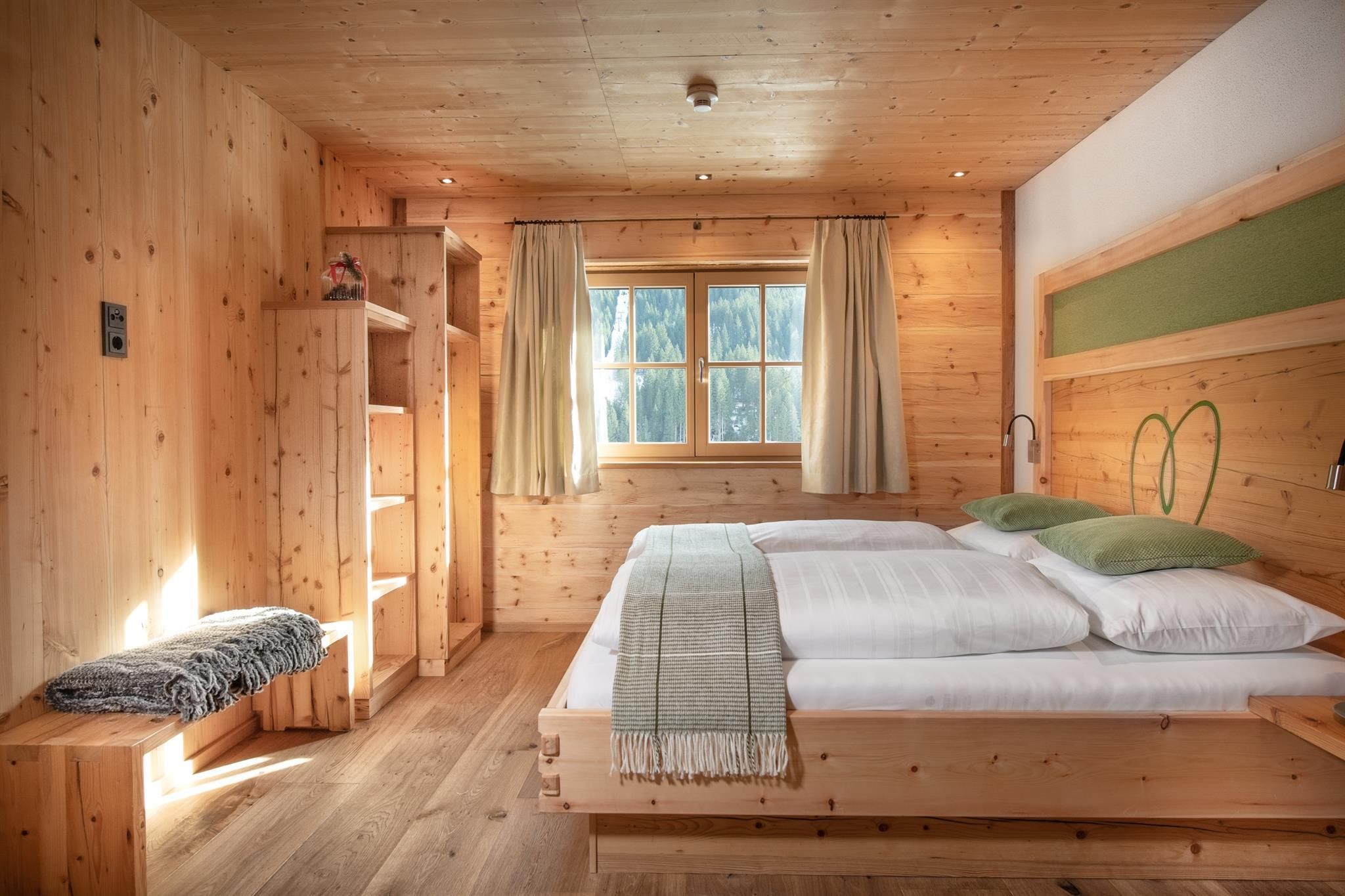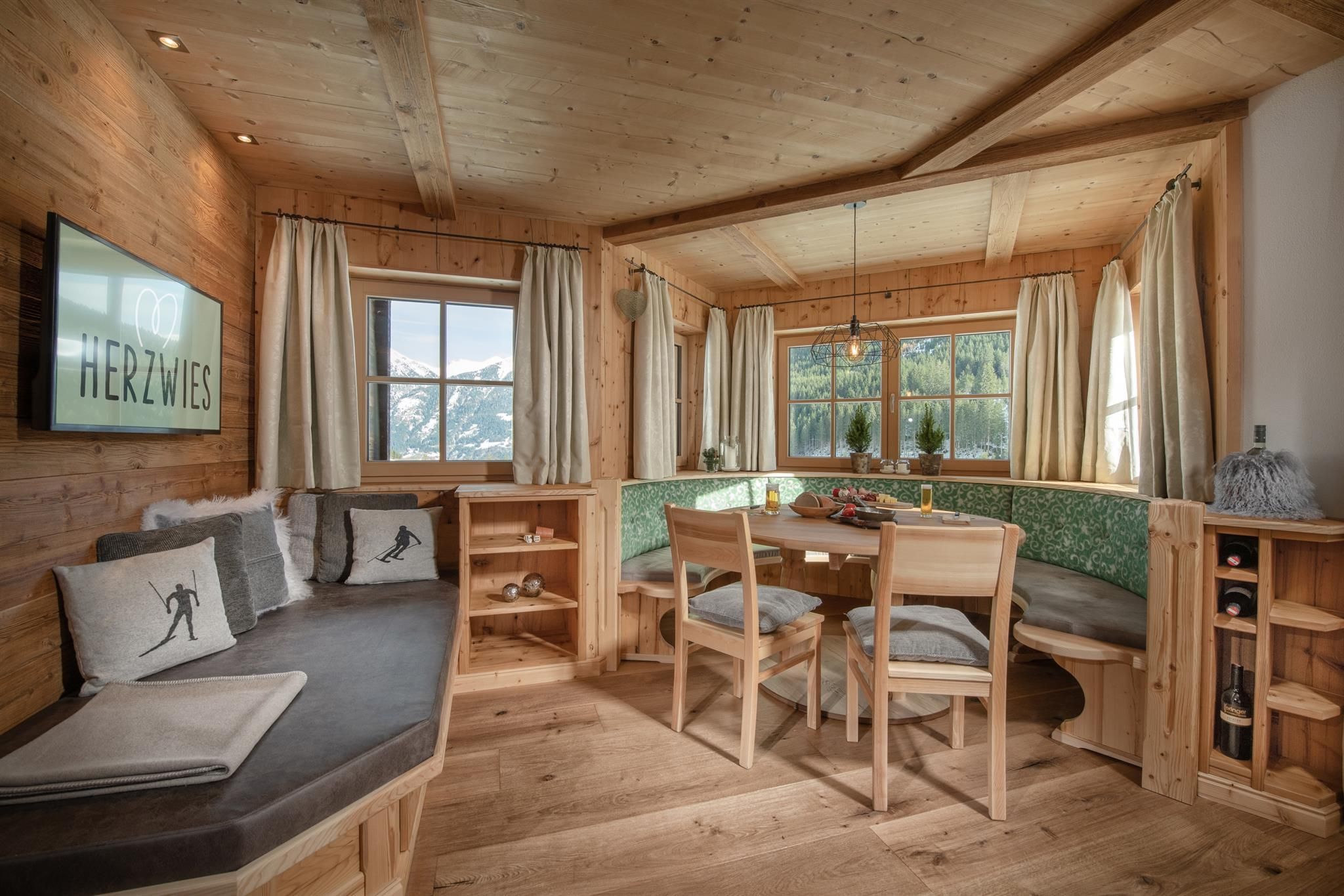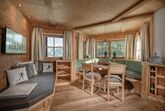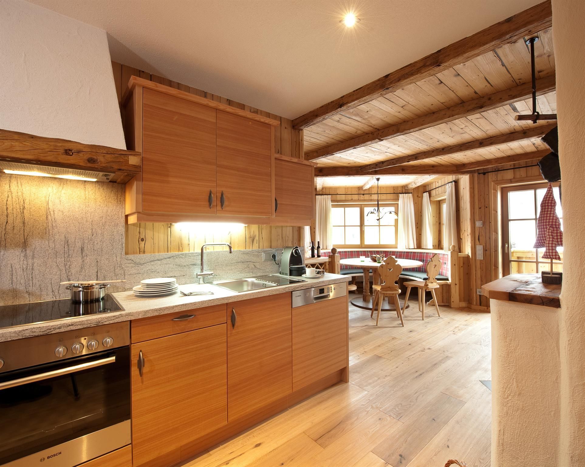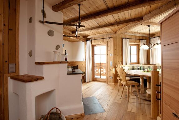 3 getrennte Schlafzimmer aus Zirbenholz, zwei Badezimmer, großer Wohnbereich mit Sofaecke und Kaminofen,