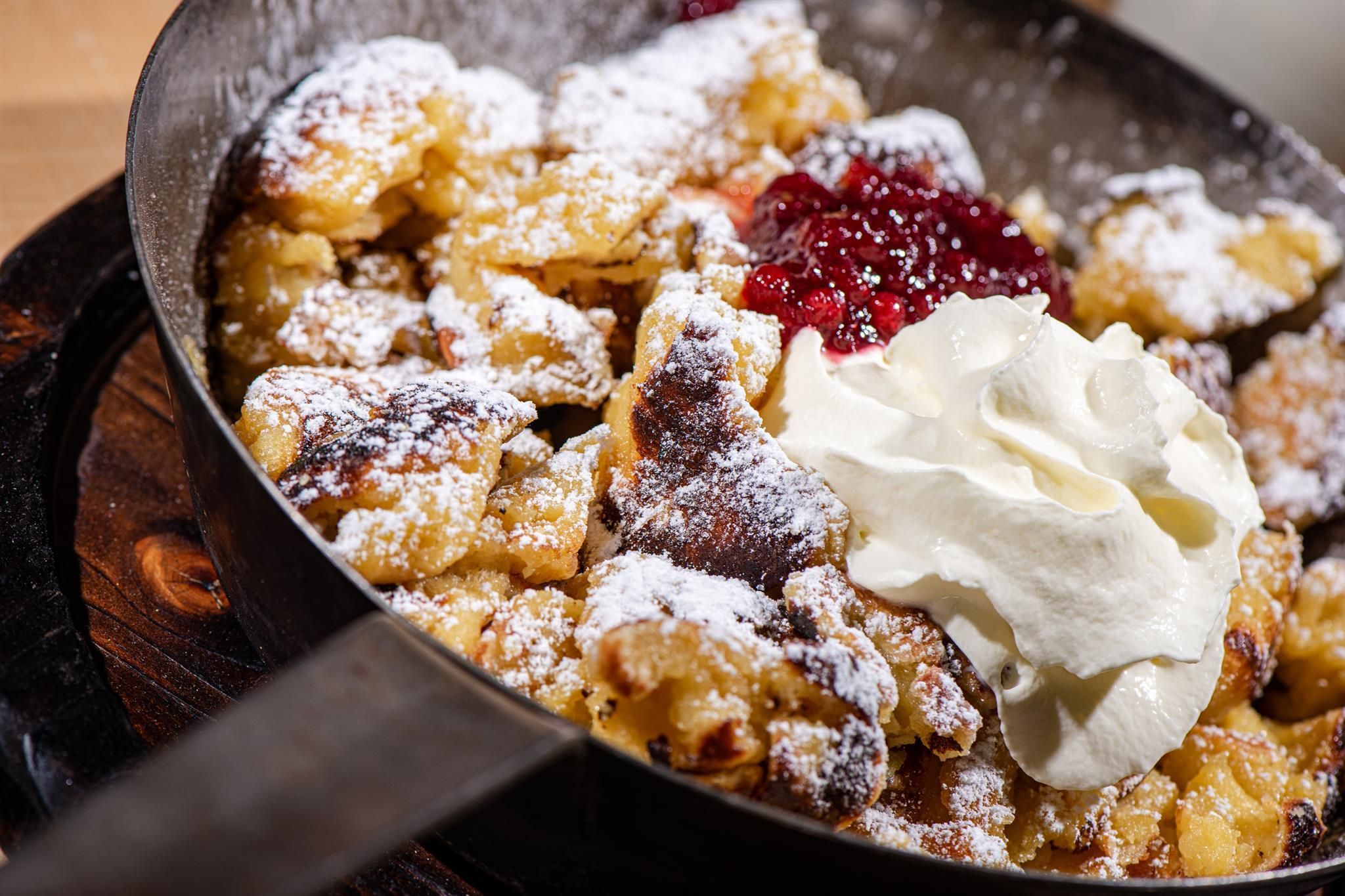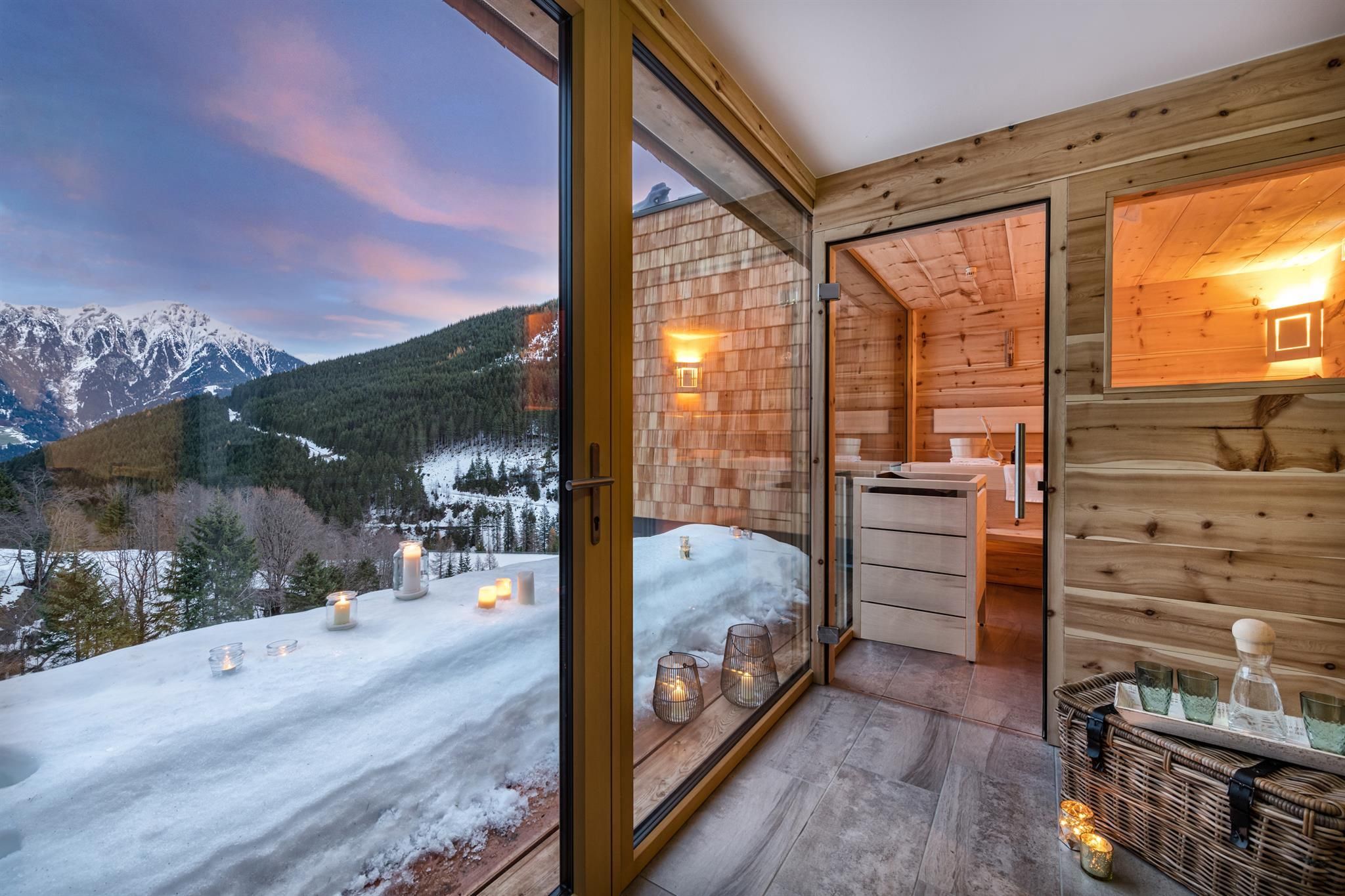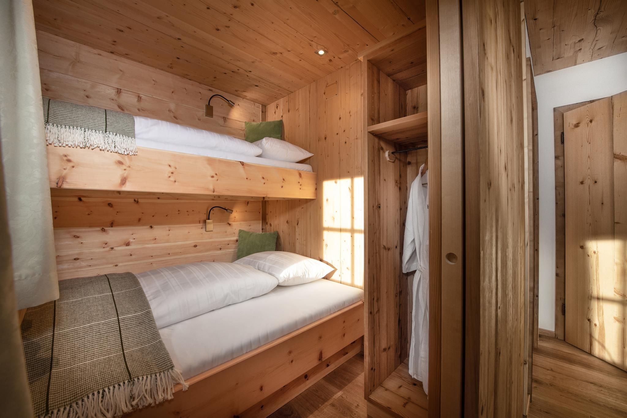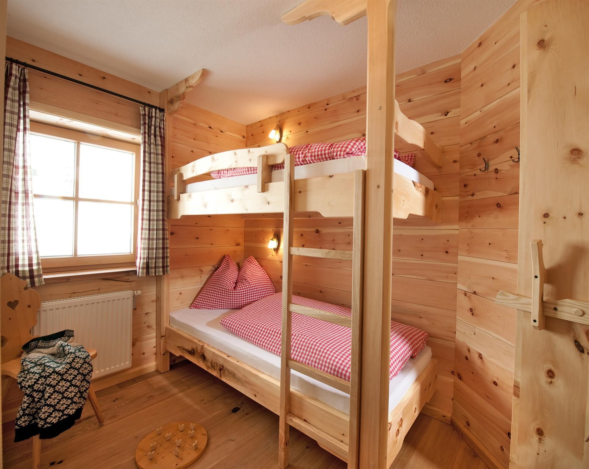 3 getrennte Schlafzimmer aus Zirbenholz, zwei Badezimmer, großer Wohnbereich mit Sofaecke und Kaminofen,