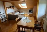 Ferienwohnung im Dachgeschoss, bestehend aus einem kombinierten Wohn-/Schlafraum mit einem 140x200 cm Schlafsofa und einem 140x200 cm Doppelbett. Weiter sind im Zimmer ein Tisch für 4-6 Personen, ein Sessel, ein Wandschrank und ein Flachbildfernseher mit Sat-TV.