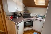 Die kleine, vollausgestattete Küchennische im Flur ist mit einem neuen Ceranfeld, einem Backofen, einem Kühlschrank und einer Spüle ausgestattet. Es gibt eine Kaffeemaschine, einen Toaster und einen Wasserkocher.