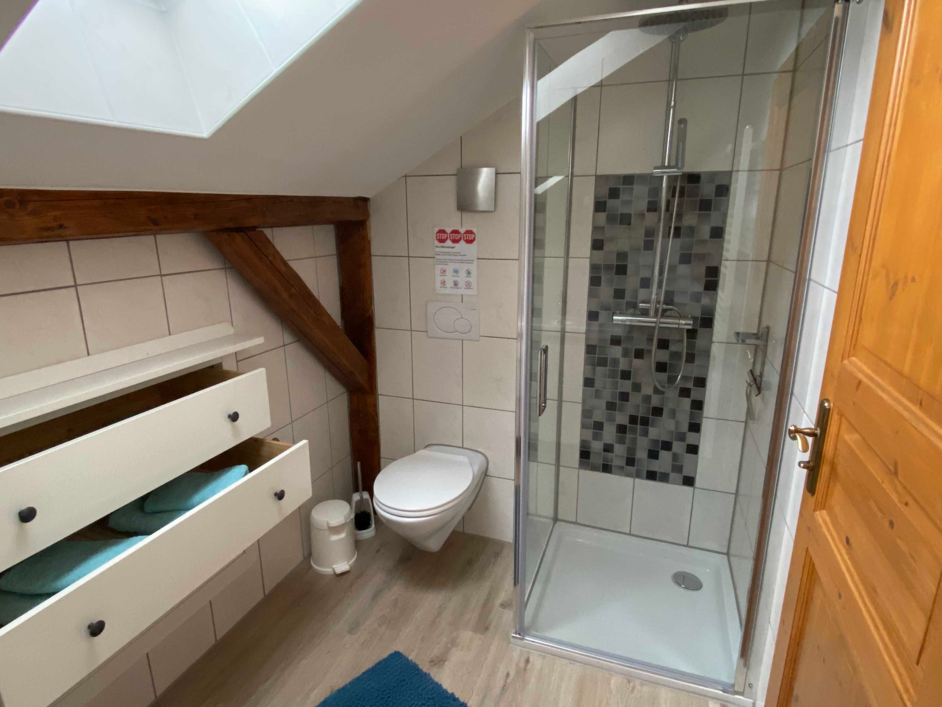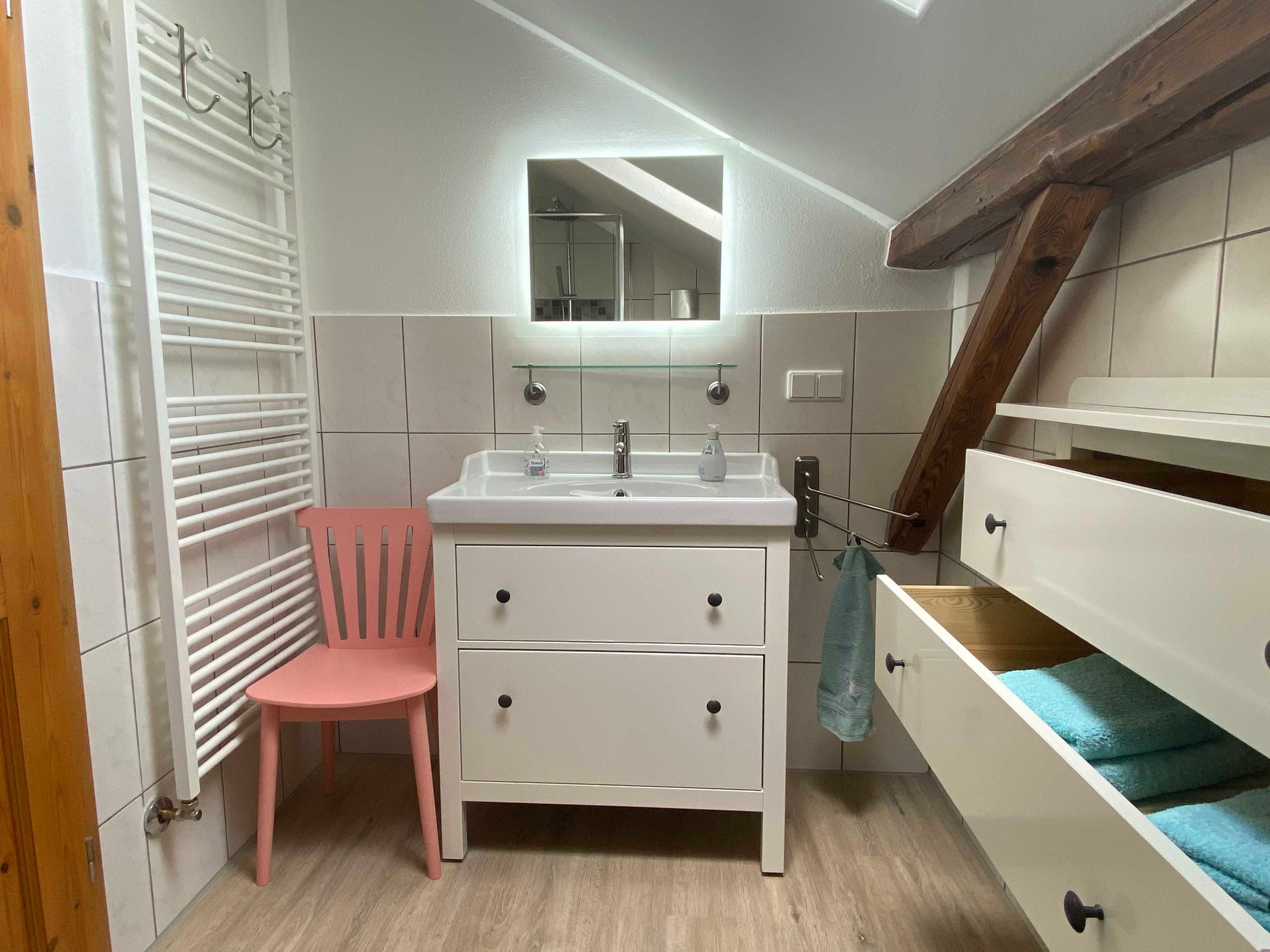 Im neu renovierten Bad befindet sich eine ebenerdige Dusche, eine geräumige Wandkommode, ein Waschtisch und natürlich ein WC.