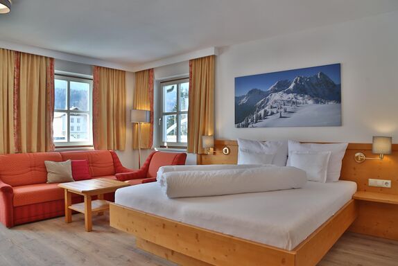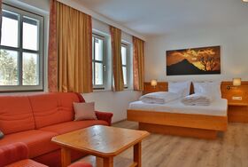 28m² große Junior Suite teilweise mit Balkon, Dusche/WC, Fön, Minibar, SAT-TV, freier Nutzung des WLAN-Netzes des Hauses, gemütlicher Sitzecke mit Blick auf die Karnischen Alpen. NICHTRAUCHER ZIMMER!