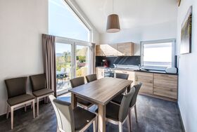 Großzügiges Wohn- / Esszimmer mit Flat-TV, ausziehbare Schlaf- & Sitzcouch, eine zusätzliche Sitzcouch und vollständig ausgestattete Küche: Herd mit Ceranfeld und Backofen, Kühlschrank mit Gefrierfach, Kaffeemaschine (Senseo Pad), Wasserkocher, Toaster, Geschirrspülmaschine und mit Standard-Küchen- und Geschirrinventar komplett ausgestattet.