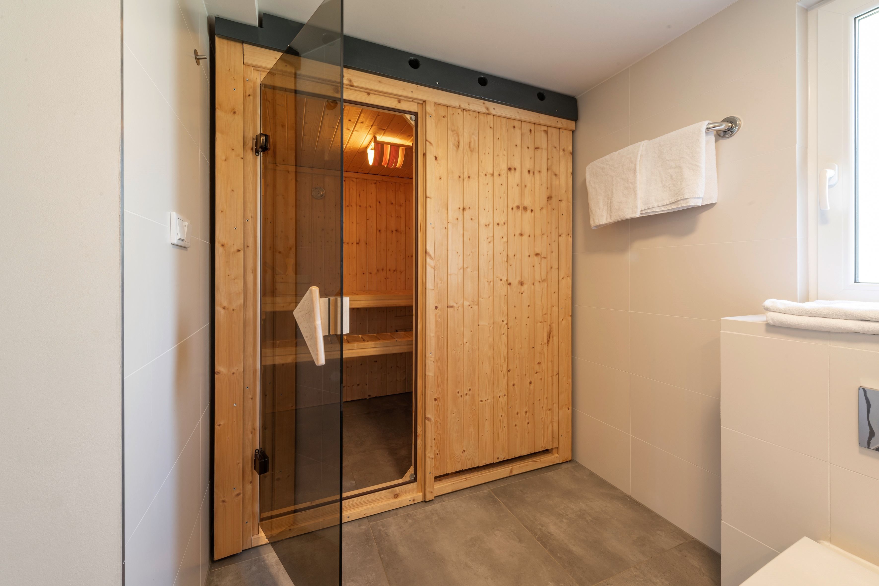3x Schlafzimmer (2x Doppelbett), 2 Schlafzimmer jeweils einem direkt begehbaren privaten Badezimmer Dusche/WC. 1x Sauna