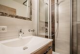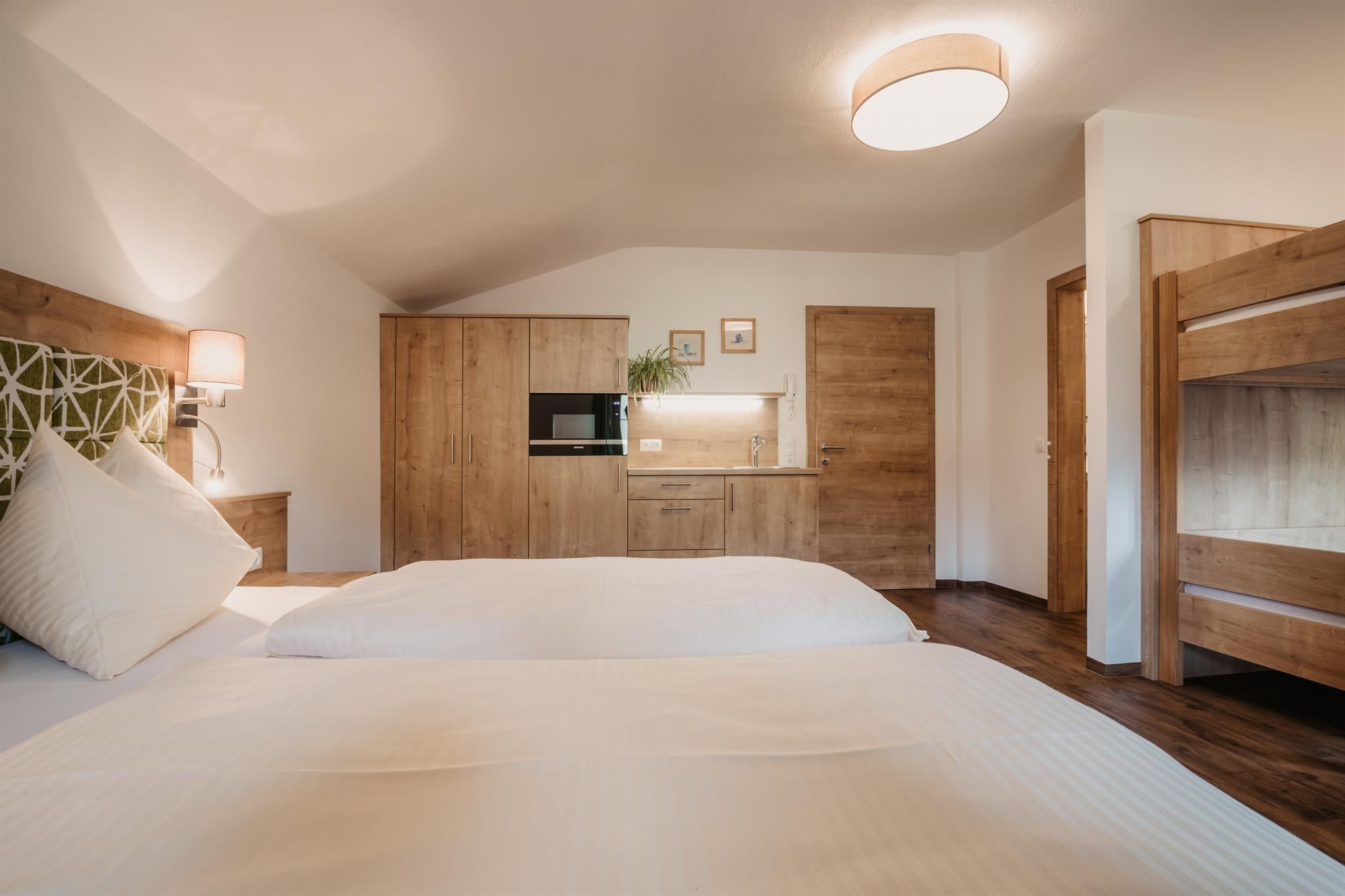 Das App. Typ A (105 m²) für bis zu 12 Pers. befindet sich im 1. OG. und verfügt über eine große, top-ausgestattete Küche mit einem optisch getrennten Wohn-/Schlafbereich, 4 separate Schlafräume (dav. ein Familienzimmer), 3 Bäder/WC und einen Balkon.