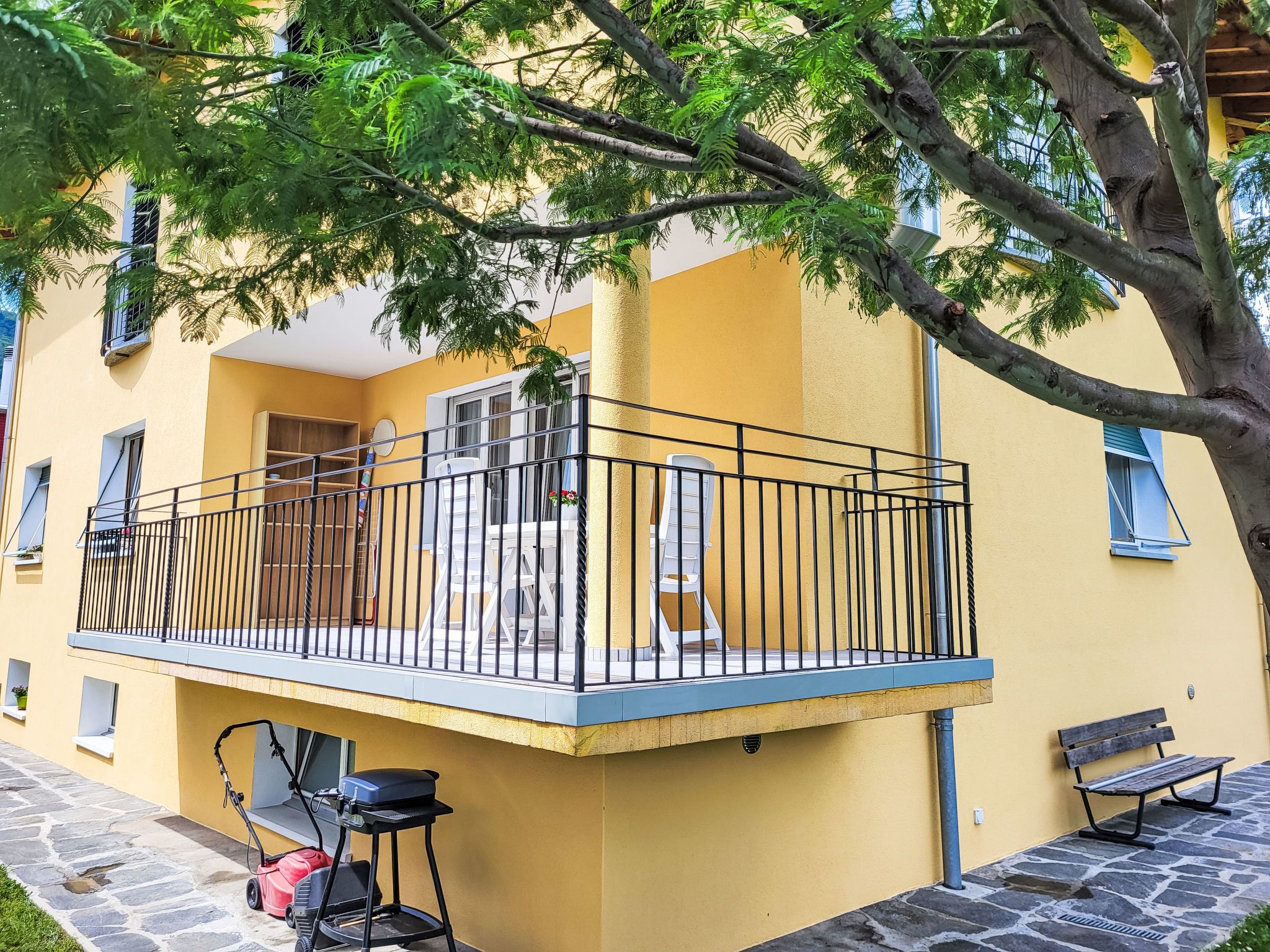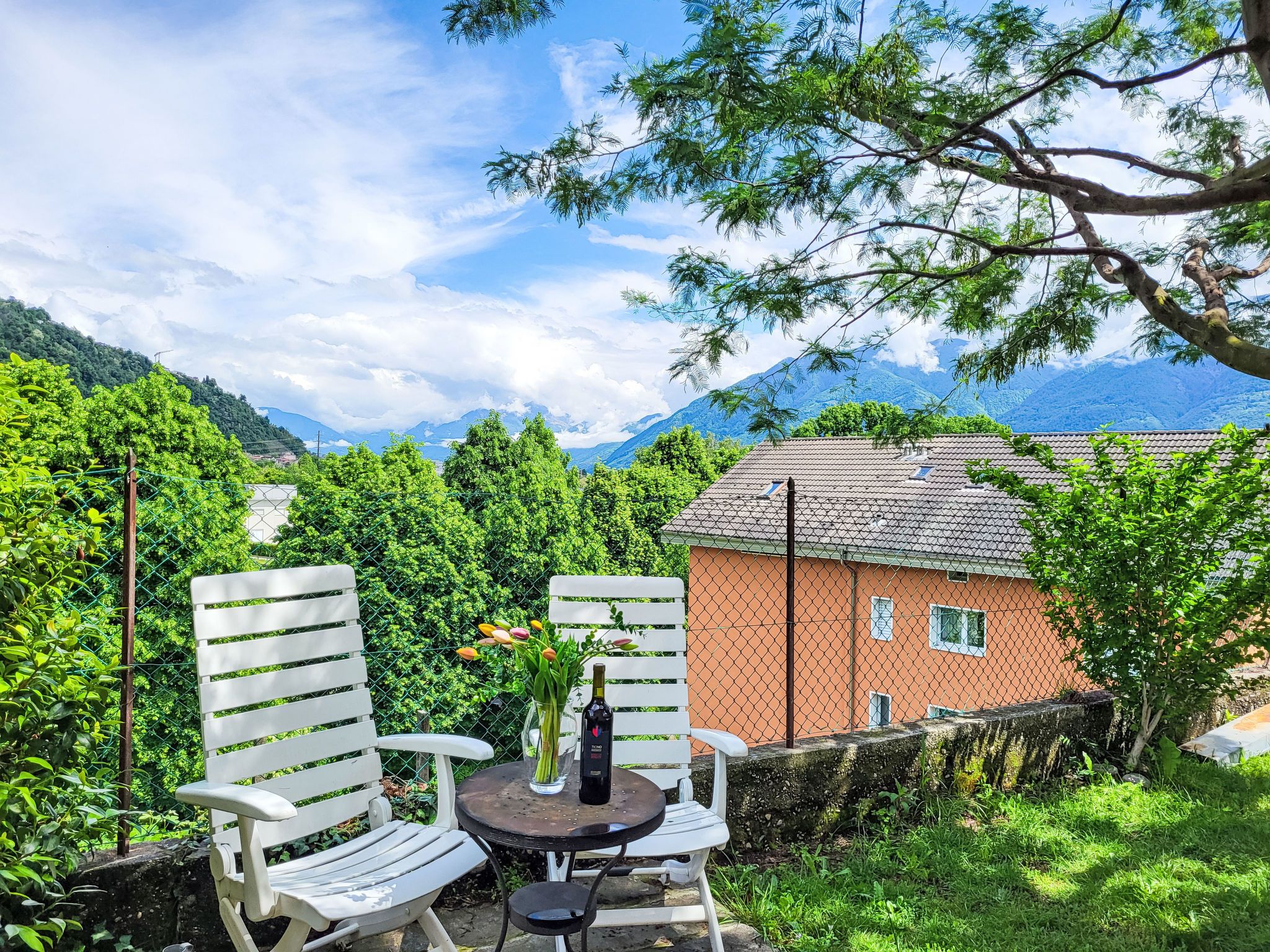 Losone 1 km von Locarno: Schönes, gemütliches Mehrfamilienhaus auf 2 Stockwerken, umgeben von Bäumen und Weinbergen. Am Ortsrand, ruhige, sonnige Lage in einem Wohnquartier, 100 m vom Fluss, im Grünen, Richtung Südwesten. Zur Mitbenutzung: kleiner Garten. Gartenmöbel, Grill. Bushaltestelle Losone Sottochiesa 240 m. Bitte beachten: Der Besitzer wohnt im selben Haus.