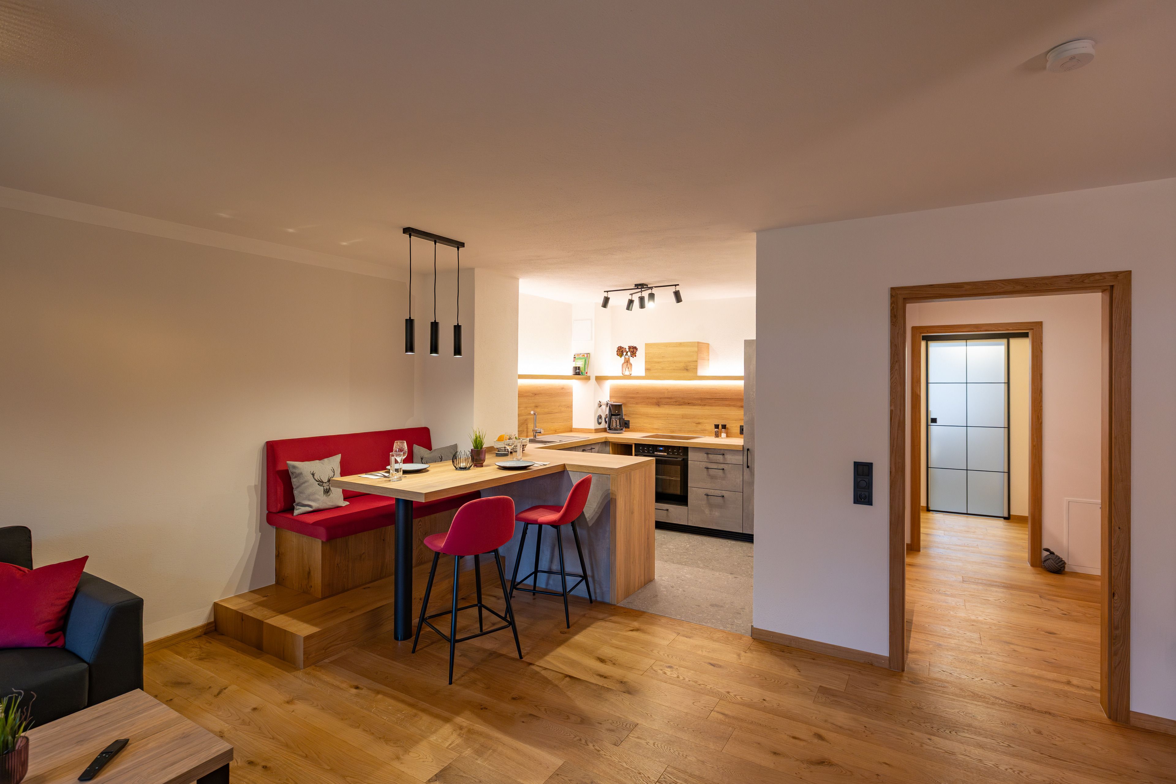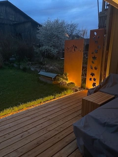 Die Ferienwohnung liegt im Ortskern und ist trotzdem ruhig gelegen. Auch das Bad wurde vollständig saniert. Der KfZ-Stellplatz liegt direkt am Haus. Ein kleiner Supermarkt zur Deckung des täglichen Bedarfs incl. Backwaren liegt in unmittelbarer Nachbarschaft. Das gemeindeeigene Naturfreibad (Eintritt frei) samt Kiosk ist fußläufig erreichbar. Eine kostenlose e-Bike-Ladestation liegt ebenso in unmittelbarer Nähe zur Wohnung. Die Holzterrasse ist mit gemütlichen Loungemöbeln und indirekter Beleuchtung ausgestattet, ein Grill ist vorhanden.