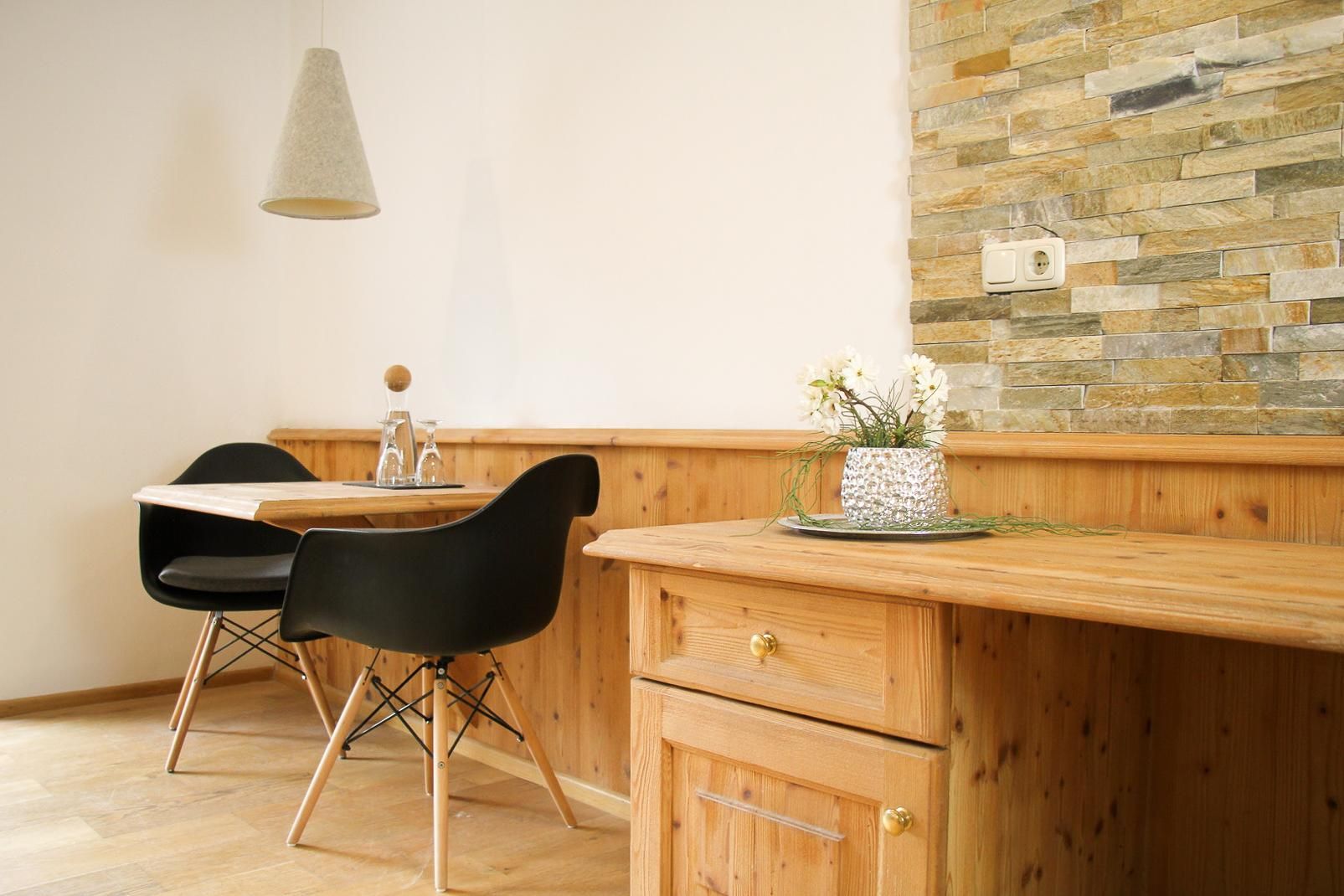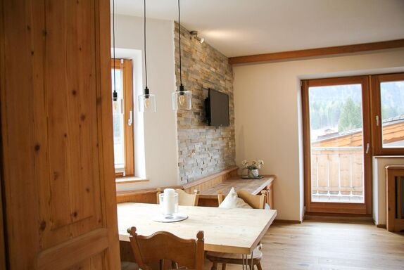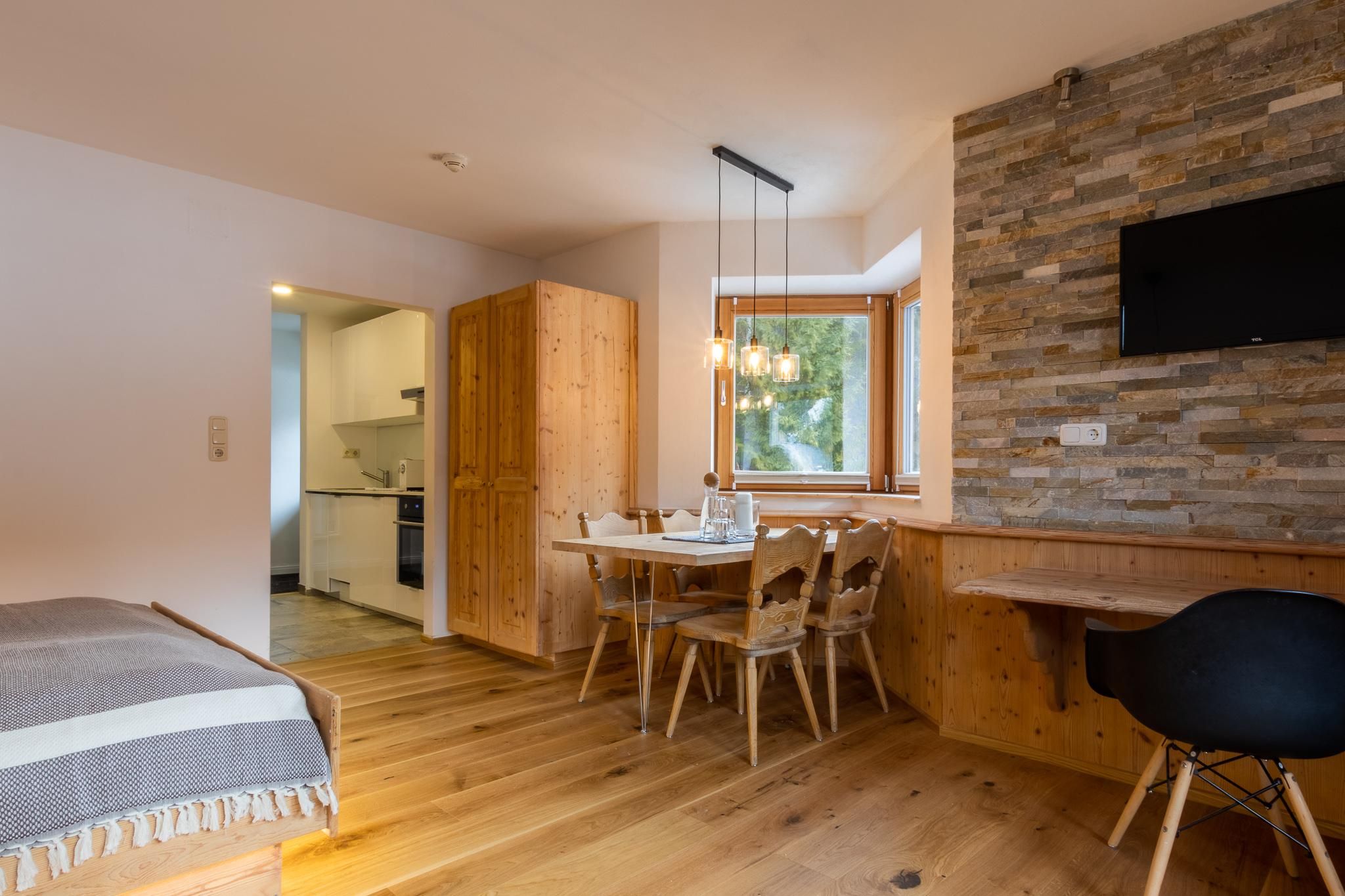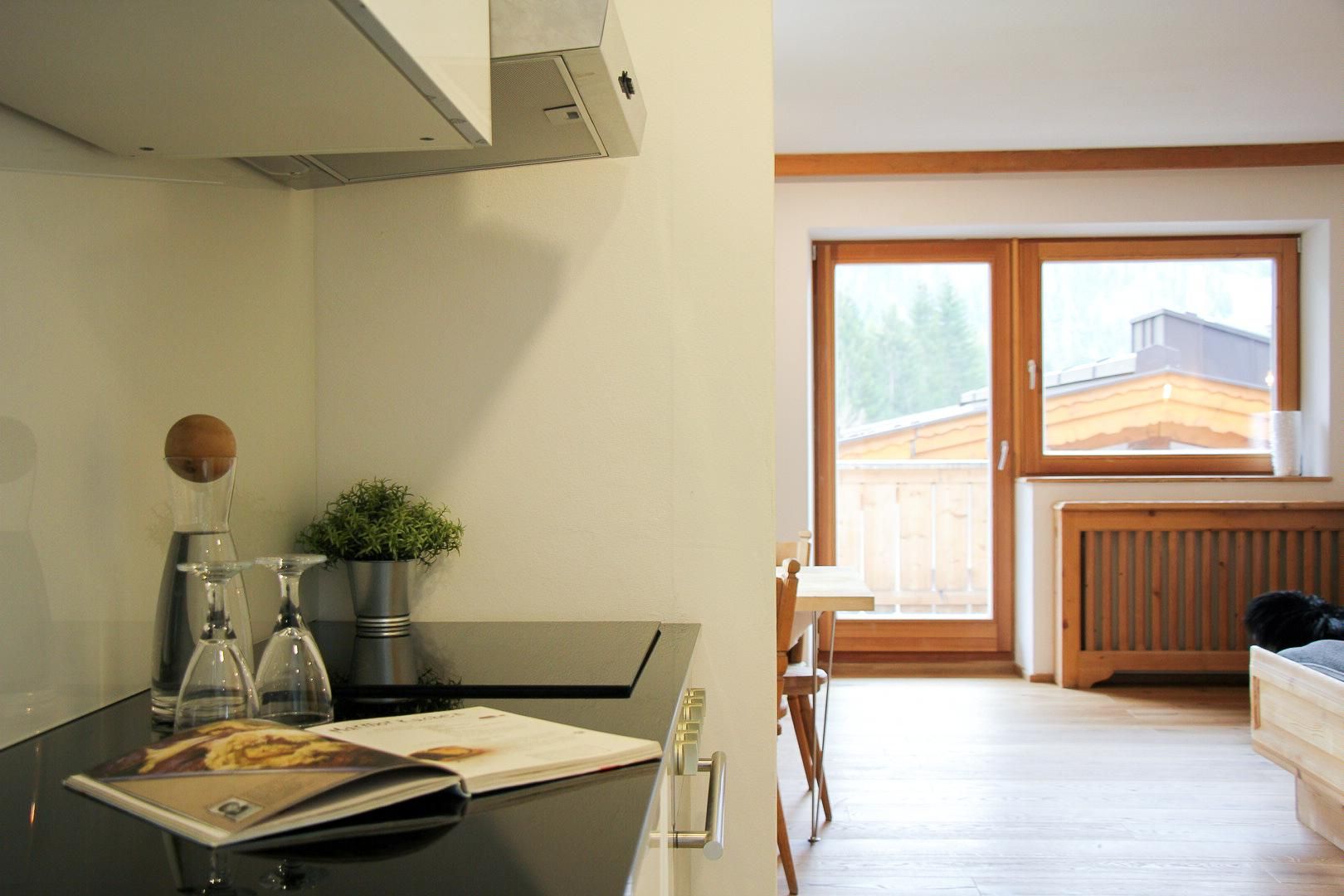 Dieses Apartment ist buchbar für bis zu 3 Personen und bietet auf 40 m² einen komfortablen Wohn-/Schlafbereich mit einem Doppelbett, ein separates Kinderbett (150 cm lang) im Vorraum, eine voll ausgestattete Küche, ein modernes Badezimmer mit Dusche, einen Essbereich im lichtdurchfluteten Erker, sowie einen Südbalkon mit wunderschönem Bergblick. Das Apartment befindet sich im 3. Stock in ruhiger Lage am Ende des Flurs und ist bequem über einen Aufzug zugänglich.