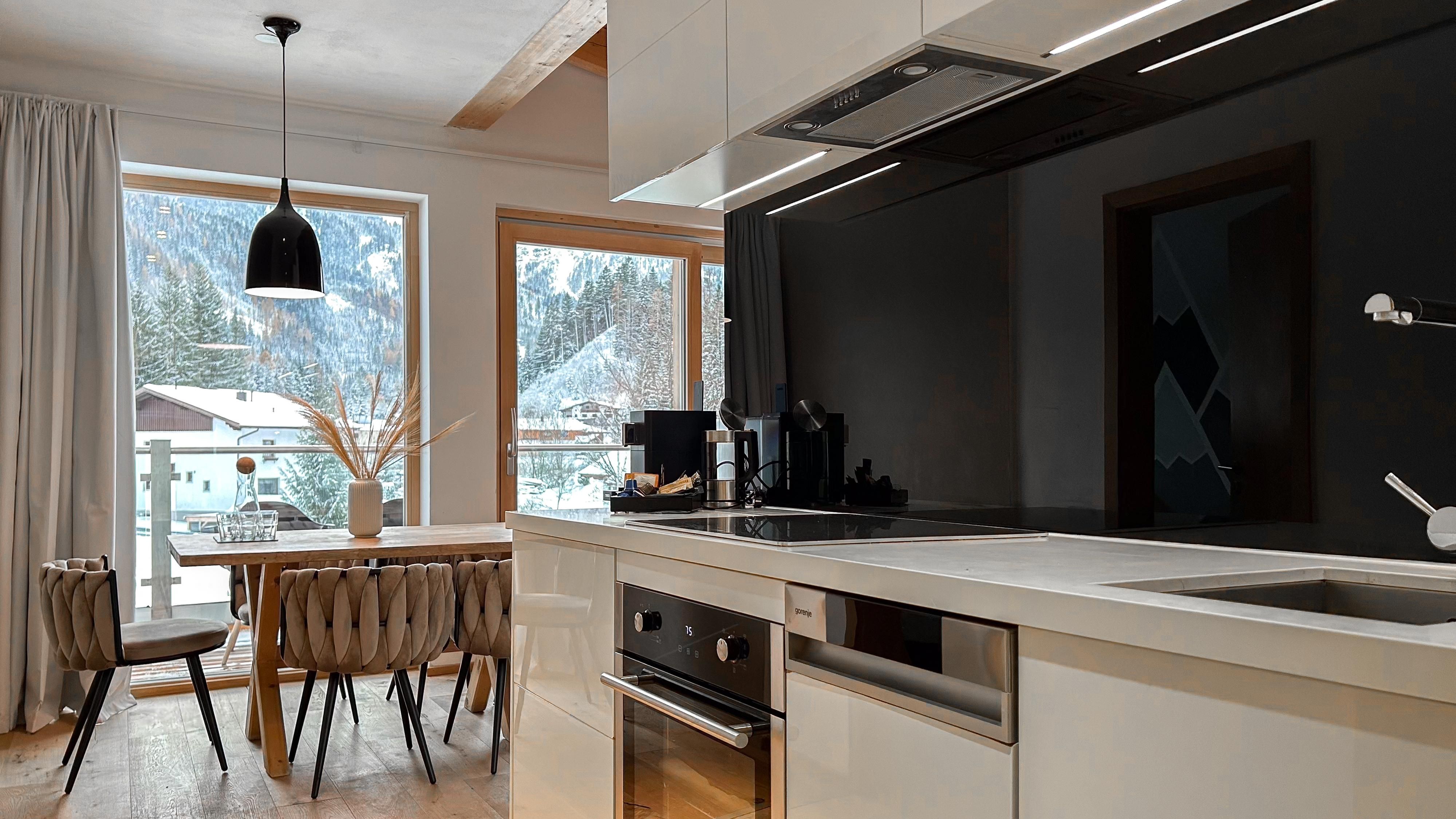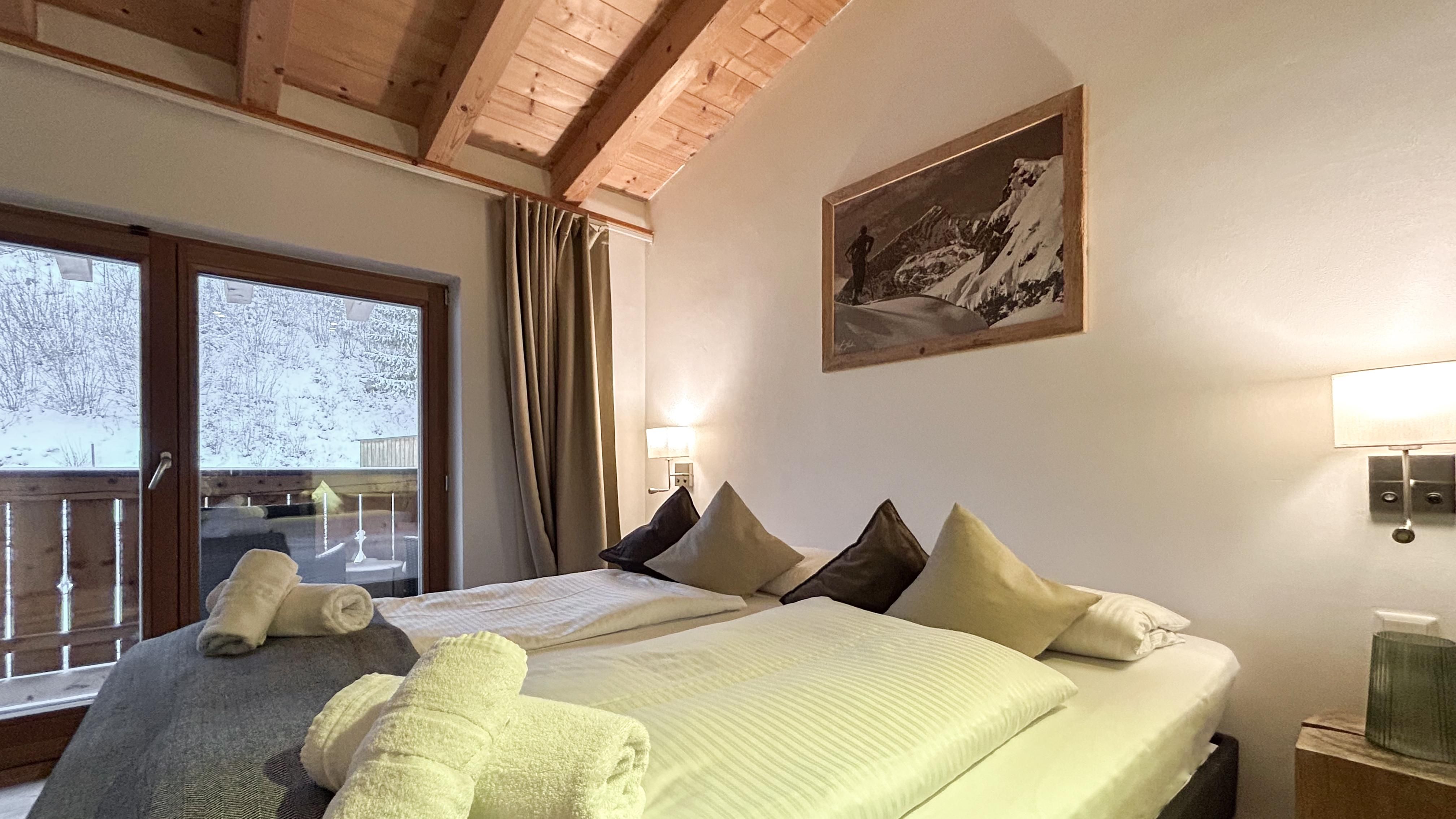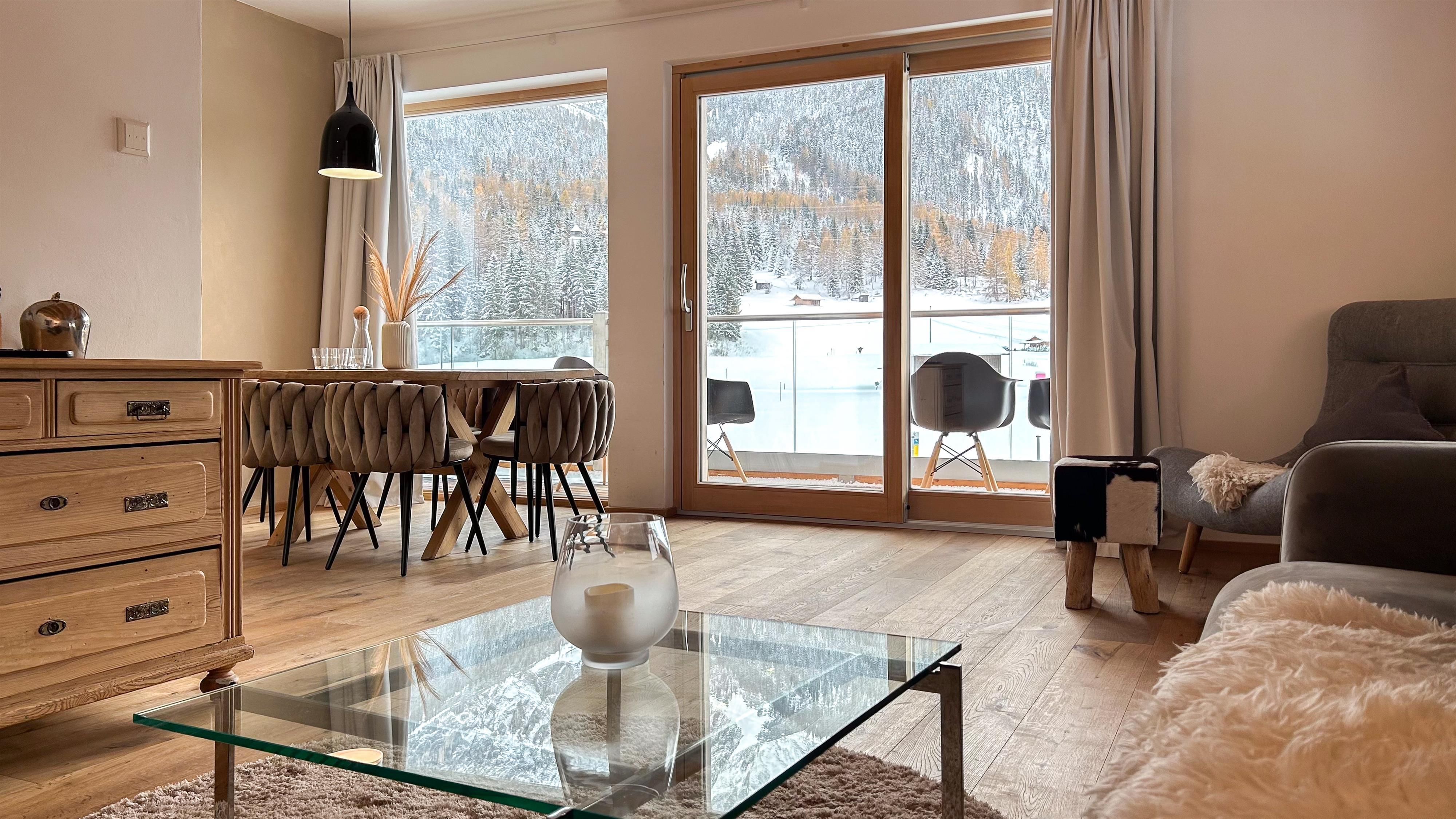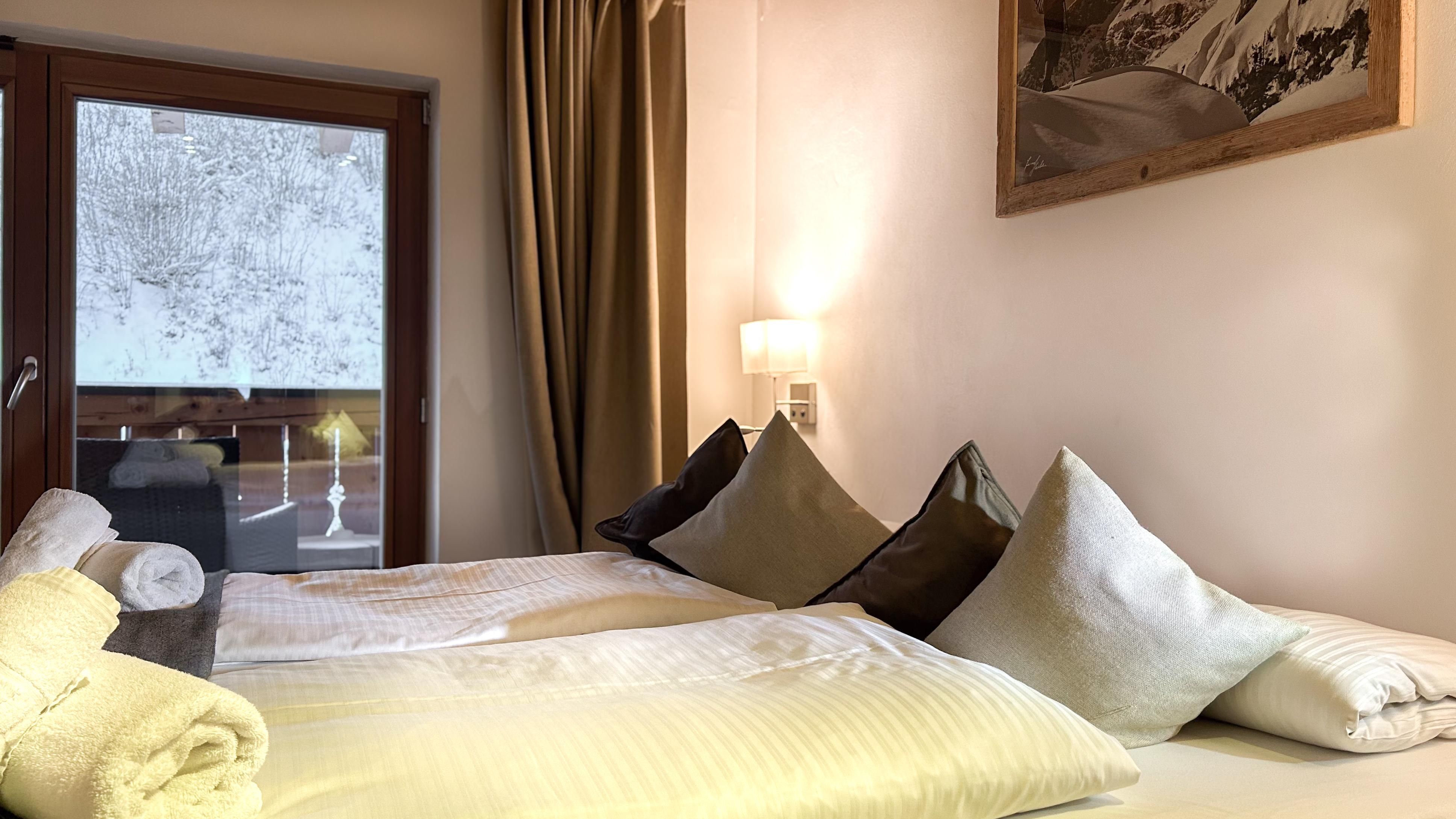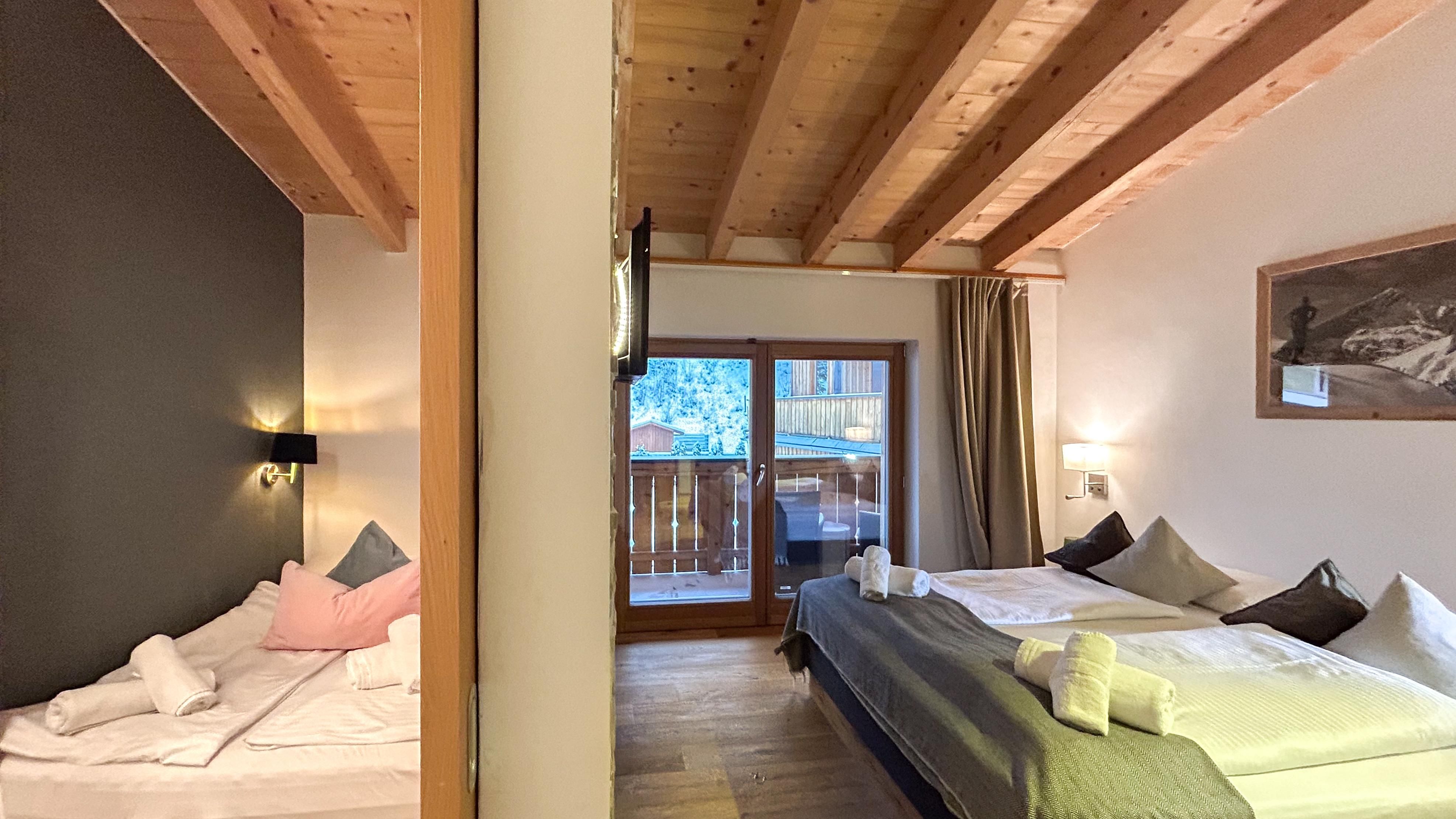 Familienfreundliches Apartment mit großem Schlafzimmer und eigenem Bad sowie zwei kleineren Schlafzimmern. Ein zusätzliches Bad mit WC und Dusche bietet extra Komfort. Der helle Wohn-Essbereich mit voll ausgestatteter Küche, Sofaecke und Esstisch öffnet sich zum Balkon mit herrlichem Bergpanorama. Perfekt für Familien, die Entspannung und alpine Erlebnisse kombinieren möchten.
