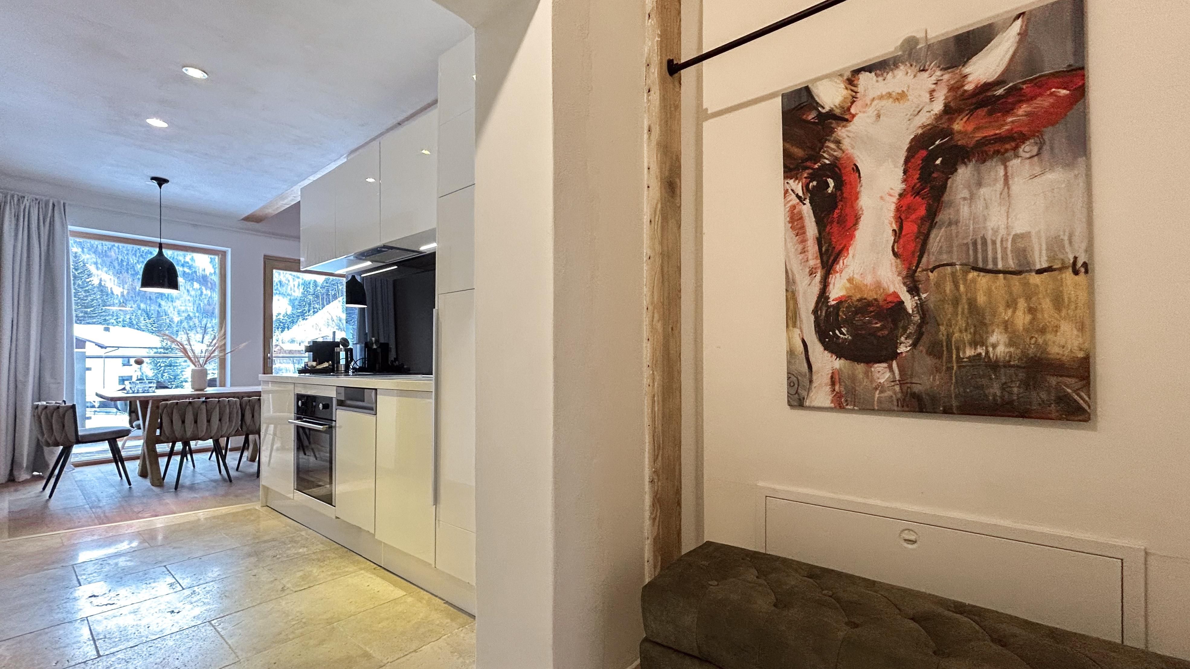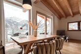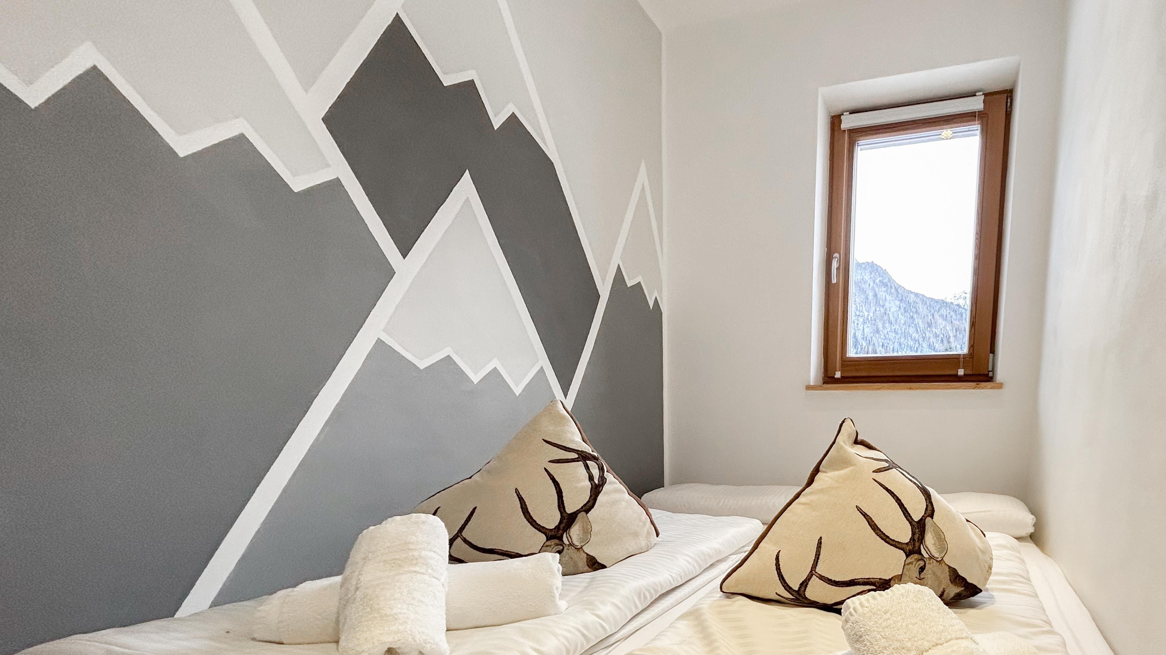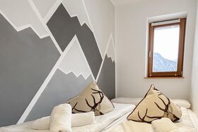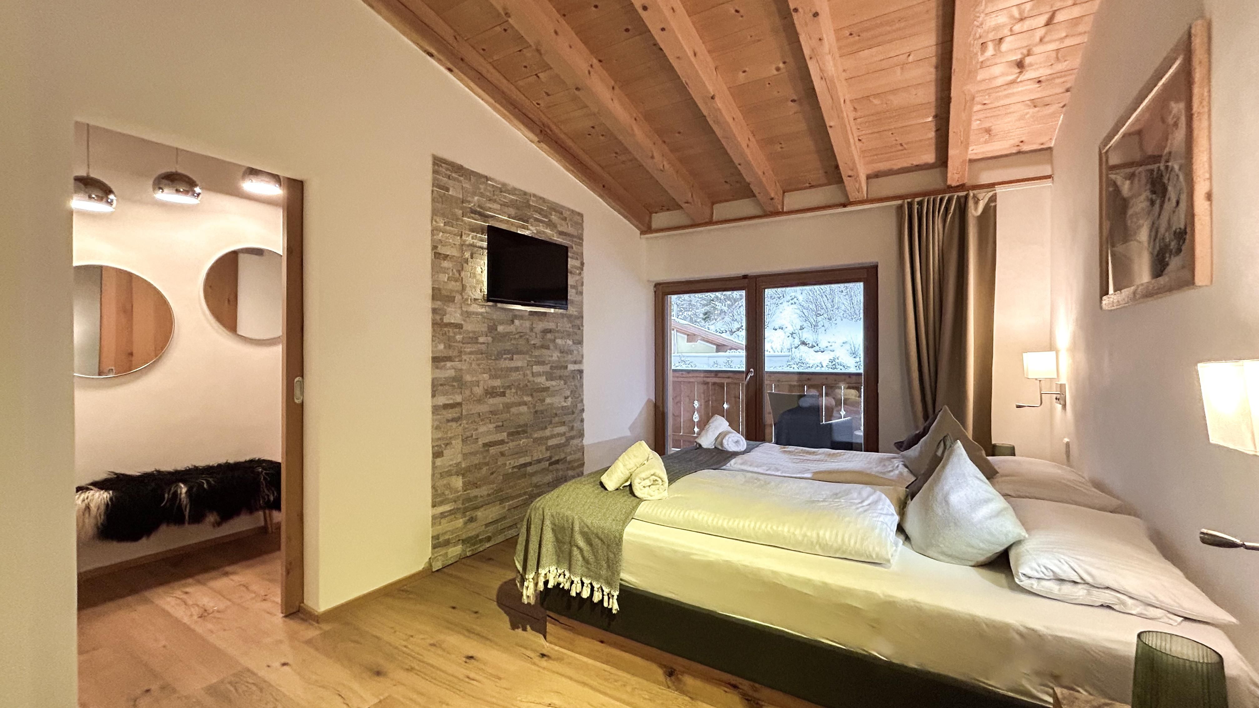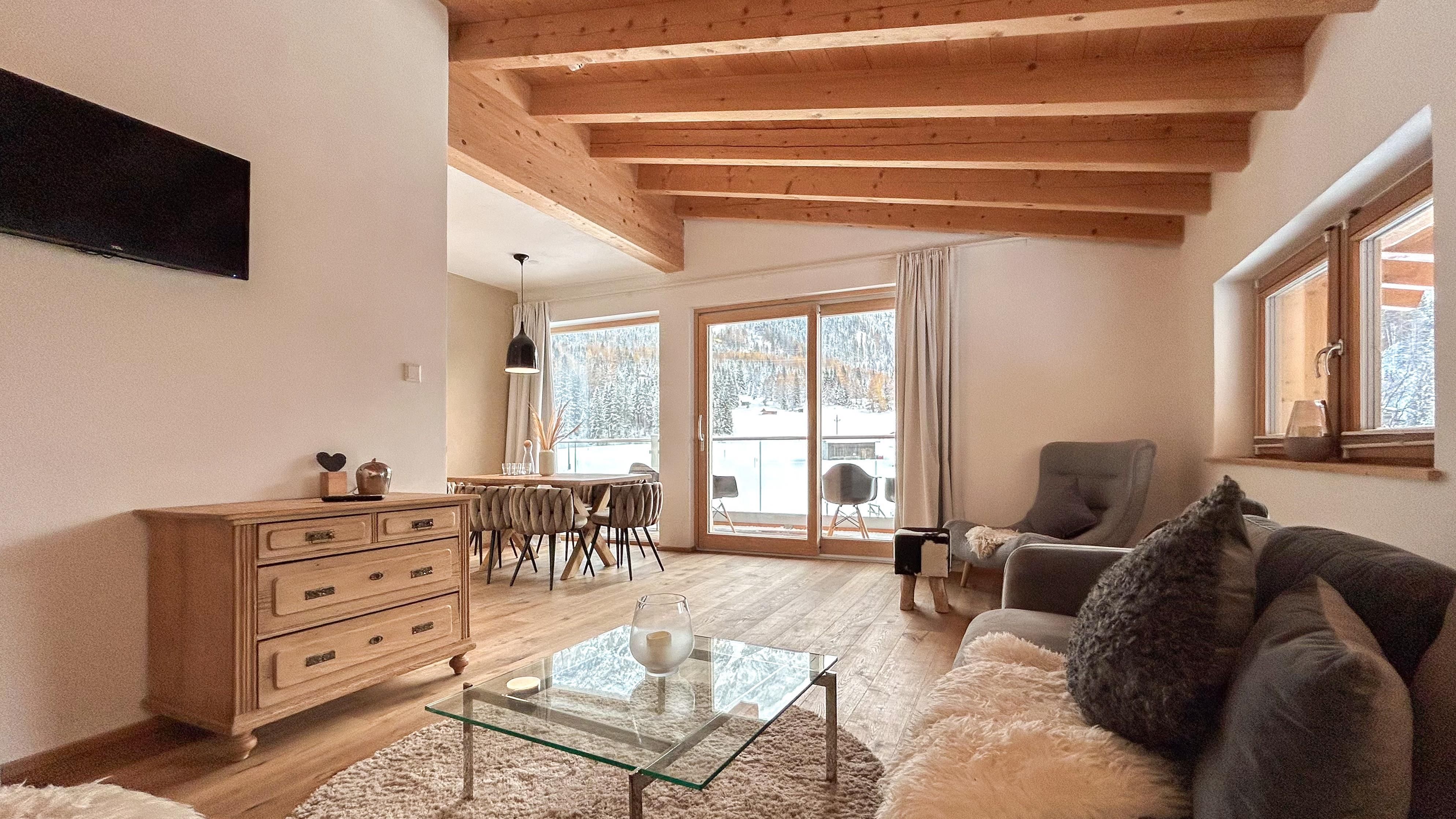 Familienfreundliches Apartment mit großem Schlafzimmer und eigenem Bad sowie zwei kleineren Schlafzimmern. Ein zusätzliches Bad mit WC und Dusche bietet extra Komfort. Der helle Wohn-Essbereich mit voll ausgestatteter Küche, Sofaecke und Esstisch öffnet sich zum Balkon mit herrlichem Bergpanorama. Perfekt für Familien, die Entspannung und alpine Erlebnisse kombinieren möchten.