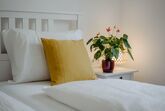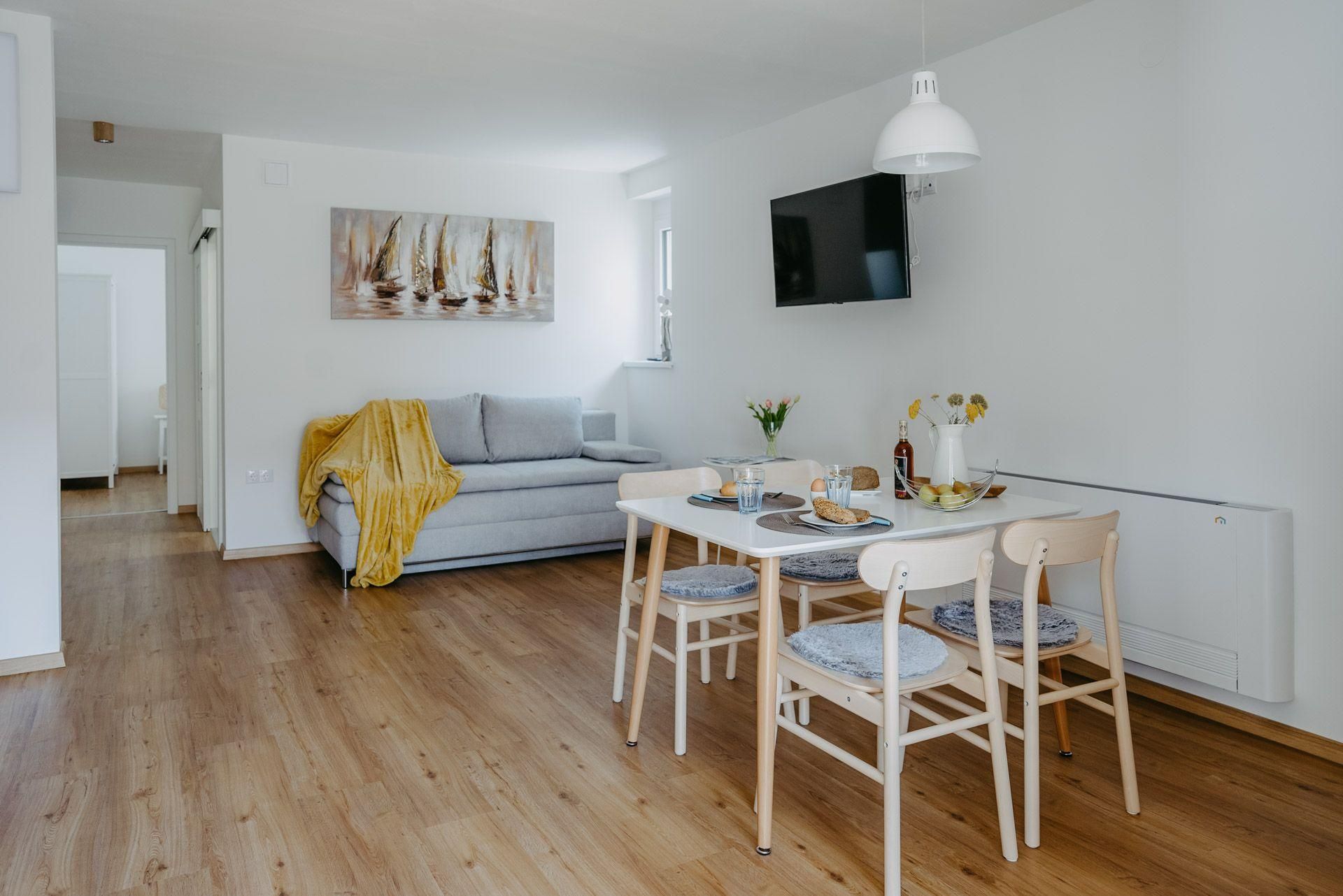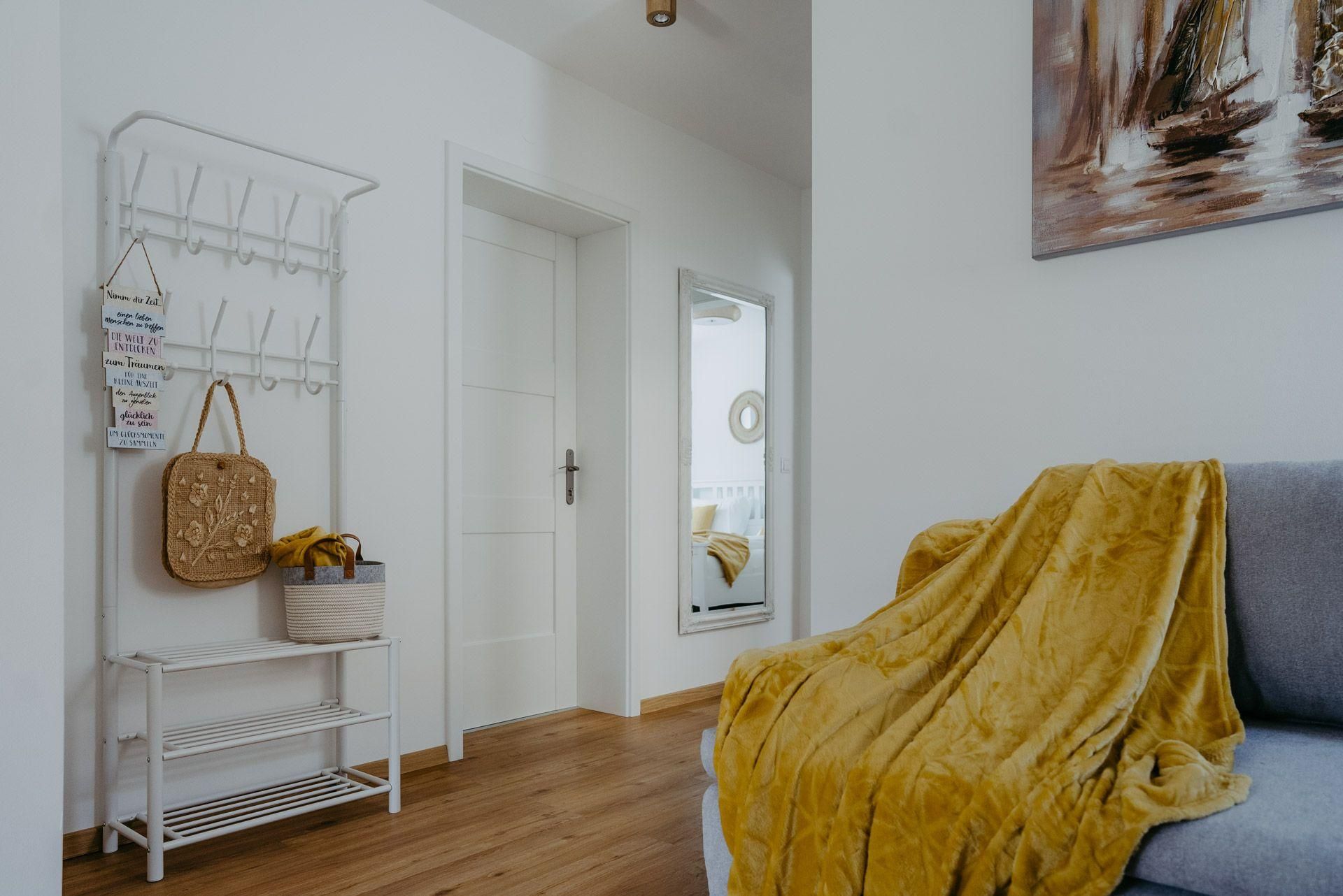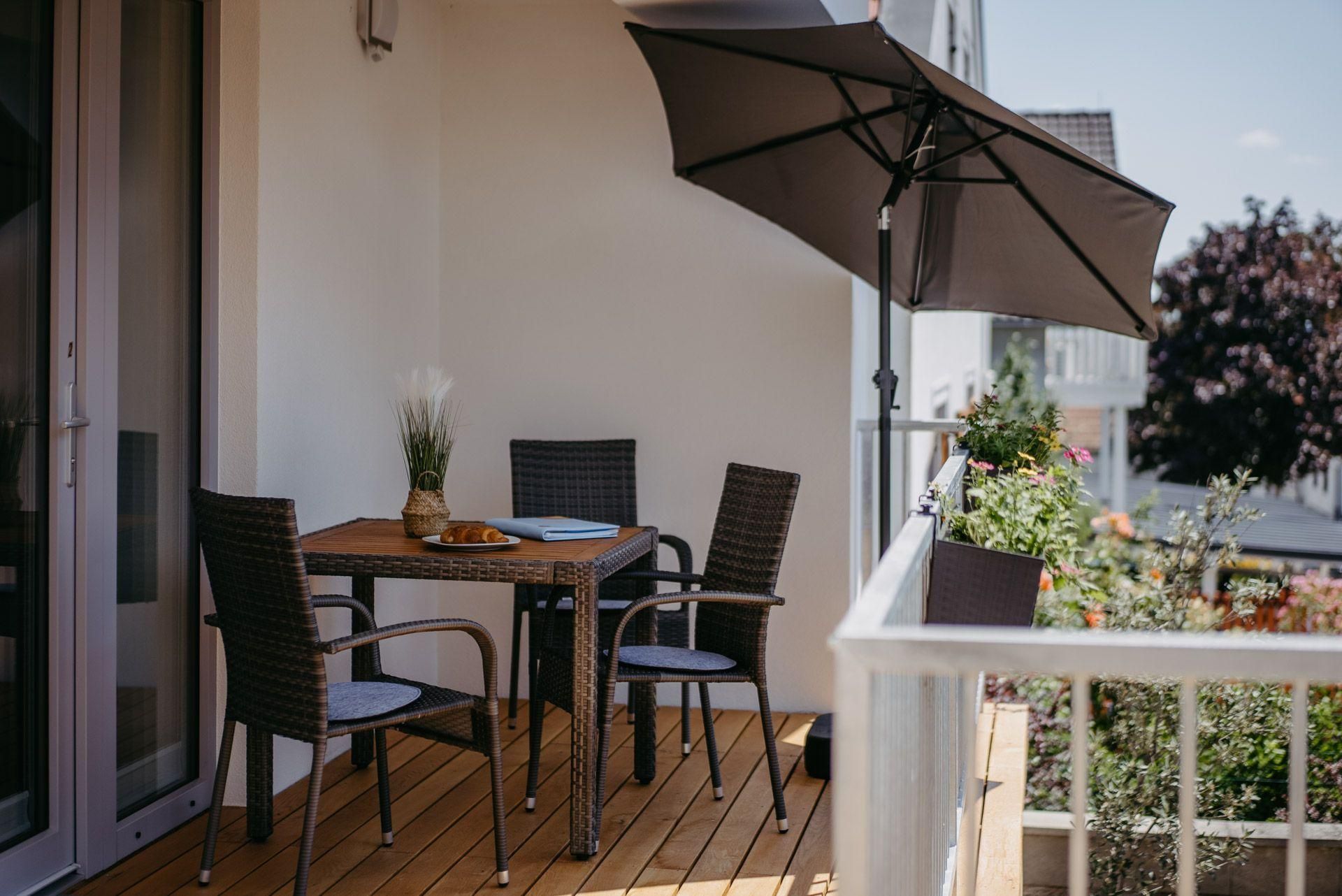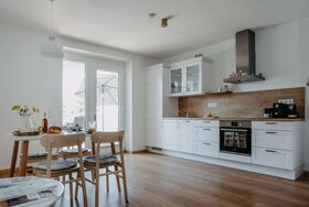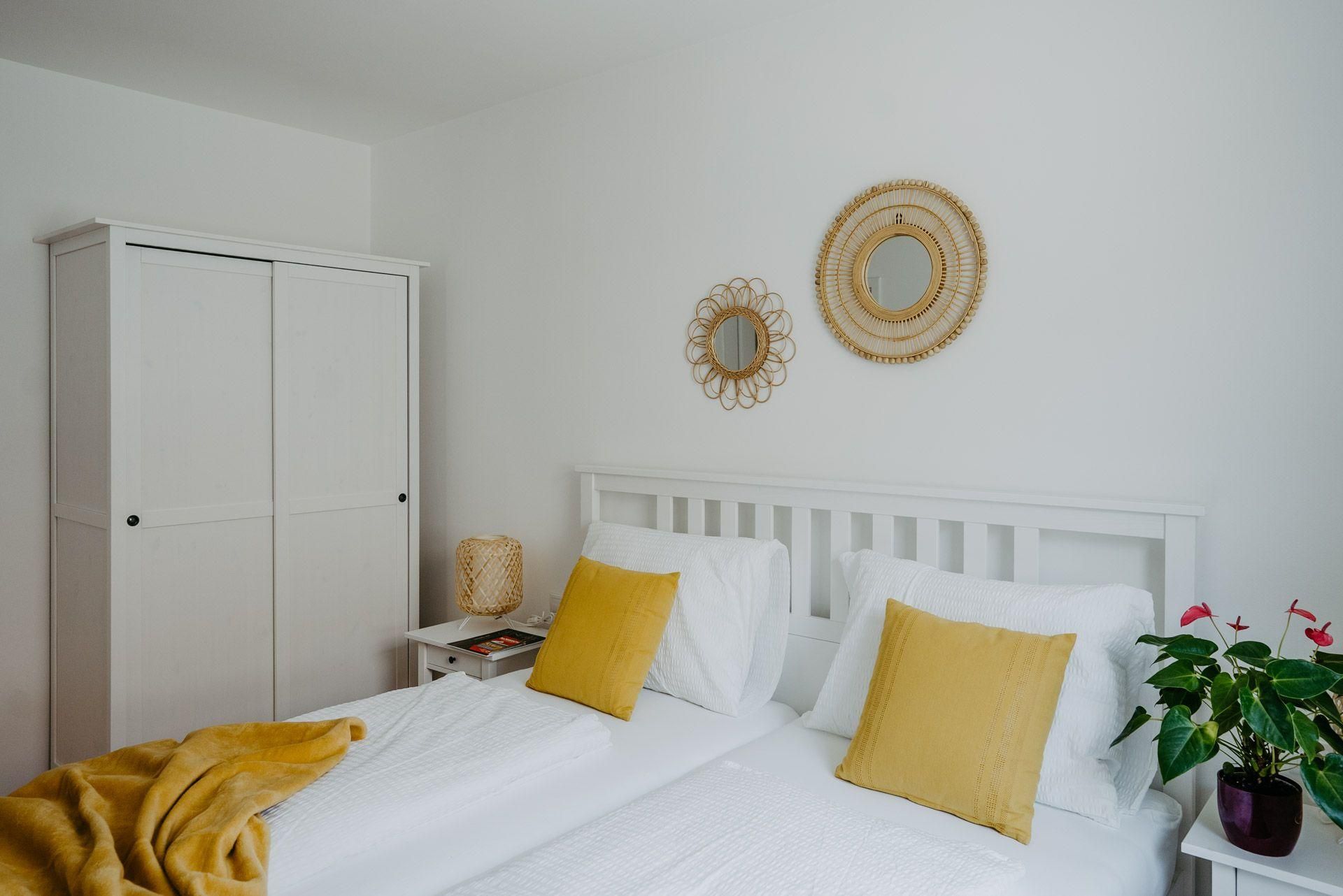 Im Inneren der Wohnung finden Gäste ein abdunkelbares Schlafzimmer, das Ruhe und Rückzug verspricht. Für ein Maximum an Wohlbefinden sorgt das Badezimmer mit seiner Wellness-Dusche und den Infrarotstrahlern. Die Klimaanlage in der gesamten Wohnung garantiert auch an heißen Tagen eine erfrischende Abkühlung. Für Selbstversorger ist die Küche bestens ausgestattet mit Cerankochfeld, Filter-Kaffeemaschine, Wasserkocher und Spülmaschine. Zusätzlich ist eine Waschmaschine für einen kleinen Aufpreis zur gemeinschaftlichen Nutzung verfügbar.
