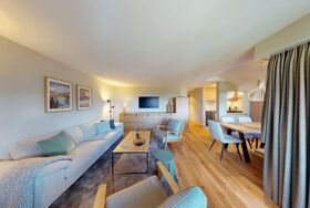 Die Wohnung verfügt über zwei komfortable Schlafzimmer: Zimmer 1 ist ausgestattet mit einem Doppelbett, perfekt für Paare oder Erwachsene. Zimmer 2 bietet zwei Etagenbetten, die Platz für mehrere Personen bieten und sich hervorragend für Kinder oder Jugendliche eignen. Zwei moderne Badezimmer sorgen dafür, dass ausreichend Raum und Komfort für alle Gäste vorhanden sind.