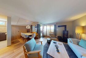 Die offene und gut ausgestattete Küche lädt dazu ein, gemeinsam zu kochen und gesellige Mahlzeiten zu genießen. Der einladende Wohnbereich bietet einen perfekten Ort zum Entspannen nach einem aufregenden Tag in den Bergen.