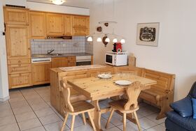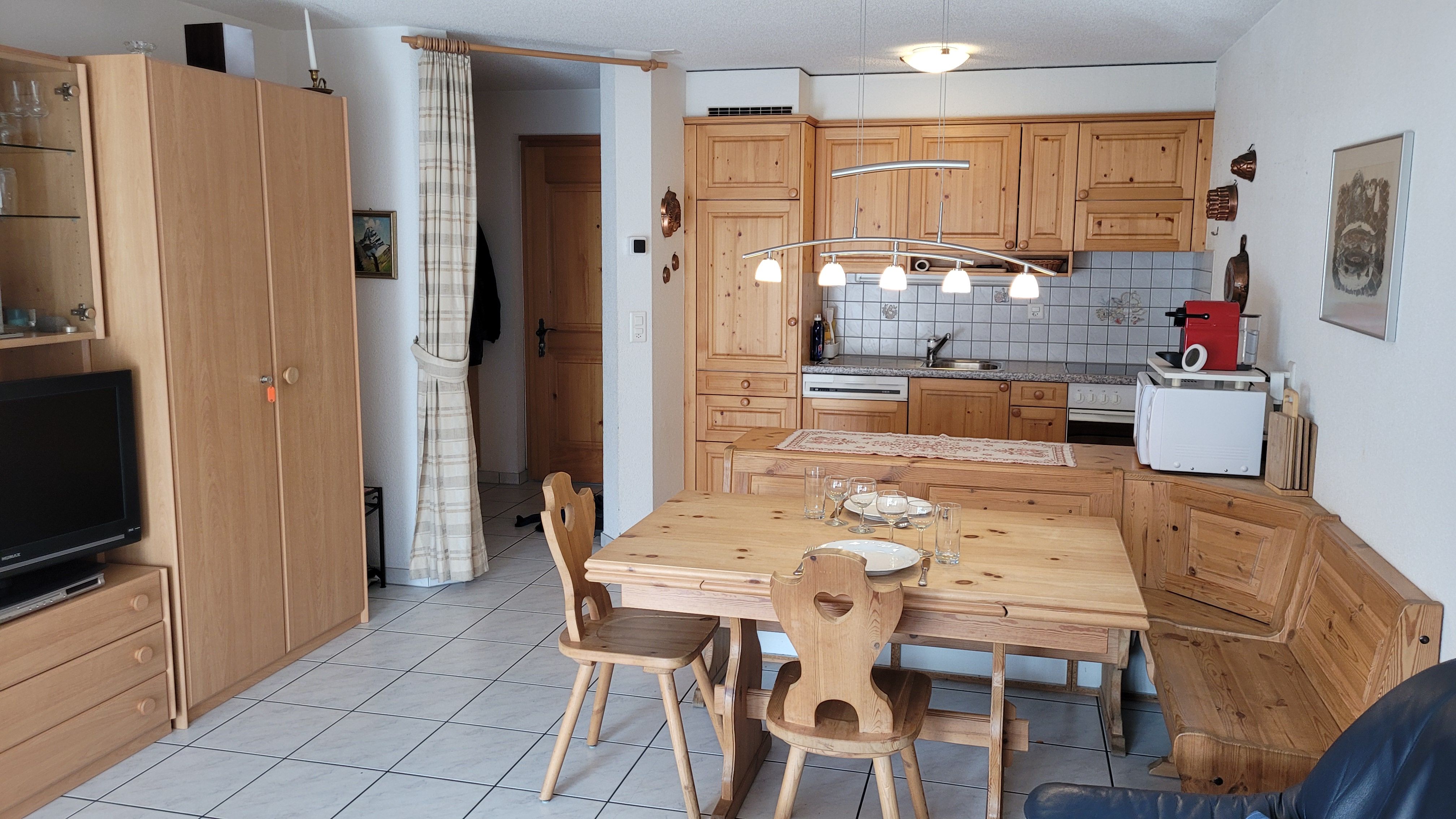 2-Zimmerwohnung mit 2 Betten und 2 Zusatzbetten. Separates Schlafzimmer mit Doppelbett, Wohn-/Essbereich mit zwei Schrankbetten. Zweckmässiger Esstisch mit Eckbank, gemütliches Sofa mit zusätzlichem Sessel. Ausserordentlich gut eingerichtete Küche mit allem für einen gelungenen Urlaub. Grosszügige Terrasse mit herrlichem Blick aufs Weisshorn. Top zentrale Lage; 2 min entfernt von Postautohaltestelle, diversen Einkaufsmöglichkeiten, mehreren Restaurants, Tourismusbüro, Kirche und Bergbahn.