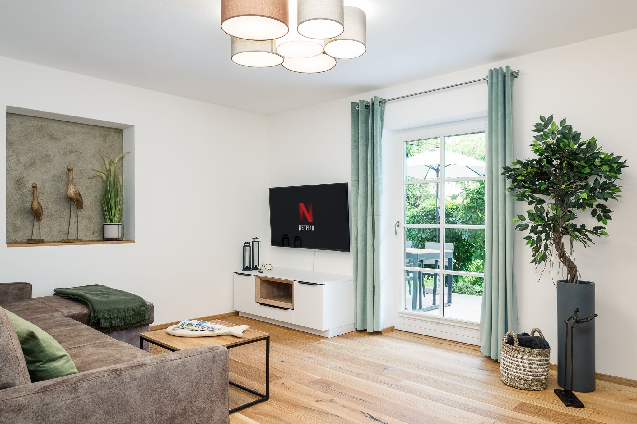 Entspann Dich im Wohnzimmer mit gemütlichem Ambiente, das mit einem 55-Zoll-Smart-TV inkl. NETFLIX und Internet-TV in UHD-Qualität ausgestattet ist. Genieße Deine Lieblingssendungen und Filme in bester Bildqualität.