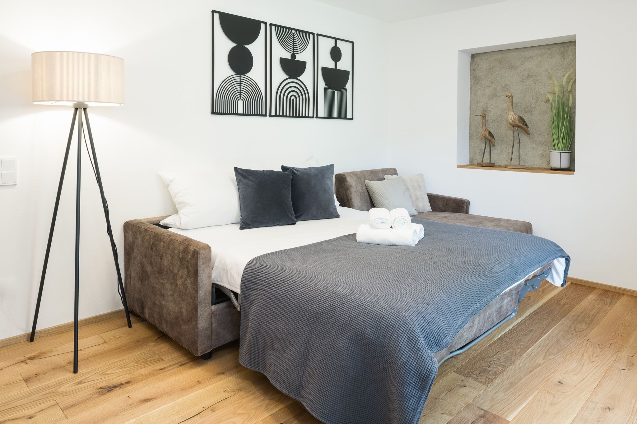 Damit Dein Schlaf erstklassig ist, wartet auf Dich im Schlafzimmer ein gemütliches Boxspring Doppelbett mit Bettwaren auf Hotelniveau. Des Weiteren wurde bei dem Schlafsofa eine hochwertige Ausführung mit extra Schlaffunktion gewählt.