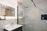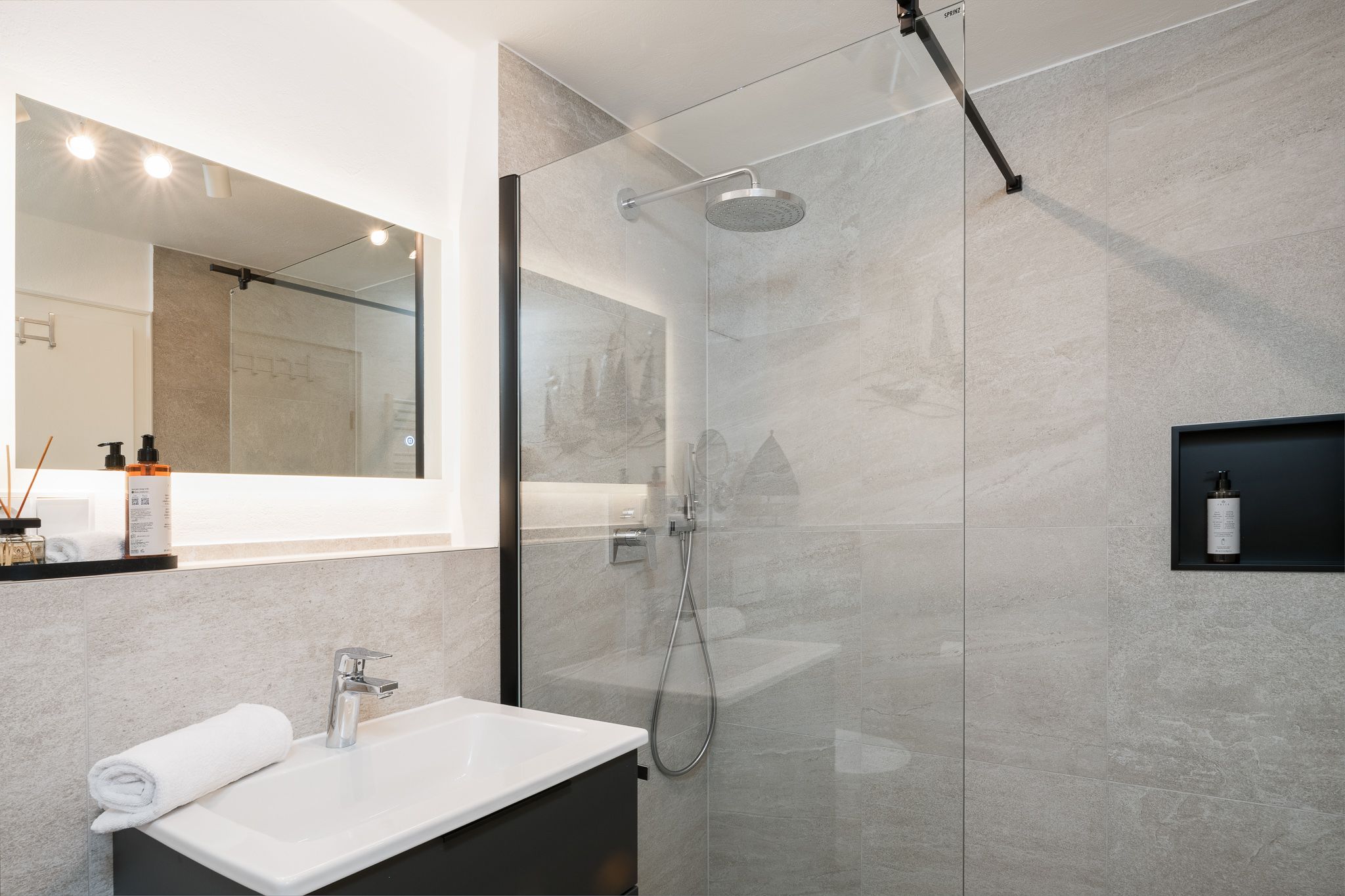 Genieße nach einem erlebnisreichen Tag pure Erfrischung in der hochwertigen, begehbaren Dusche unseres stilvollen Badezimmers.