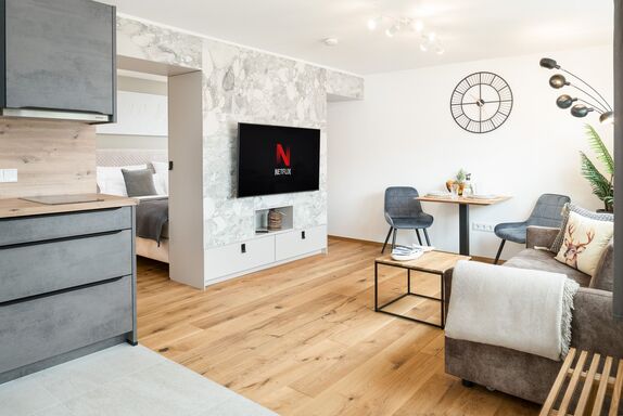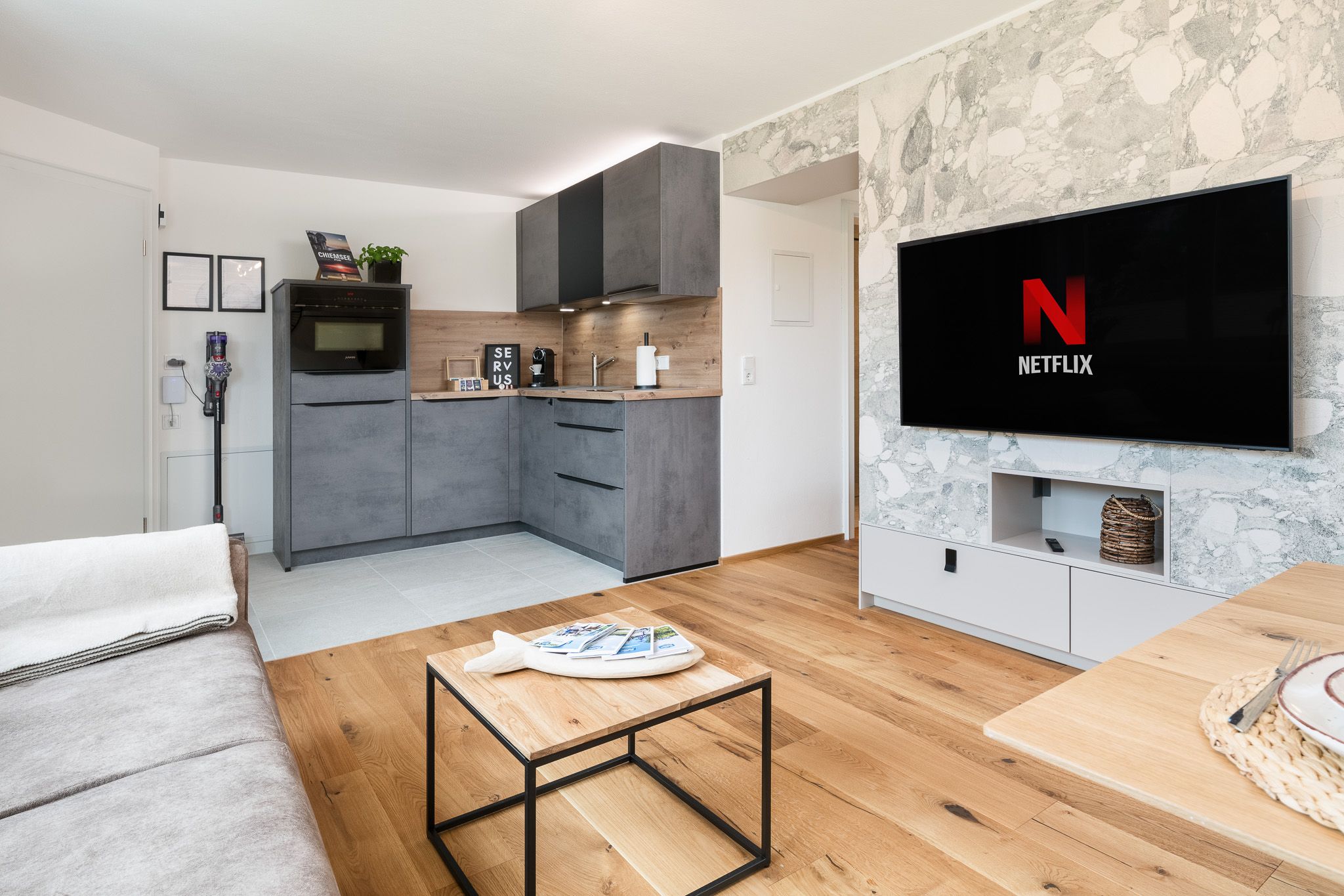 Entspann Dich im Wohnbereich mit gemütlichem Ambiente, das mit einem 55-Zoll-Smart-TV inkl. NETFLIX und Internet-TV in UHD-Qualität ausgestattet ist. Genieße Deine Lieblingssendungen und Filme in bester Bildqualität.