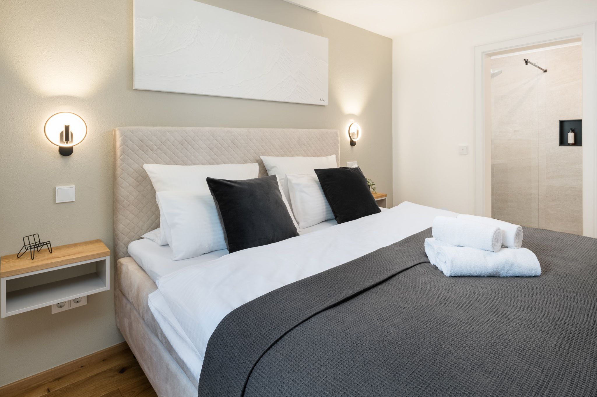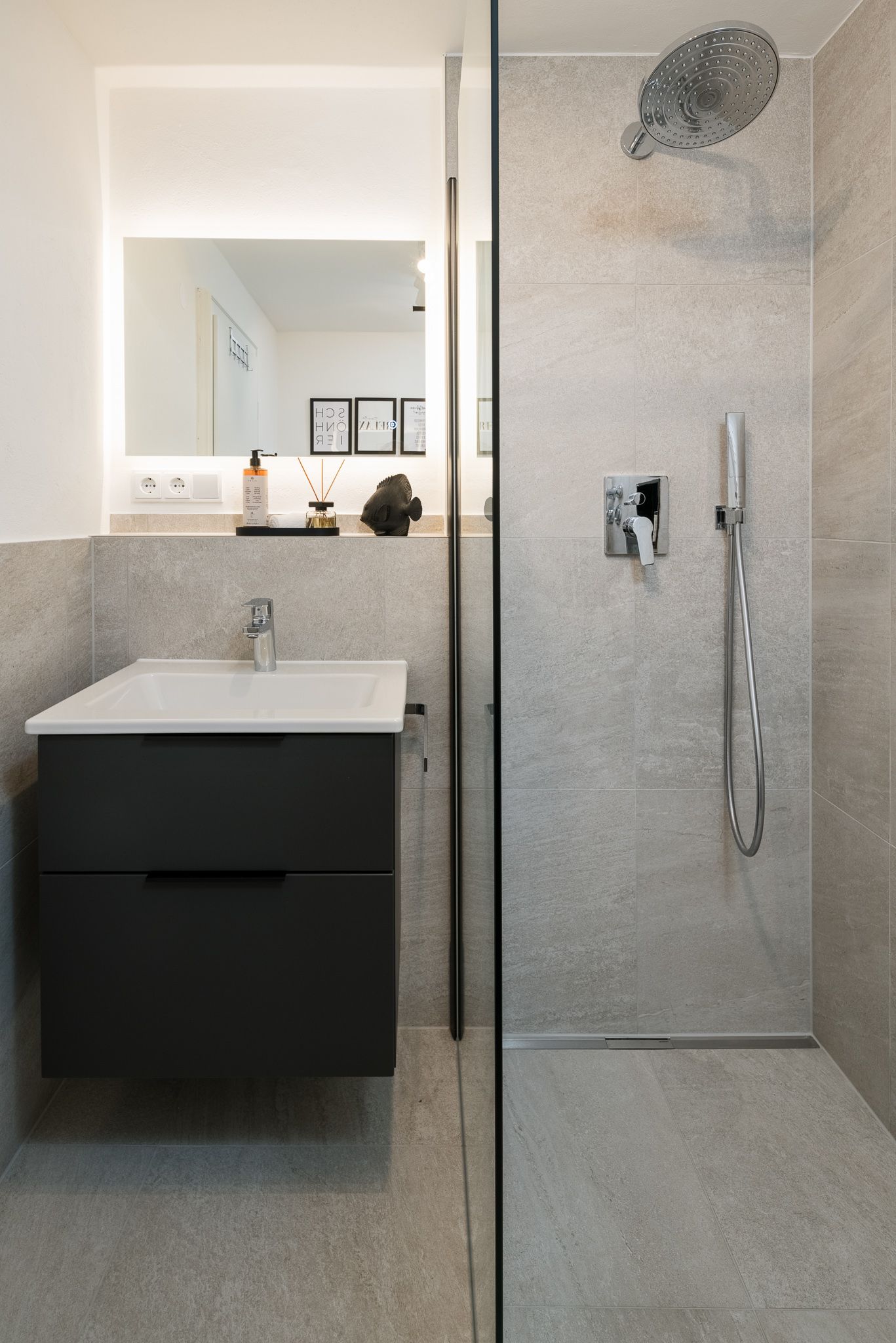 Genieße nach einem erlebnisreichen Tag pure Erfrischung in der hochwertigen, begehbaren Dusche unseres stilvollen Badezimmers.